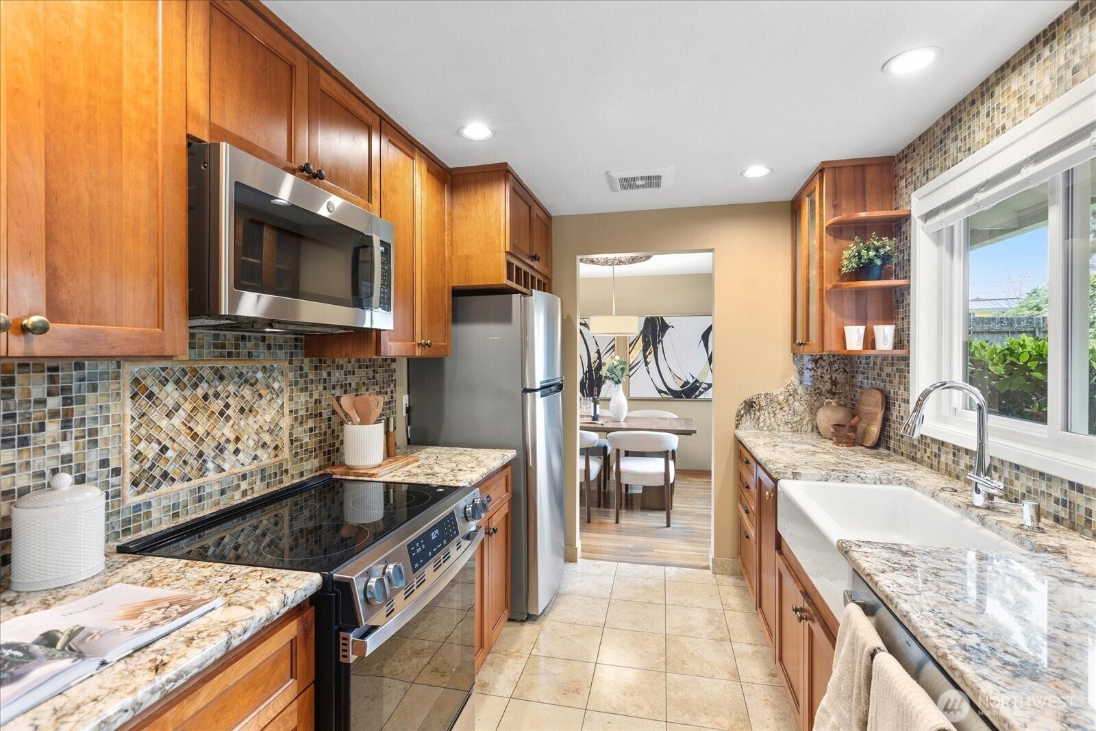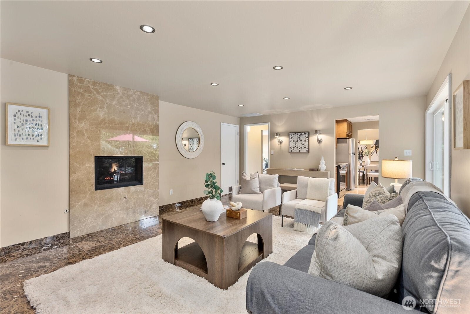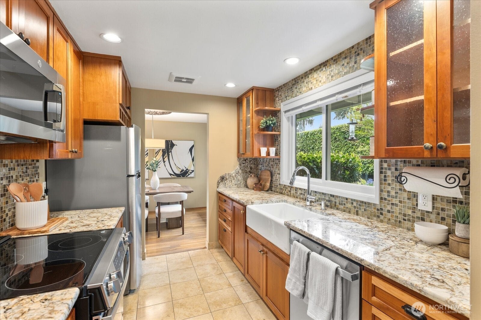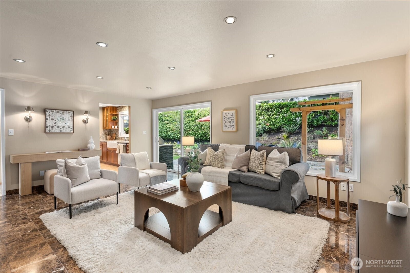 Located in Bellevues sought-after Lake Hills neighborhood, this beautifully maintained move-in ready rambler combines timeless character with thoughtful modern updates. Southern exposure provides abundant natural light and fills the interior through large windows, highlighting elegant natural stone, marble and hardwood floors.