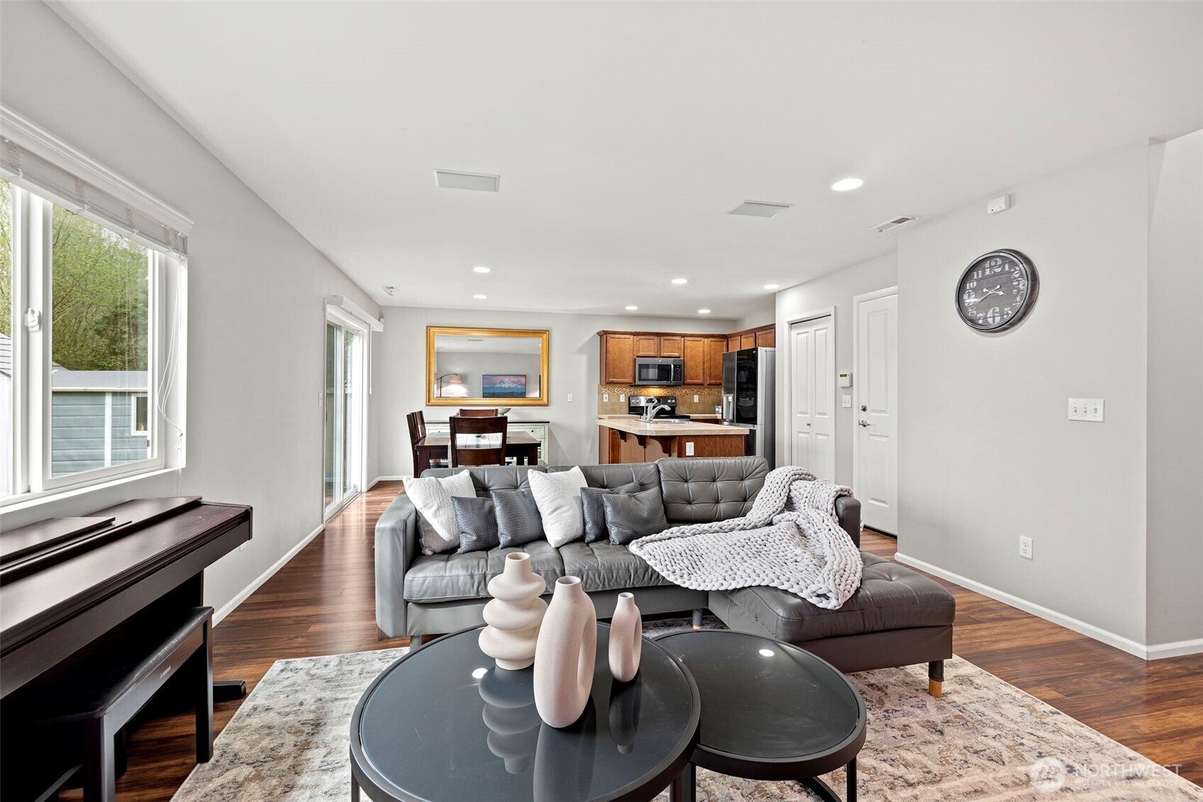 Beautifully maintained EAST-FACING home in a highly desirable neighborhood North Creek, an ideal starter home in the Laurelcrest community by D.R. Horton. The light-filled interior is enhanced by its east-facing orientation. Step outside to enjoy a unique blend of openness and privacy. A large HOA-maintained yard sits right next to the home, providing additional green space without the maintenance. Beyond the backyard lies a tranquil greenbelt, offering peaceful views and enhanced privacy—rare features at this price point. The home is equipped with modern conveniences including in-wall CAT5 wiring and built-in speakers, providing enhanced connectivity and a seamless lifestyle experience—perfect for today’s work-from-home needs and entertainment. Stay comfortable year-round with central AC, ensuring a pleasant indoor environment in every season. Also this home offers a spacious, level, fully fenced backyard for outdoor entertainment with garden beds where you can grow your own plants. One of the standout features of this home is its exceptional setting. Located just a few blocks from North Creek High School within the highly sought-after Northshore School District. Conveniently located near shopping, dining, and major commuting routes, Laurelcrest residents enjoy access to 1.5-acre community park, athletic court and pea patch. Do not miss this home with perfect balance of natural serenity, community and convenience in a prime Bothell location. Pre-inspected for peace of mind.