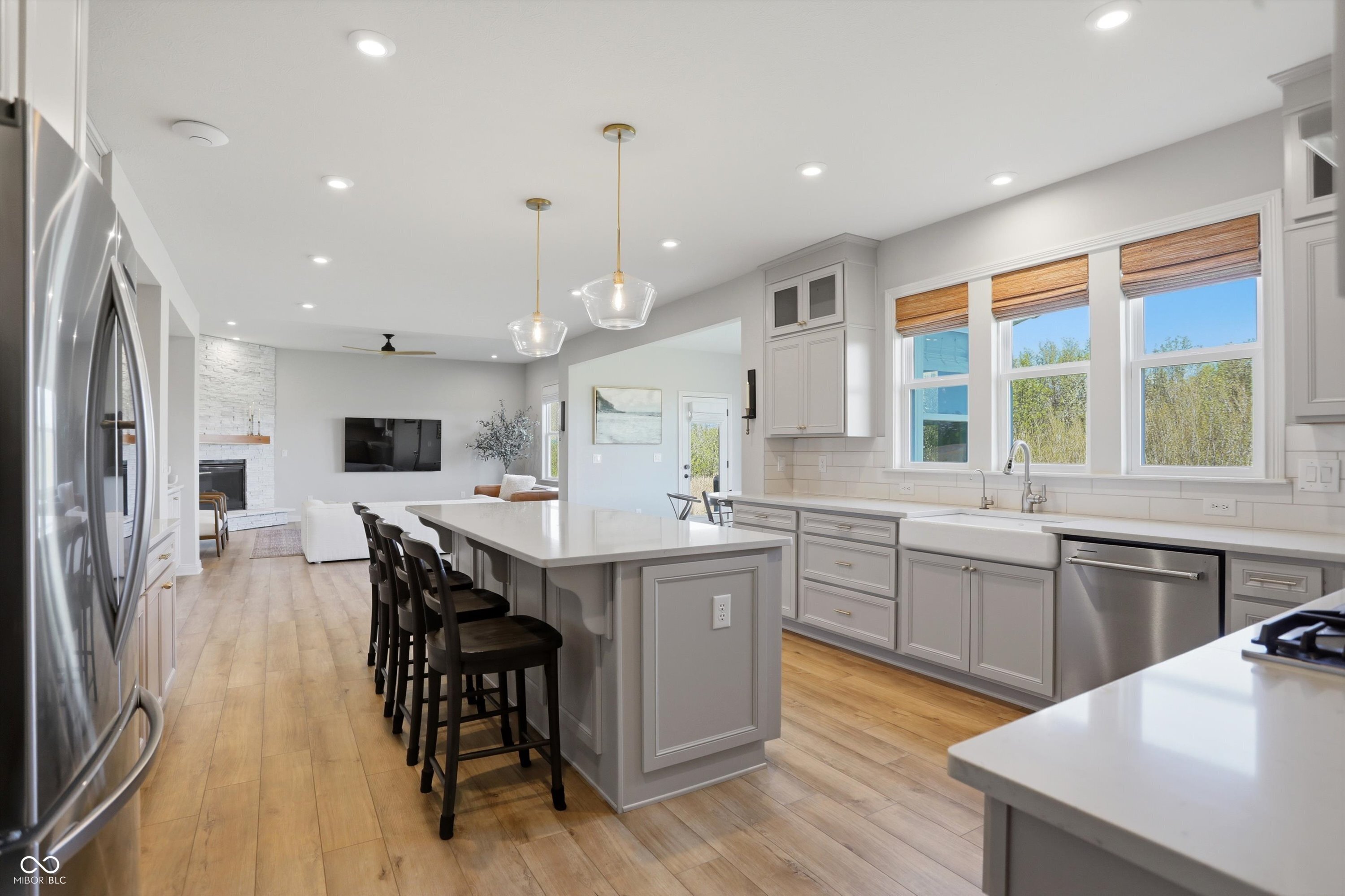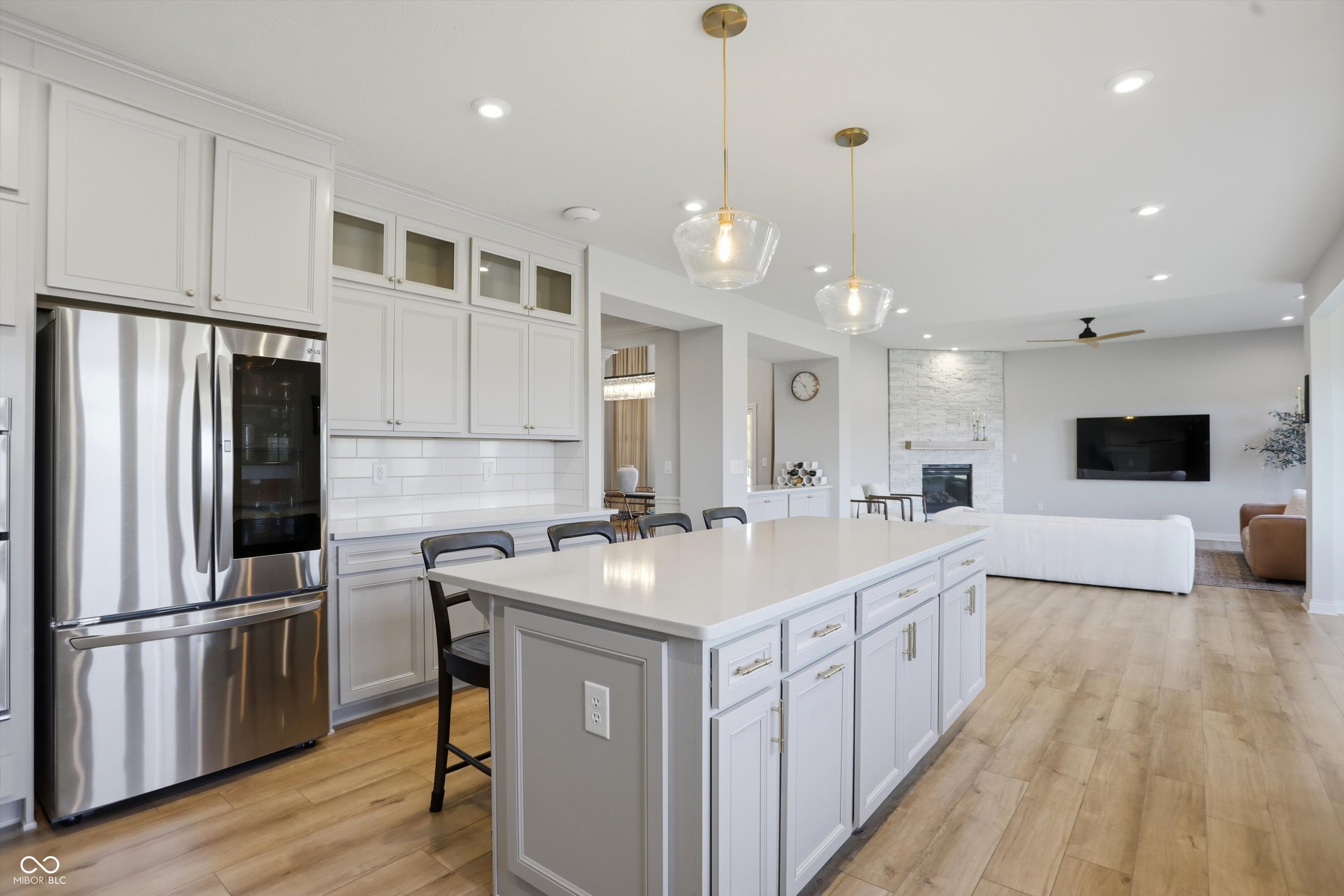 Prestigious West Carmel luxurious single-family home, showcasing amazing design and top-tier materials. Great Room features an inviting atmosphere, centered around a cozy stone fireplace exuding warmth. Culinary endeavors are elevated in the Kitchen, featuring a stylish backsplash, gold light fixtures and hardware and kitchen island, all adorned with exquisite stone countertops.