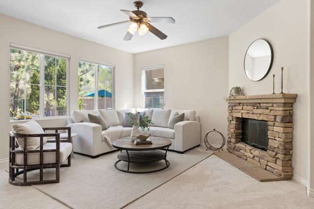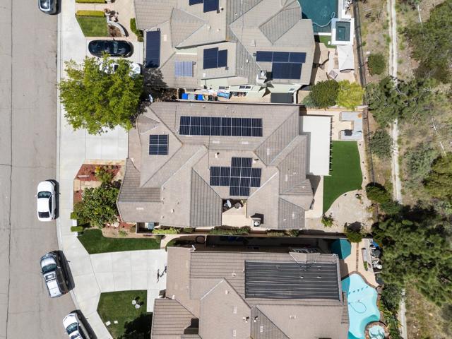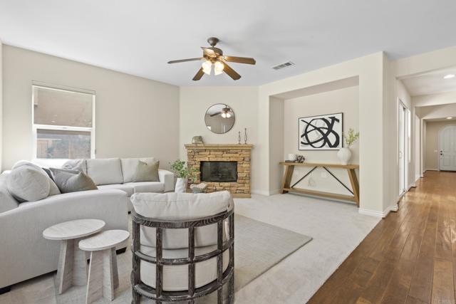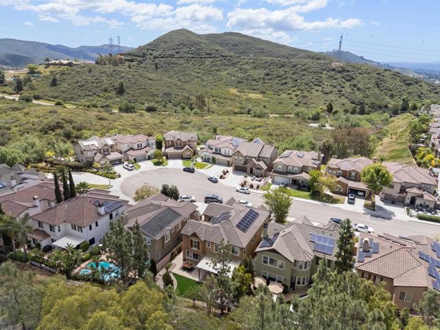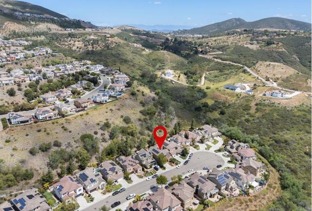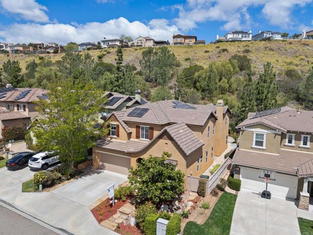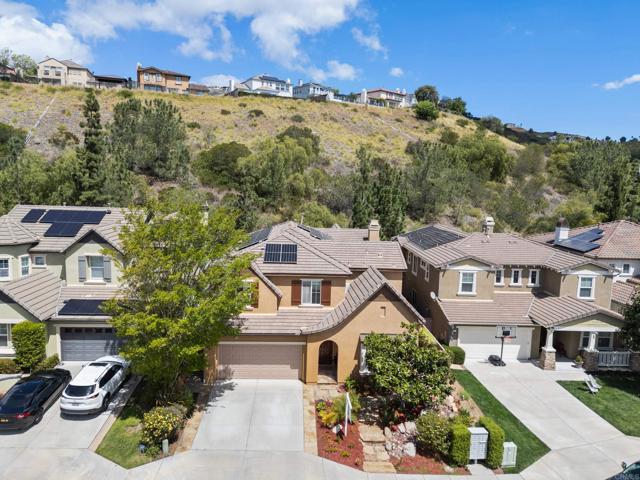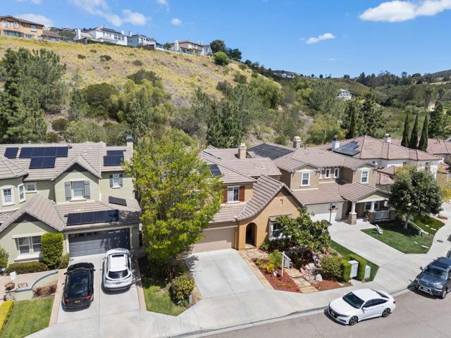 Stunning home on a quiet cul-de-sac in the highly sought-after Venzano community of San Elijo Hills! Offering 3,411 square feet, 5 bedrooms loft (easily converted to a bedroom) and 4 full bathrooms (including a main-level bedroom and bathroom), this beautiful home features fresh interior paint, hardwood floors in main living areas, and brand-new carpet in bedrooms, living room, family room, and upstairs. The gourmet kitchen showcases granite countertops, a large center island, stainless steel appliances, and a built-in KitchenAid refrigerator, opening to spacious living areas ideal for everyday living and entertaining. The expansive primary suite offers a luxurious bathroom with a relaxing jacuzzi tub and large dual walk-in closets. Upstairs also features a convenient Jack-and-Jill bathroom. Enjoy OWNED, paid-off solar for efficiency and savings. Step outside to a private backyard with no neighbors behind, peaceful greenbelt views, low-maintenance landscaping, a covered patio, built-in BBQ with fridge, and outdoor TV—perfect for year-round gatherings—plus a cozy side courtyard. Additional highlights include dual A/C, a stone fireplace, washer and dryer included, sink in laundry room, and a 3-car tandem garage. Located near 18 acres of scenic trails, top-rated schools, 19 acre park, and the nearby San Elijo Hills Town Center. A true must-see!
