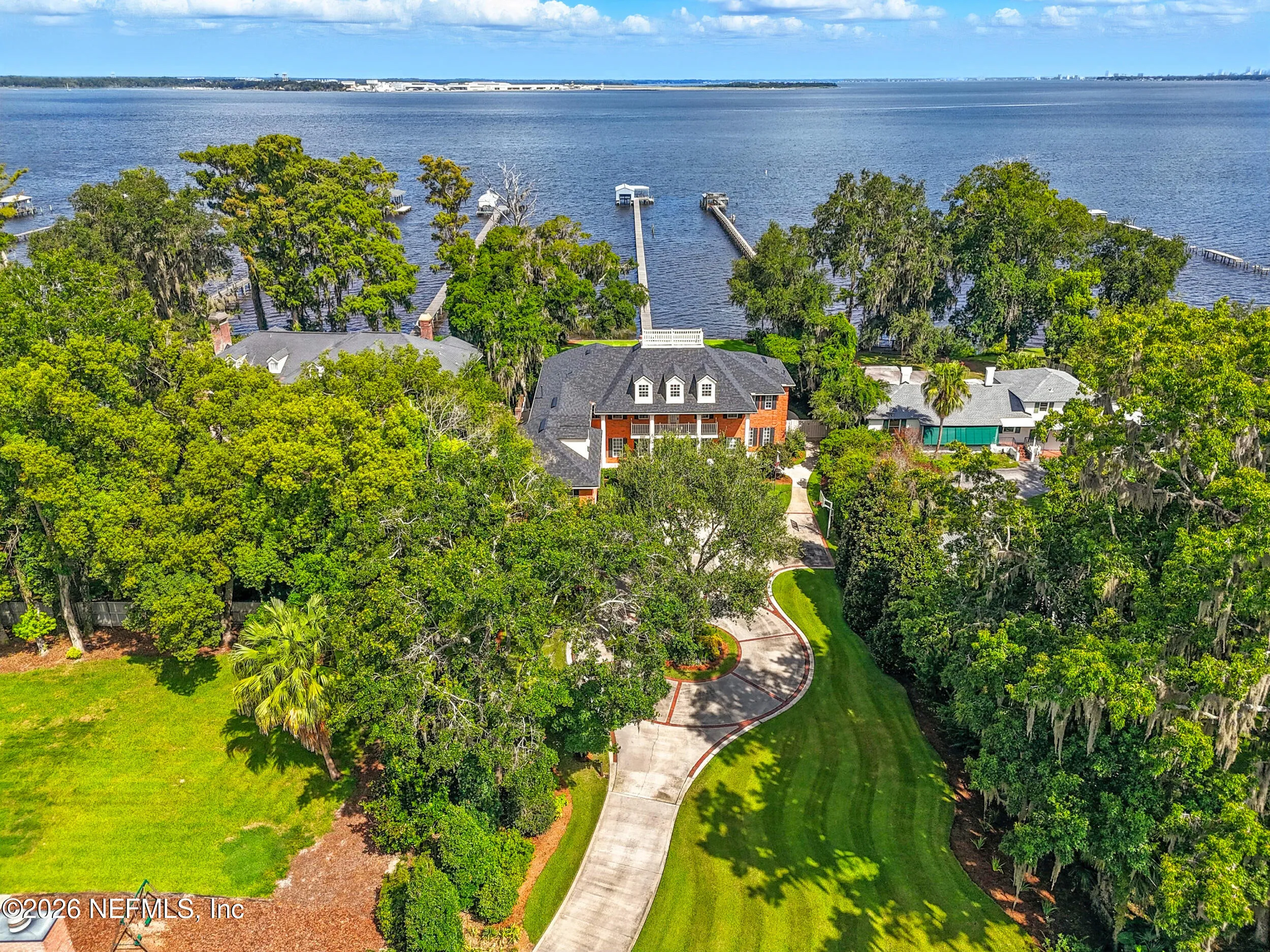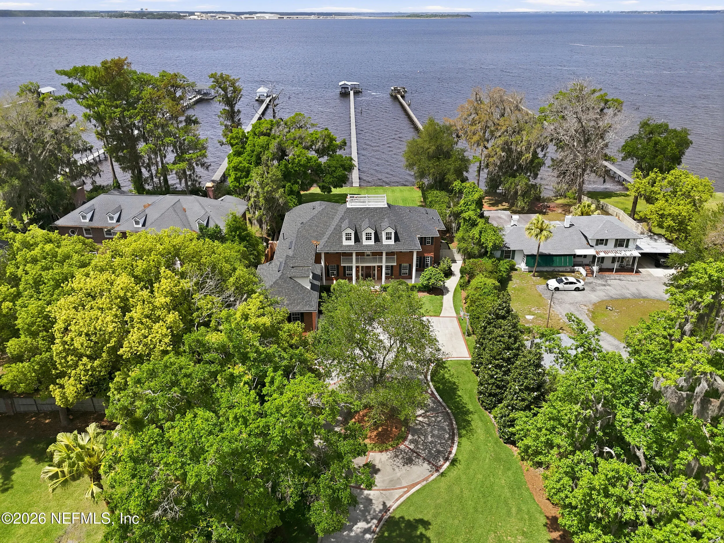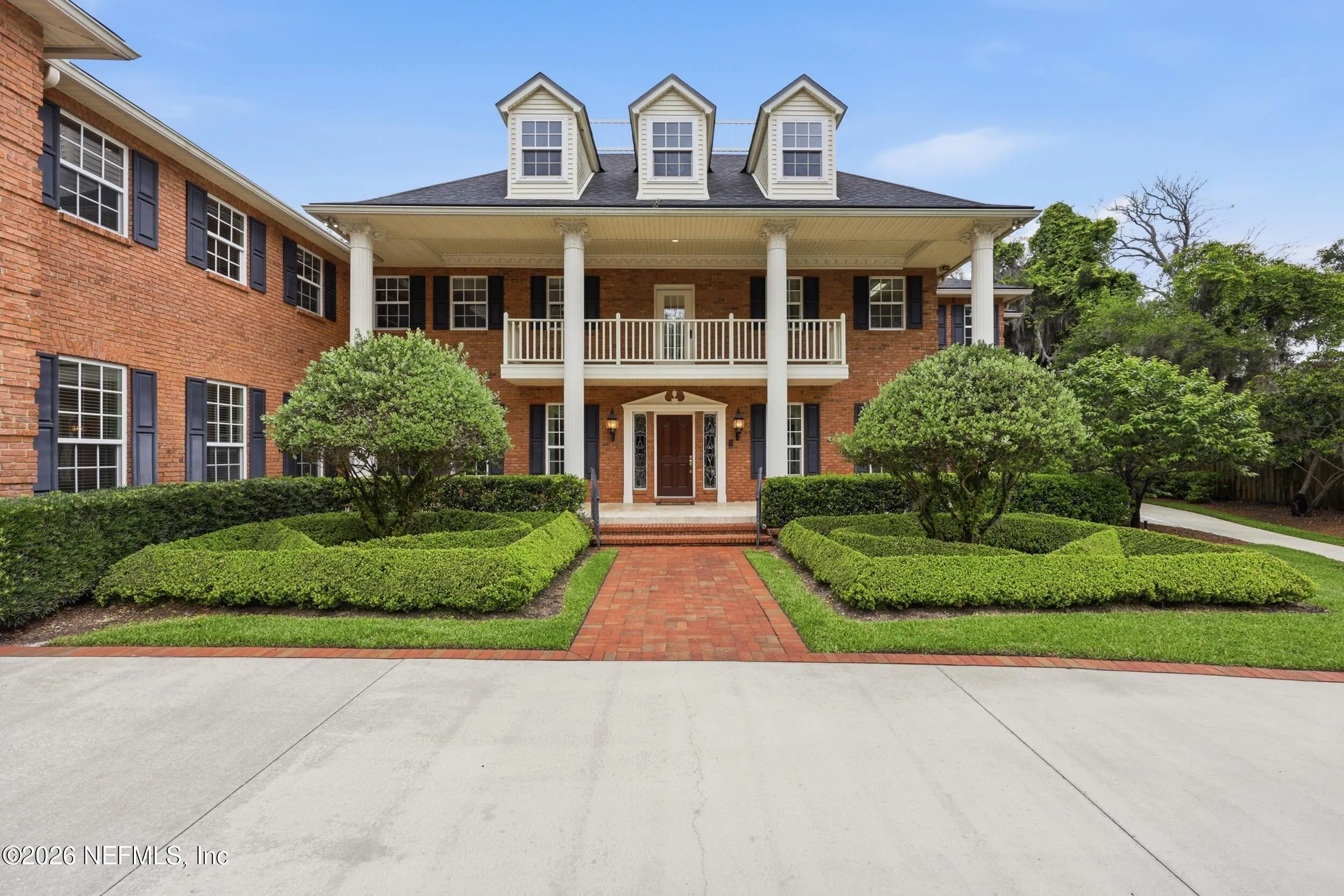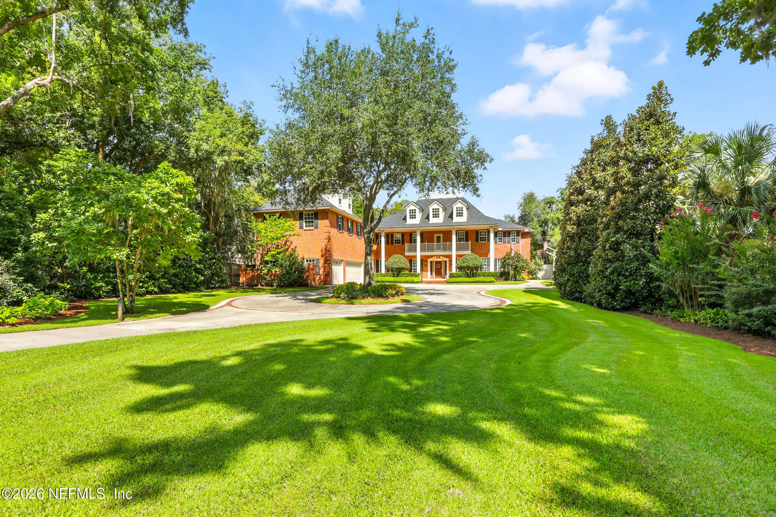 Custom-built in 1983 for a well-known local builder, this magnificent all-brick riverfront estate blends timeless design with exceptional craftsmanship. A grand presentation staircase welcomes you into this two-story traditional home, where a balcony overlooks the manicured front lawn. The open first floor offers formal living and dining rooms, a private office, and a spacious family room with soaring ceilings and a dramatic wall of windows showcasing the pool and St. Johns River. Situated on a pristine 1 acre lot with 100 of river frontage, enjoy a concrete bulkhead, dock, and rare grandfathered enclosed boathouse. The second-floor primary suite features a fireplace, stunning river views, spa-like bath, and oversized closet. With 4 bedrooms, bonus room with wet bar and bath, 3 staircases, and a sun porch off the kitchen 3 car garage, this lovingly maintained home is a rare find on desirable and beautiful Forest Circle.