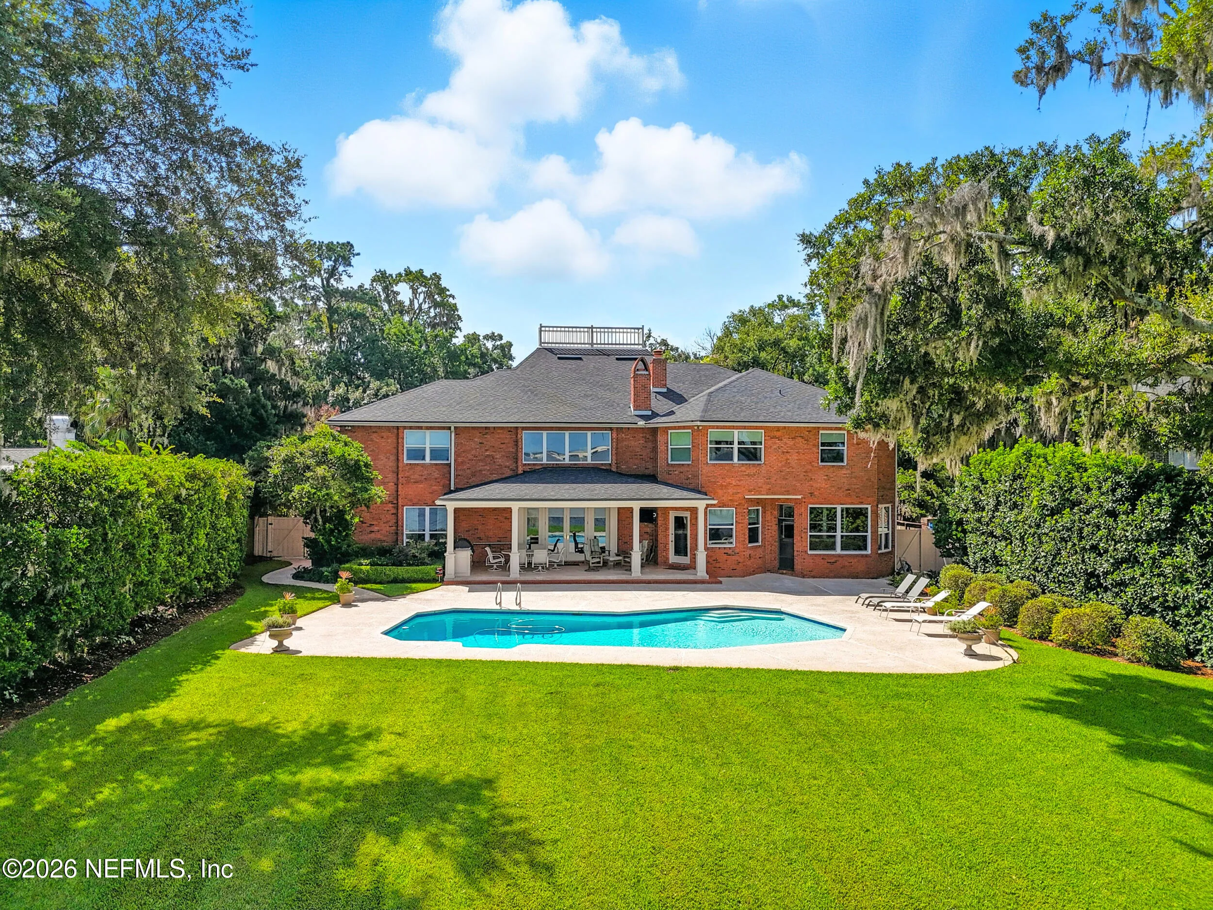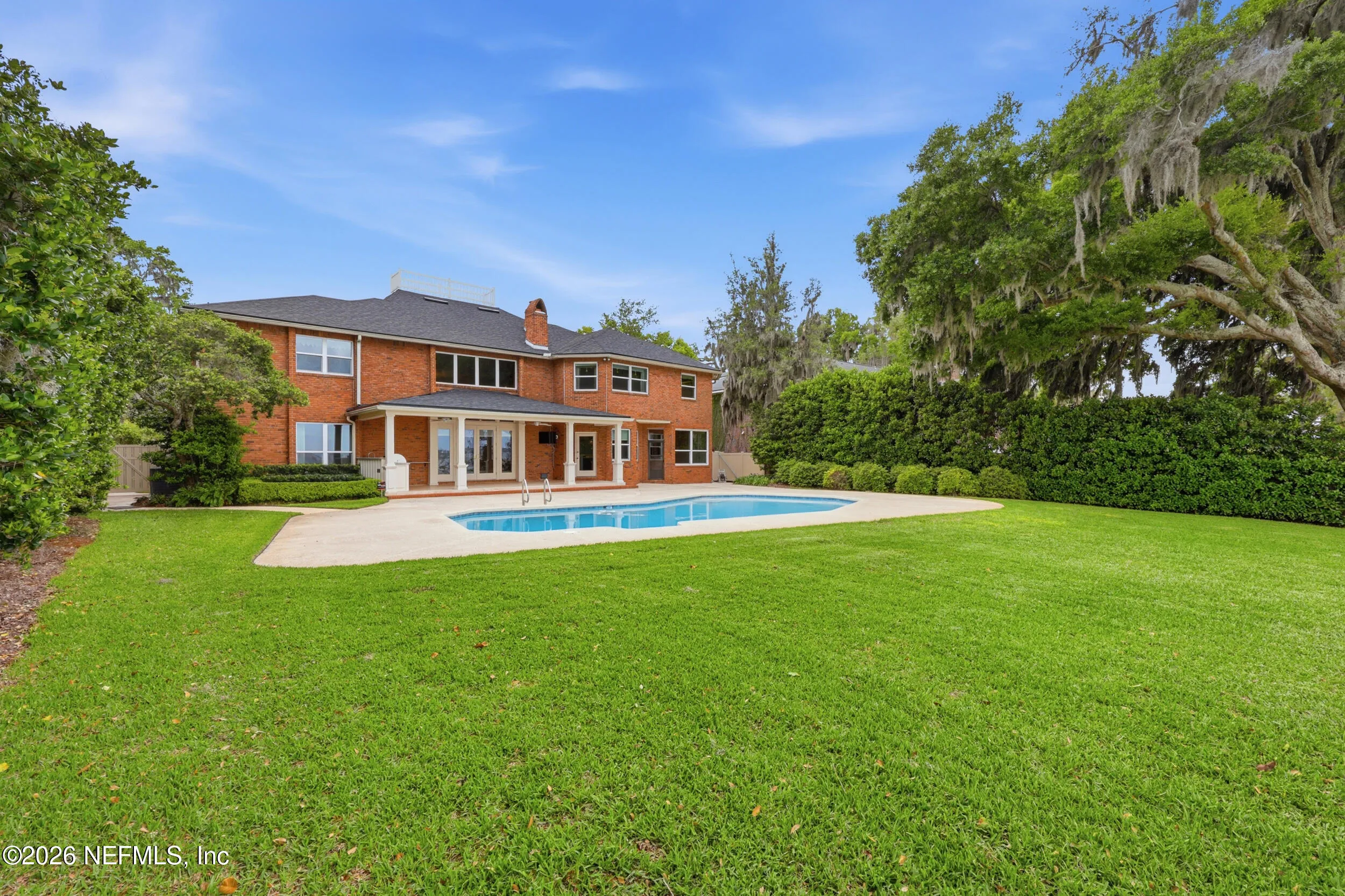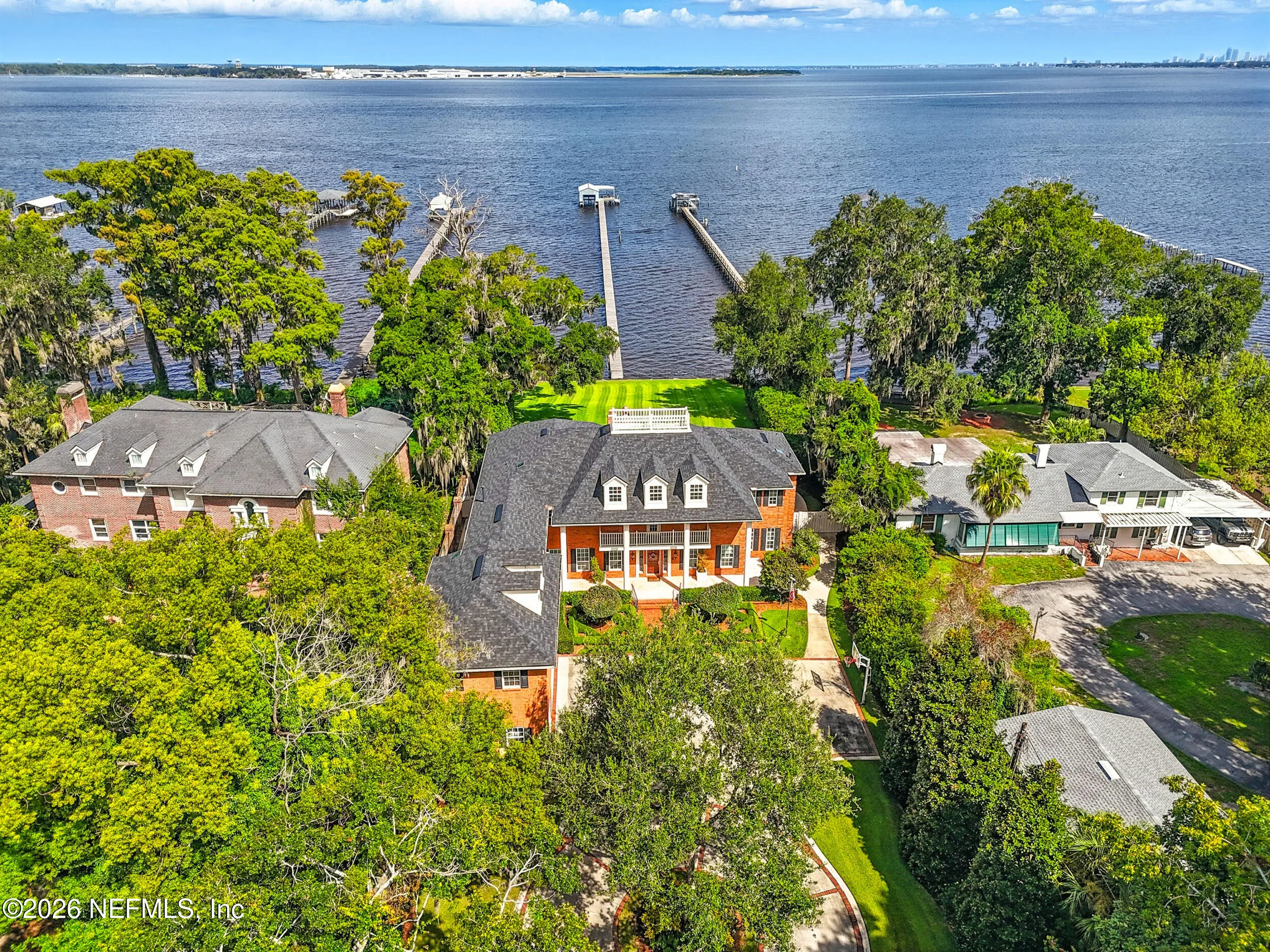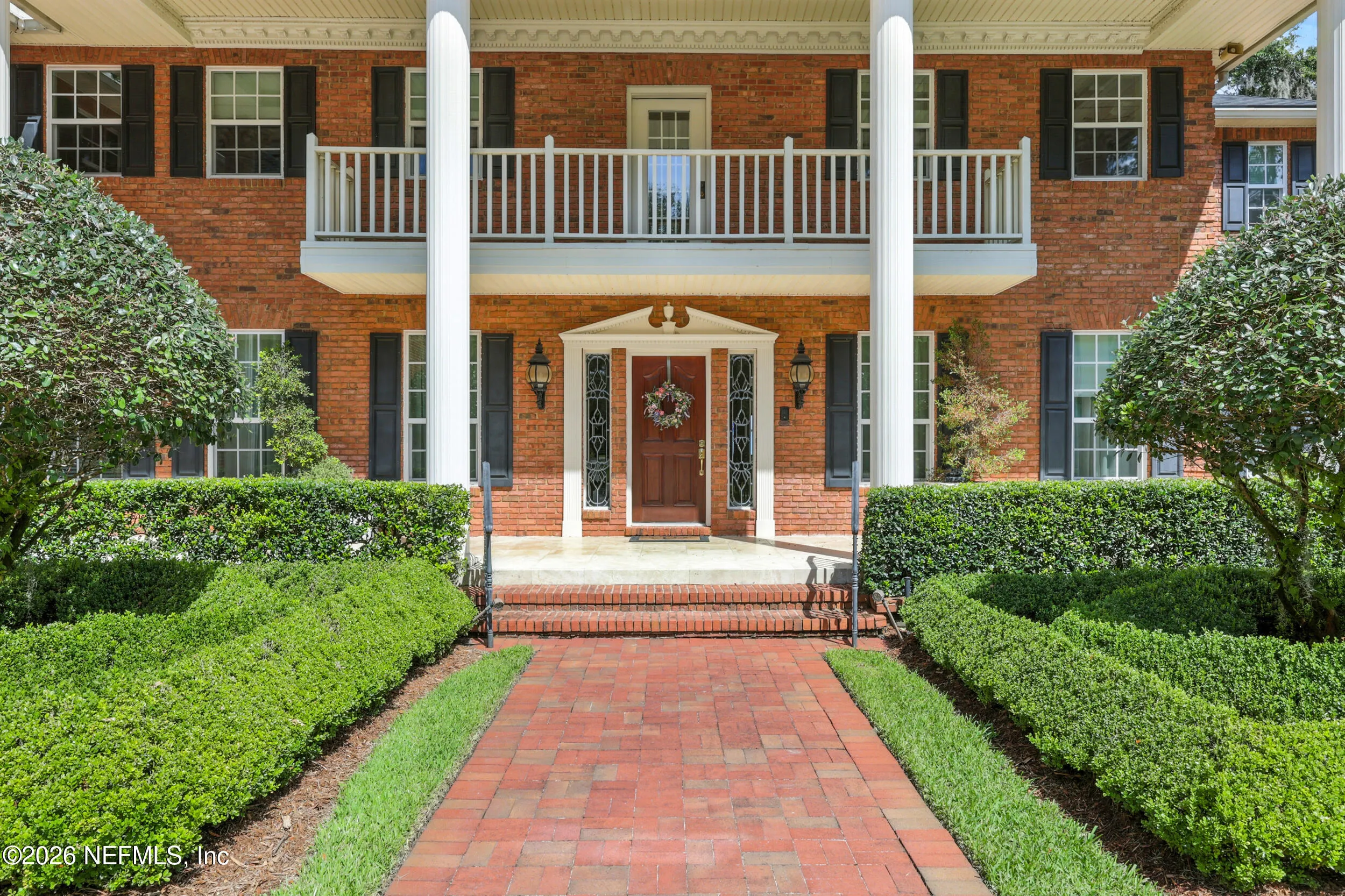 Custom-built in 1983 for a well-known local builder, this magnificent all-brick riverfront estate blends timeless design with exceptional craftsmanship. A grand presentation staircase welcomes you into this two-story traditional home, where a balcony overlooks the manicured front lawn. The open first floor offers formal living and dining rooms, a private office, and a spacious family room with soaring ceilings and a dramatic wall of windows showcasing the pool and St. Johns River. Situated on a pristine 1 acre lot with 100 of river frontage, enjoy a concrete bulkhead, dock, and rare grandfathered enclosed boathouse. The second-floor primary suite features a fireplace, stunning river views, spa-like bath, and oversized closet. With 4 bedrooms, bonus room with wet bar and bath, 3 staircases, and a sun porch off the kitchen 3 car garage, this lovingly maintained home is a rare find on desirable and beautiful Forest Circle.