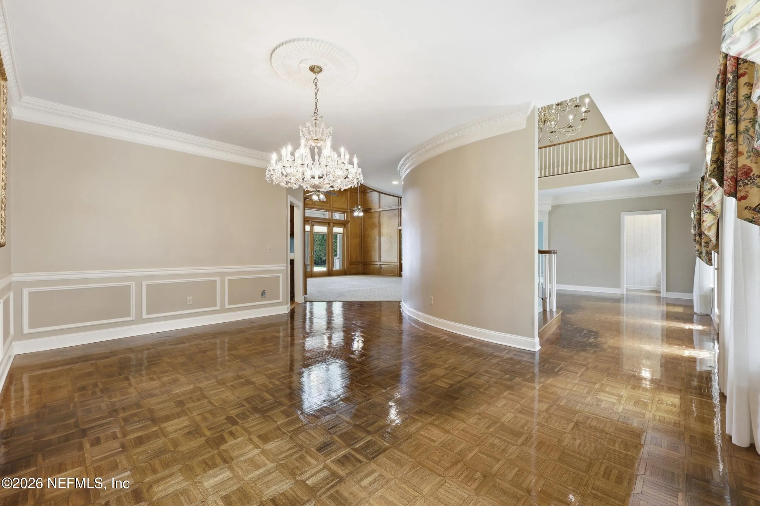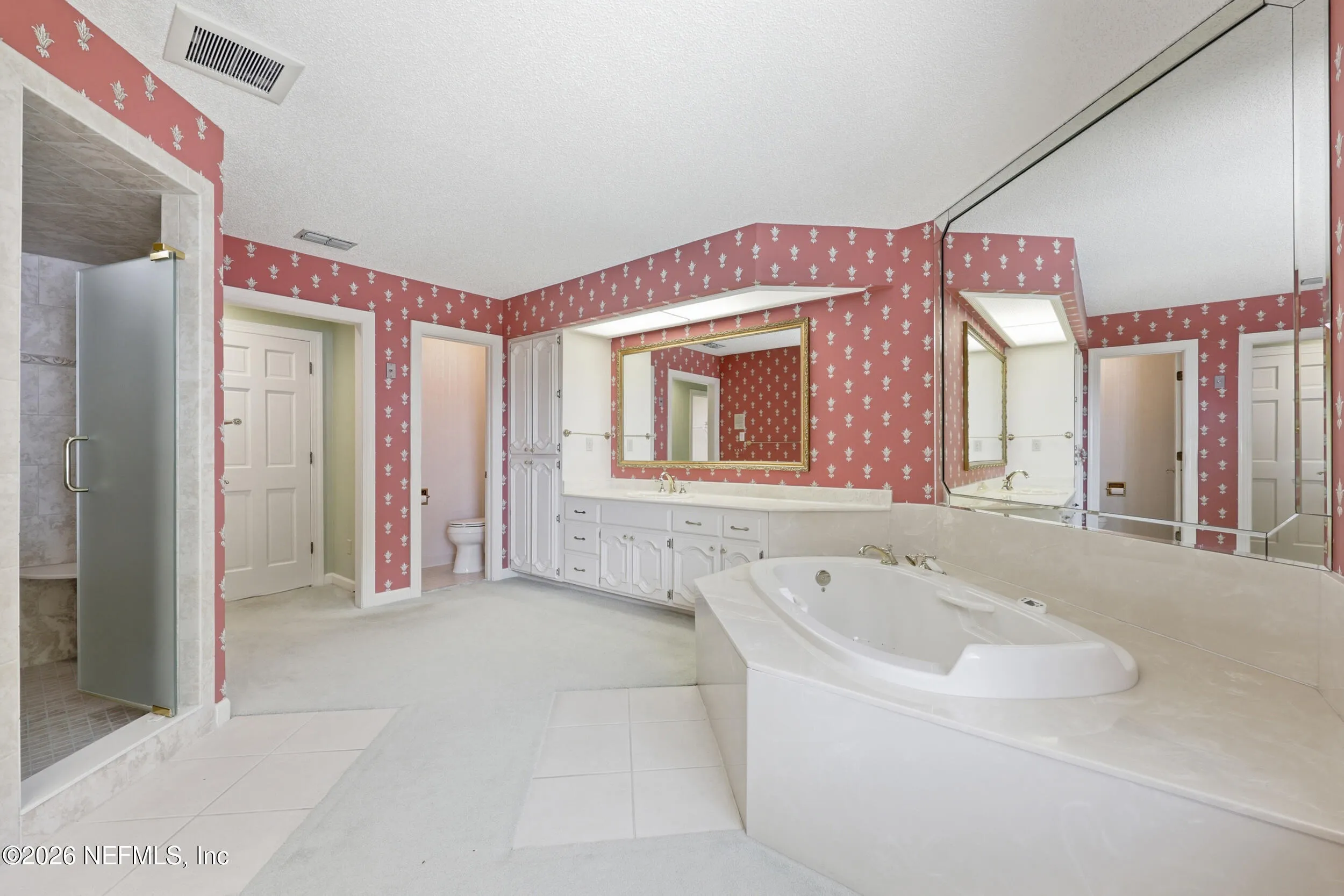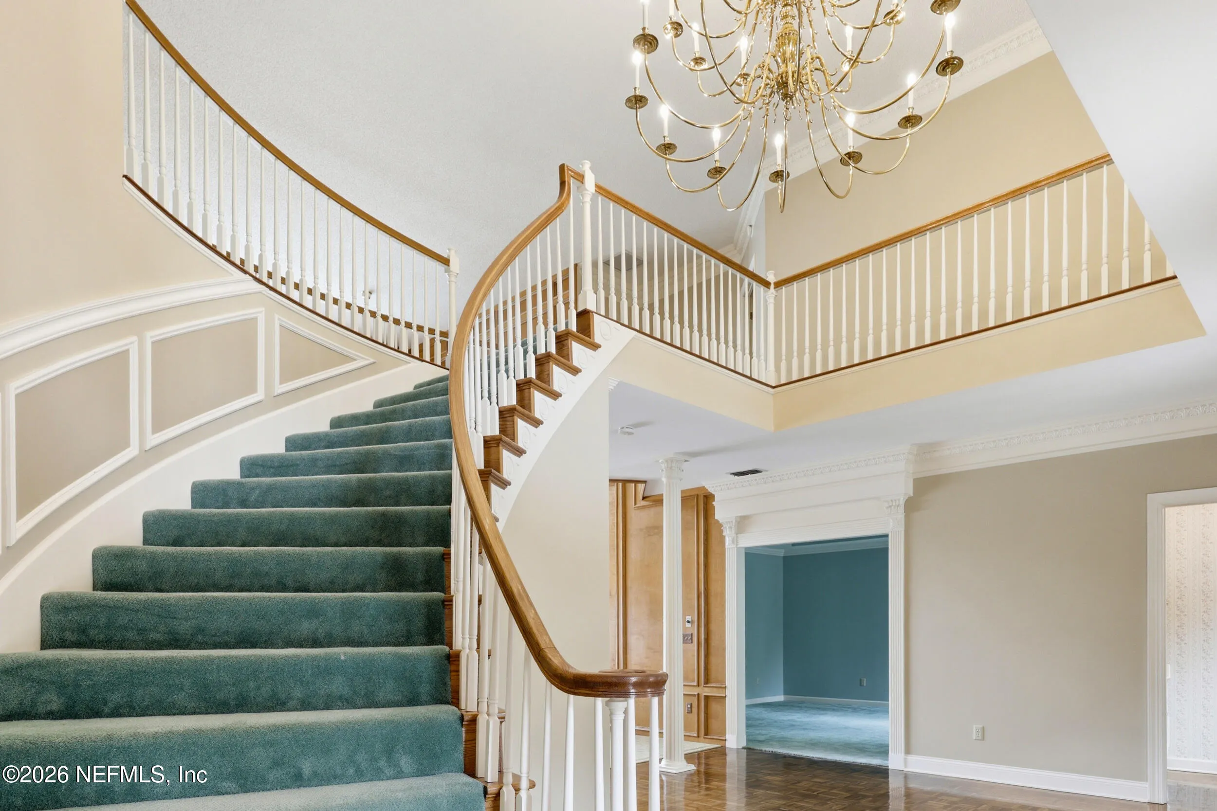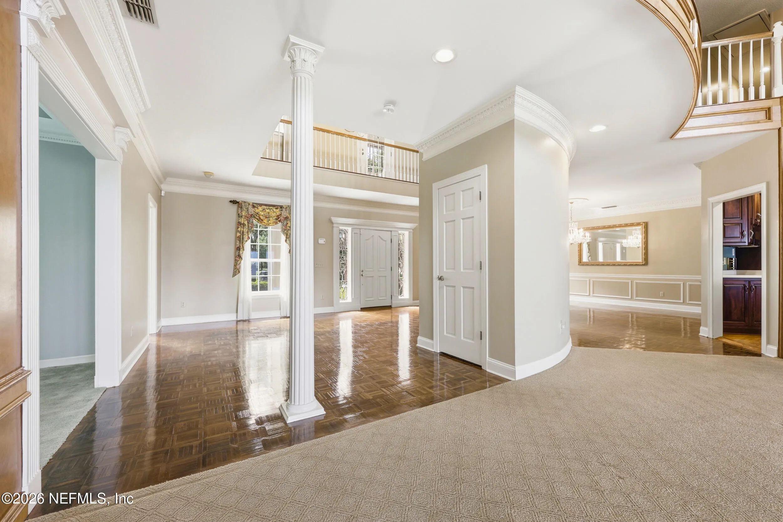 Welcome to this stunning custom-built all-brick 5-bedroom, 5-bath two-story home, beautifully set on a serene pond lot in the highly desirable Gates of St. John. With picturesque views and timeless curb appeal, this home truly shines in the spring season. Step inside the grand two-story foyer with dual staircases and feel immediately at home.