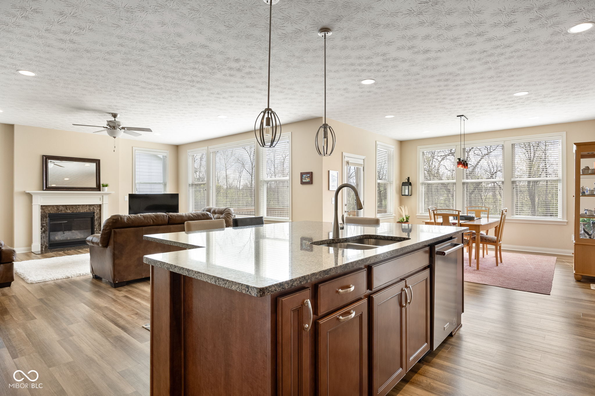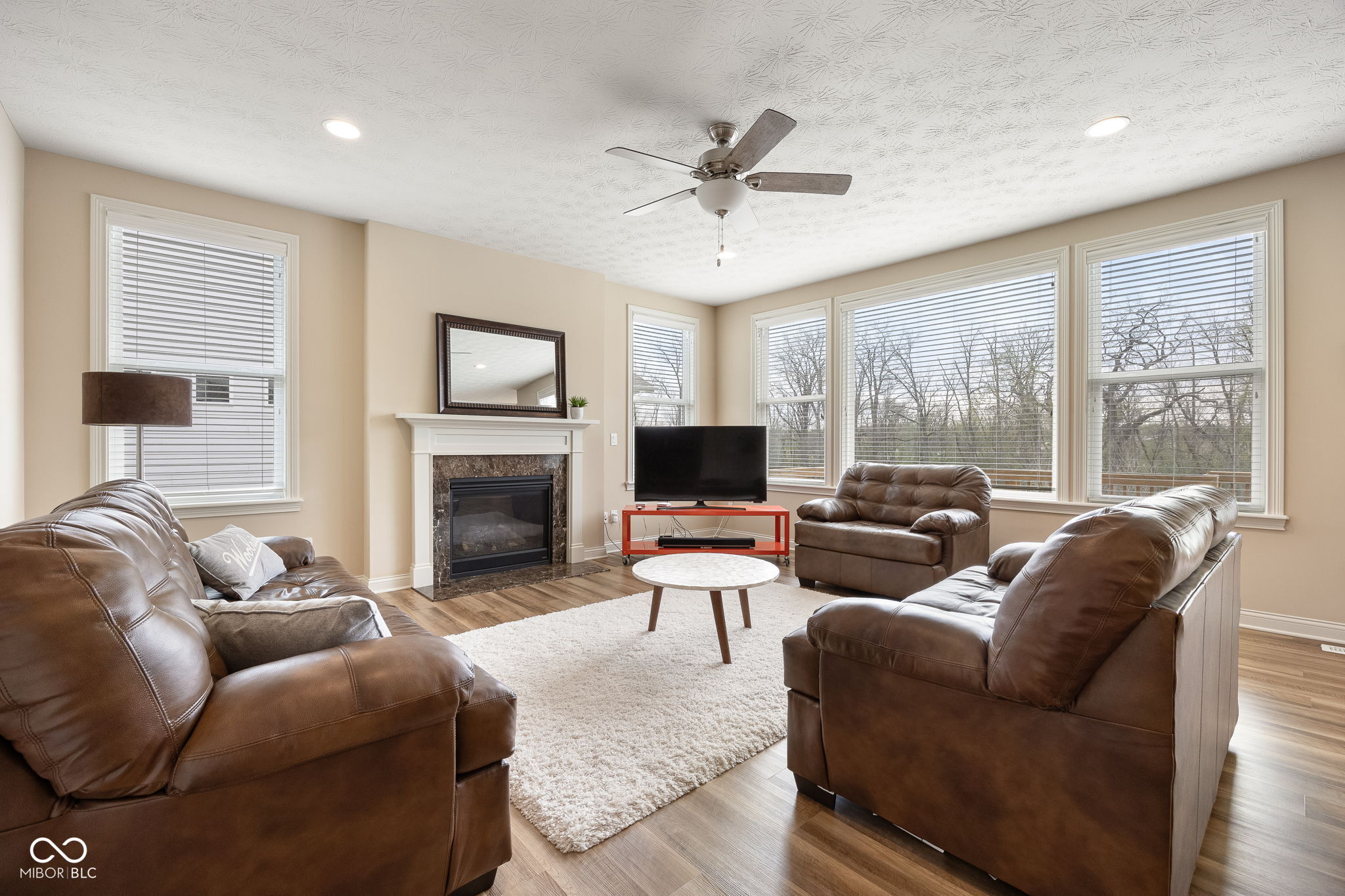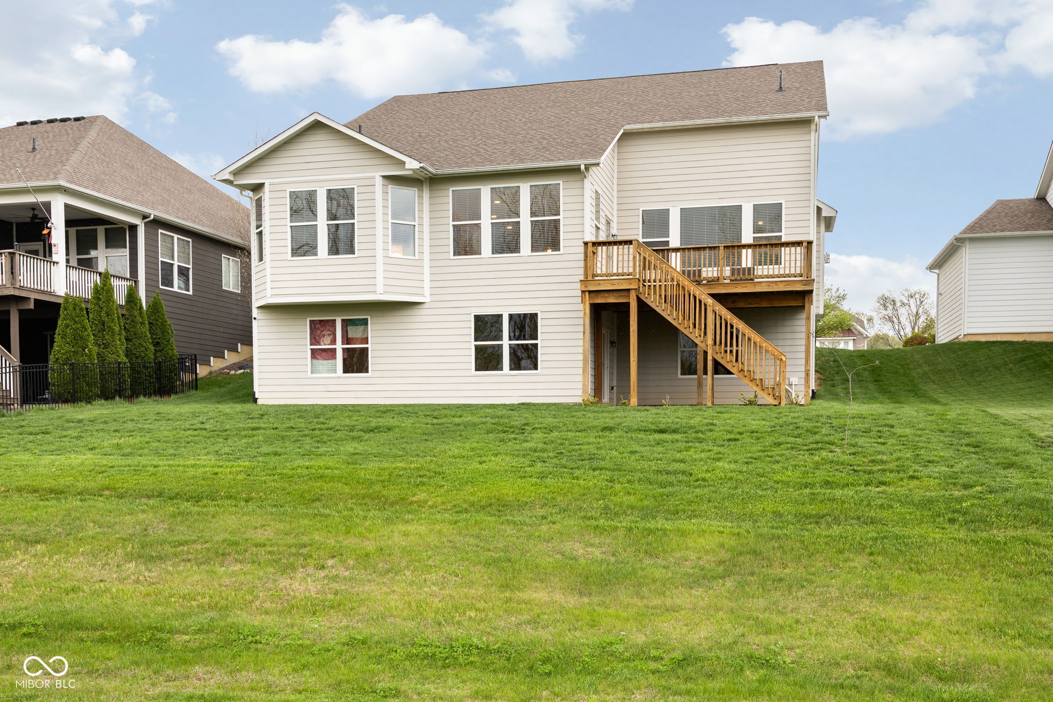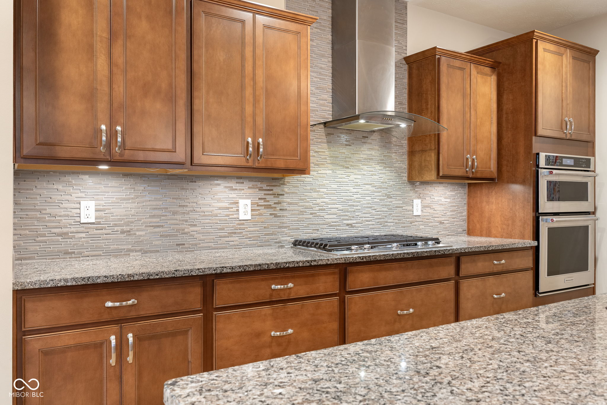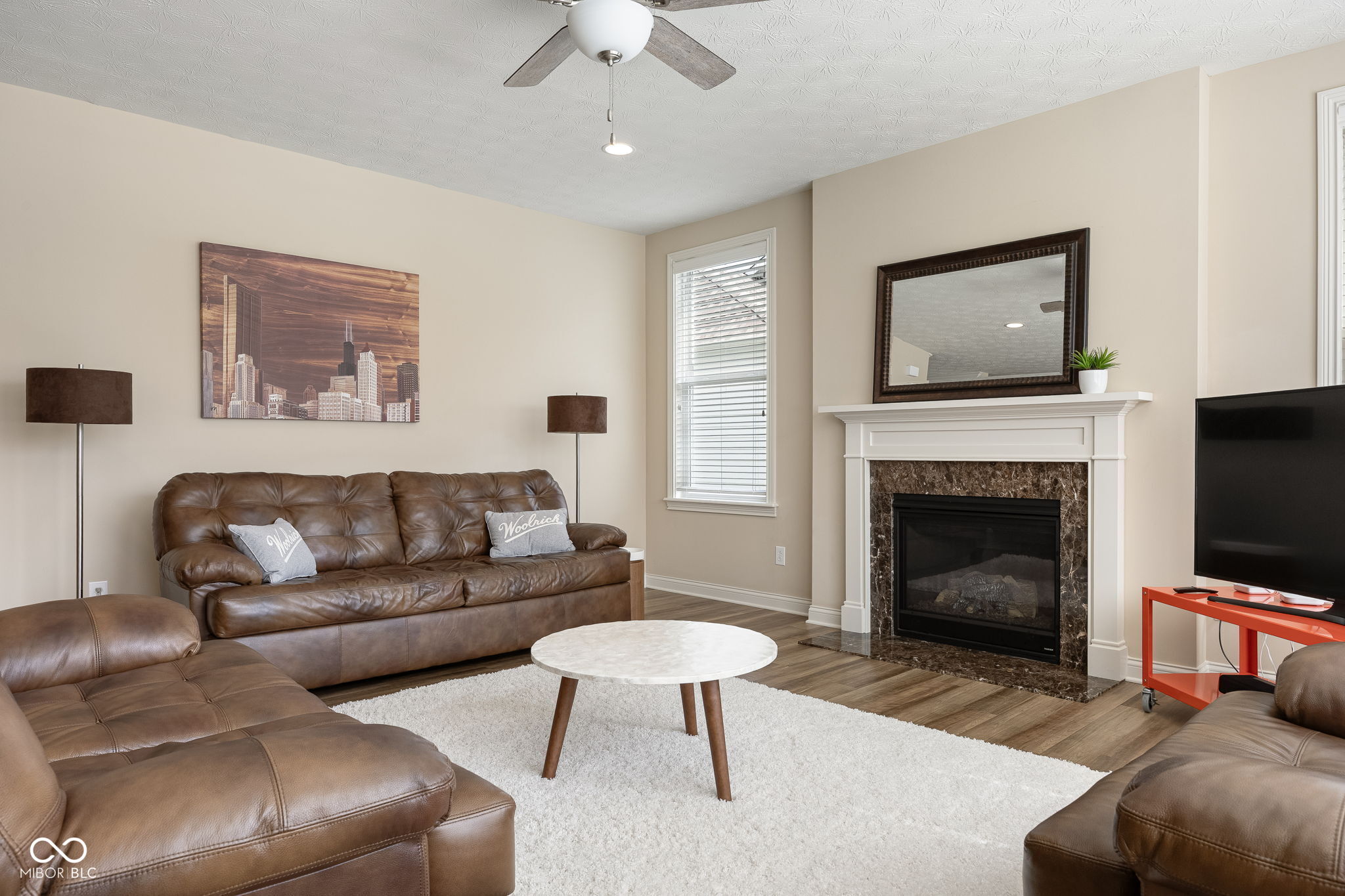 This well-maintained ranch home offers over 2,400 square feet of main-level living with a thoughtfully designed split-bedroom floor plan, bright natural sunlight, and a protected west facing view. A guest suite at the front and a spacious primary suite on the opposite side of the home. Currently utilized as a two bedroom, it also offers a flex room that can easily convert into a third bedroom with the addition of a door. The open floor plan centers around the kitchen with an oversized quartz island, gas cooktop, and exterior exhaust hood, seamlessly connecting to the dining area and living room. Living room features a gas fireplace, nine-foot ceilings and large west-facing windows, which fill the home with natural light. The primary retreat includes crown molding, dual vanities, oversized tiled shower, and a large walk-in closet. Enjoy outdoor living on your deck overlooking protected, wooded backdrop. The full WALK OUT basement offers an additional 2,400 square feet of potential living space, with plumbing rough-ins already in place for future bedrooms and expanded living areas. Centrally located in Westfield with easy access to 31, a short walk to Cool Creek Park and the Monon Trail, and minutes from all that downtown Westfield offers.