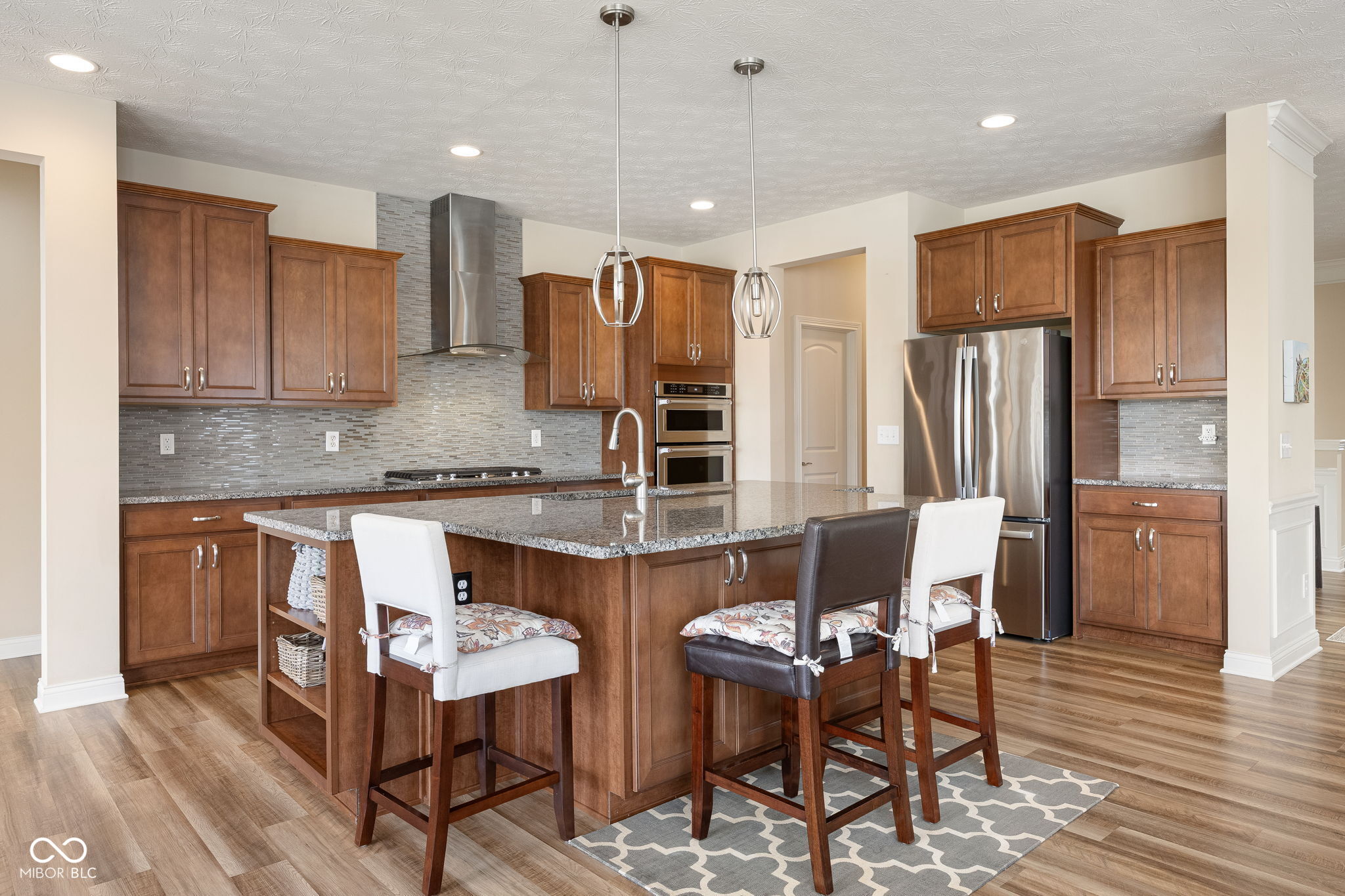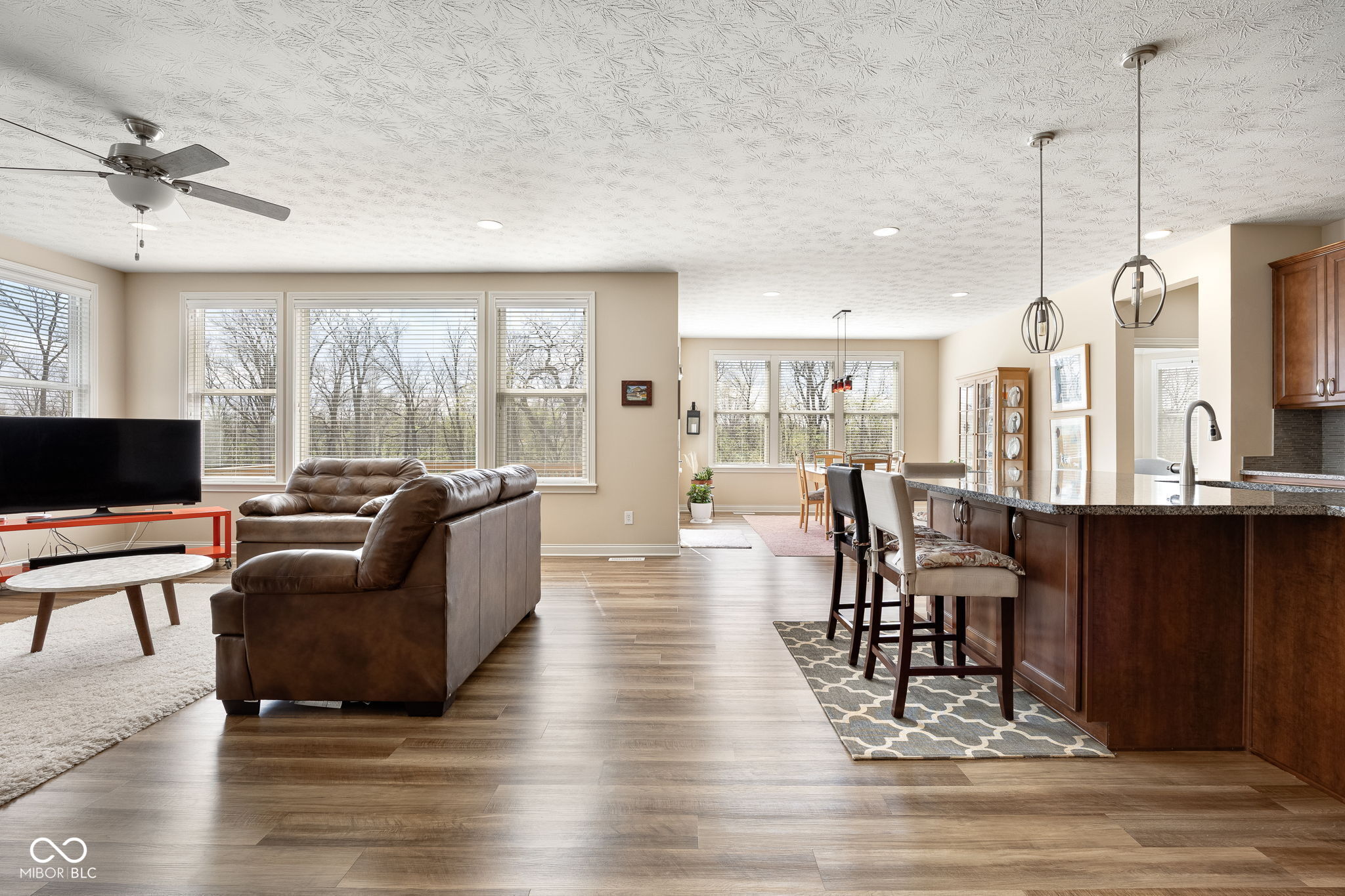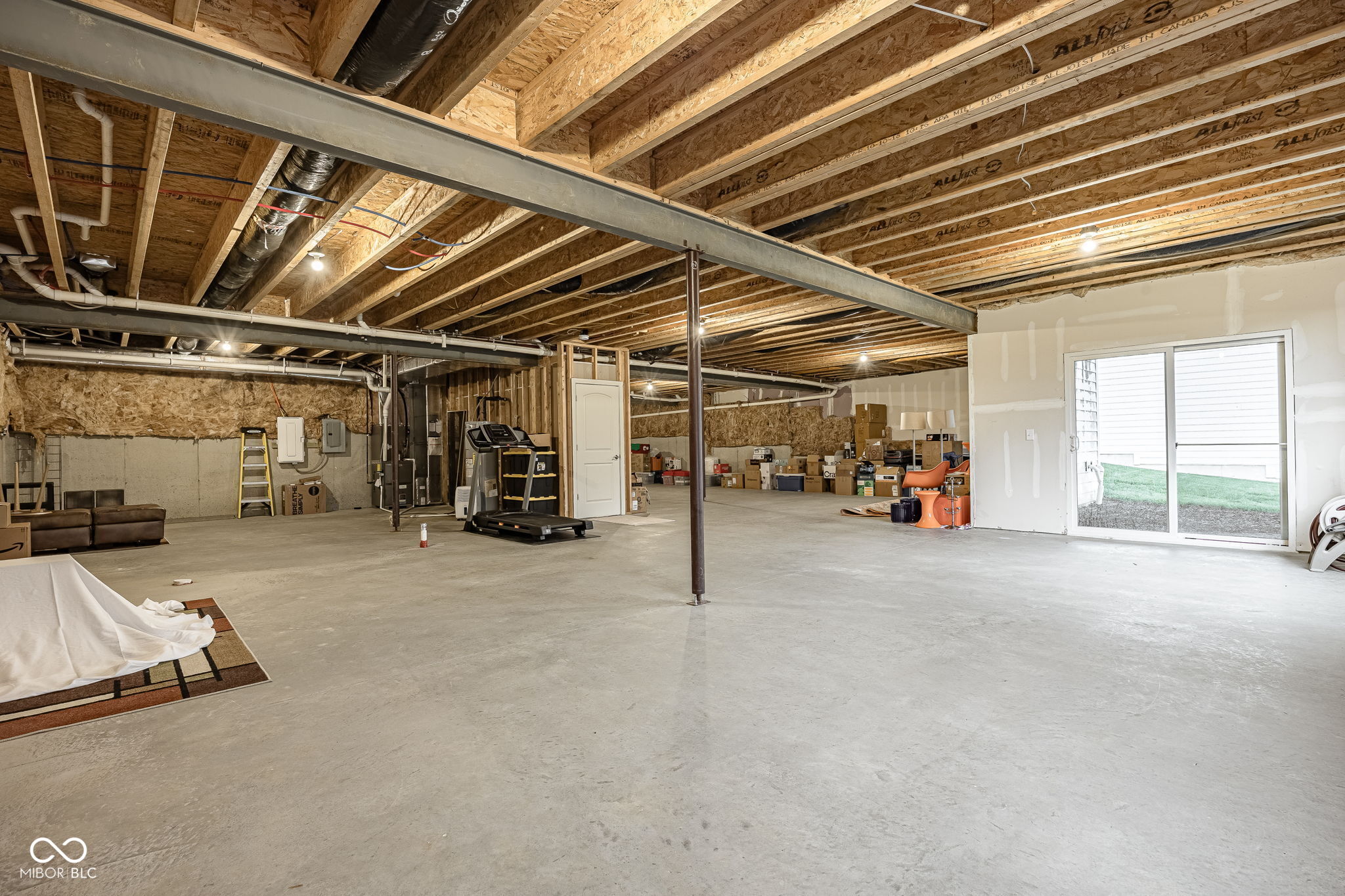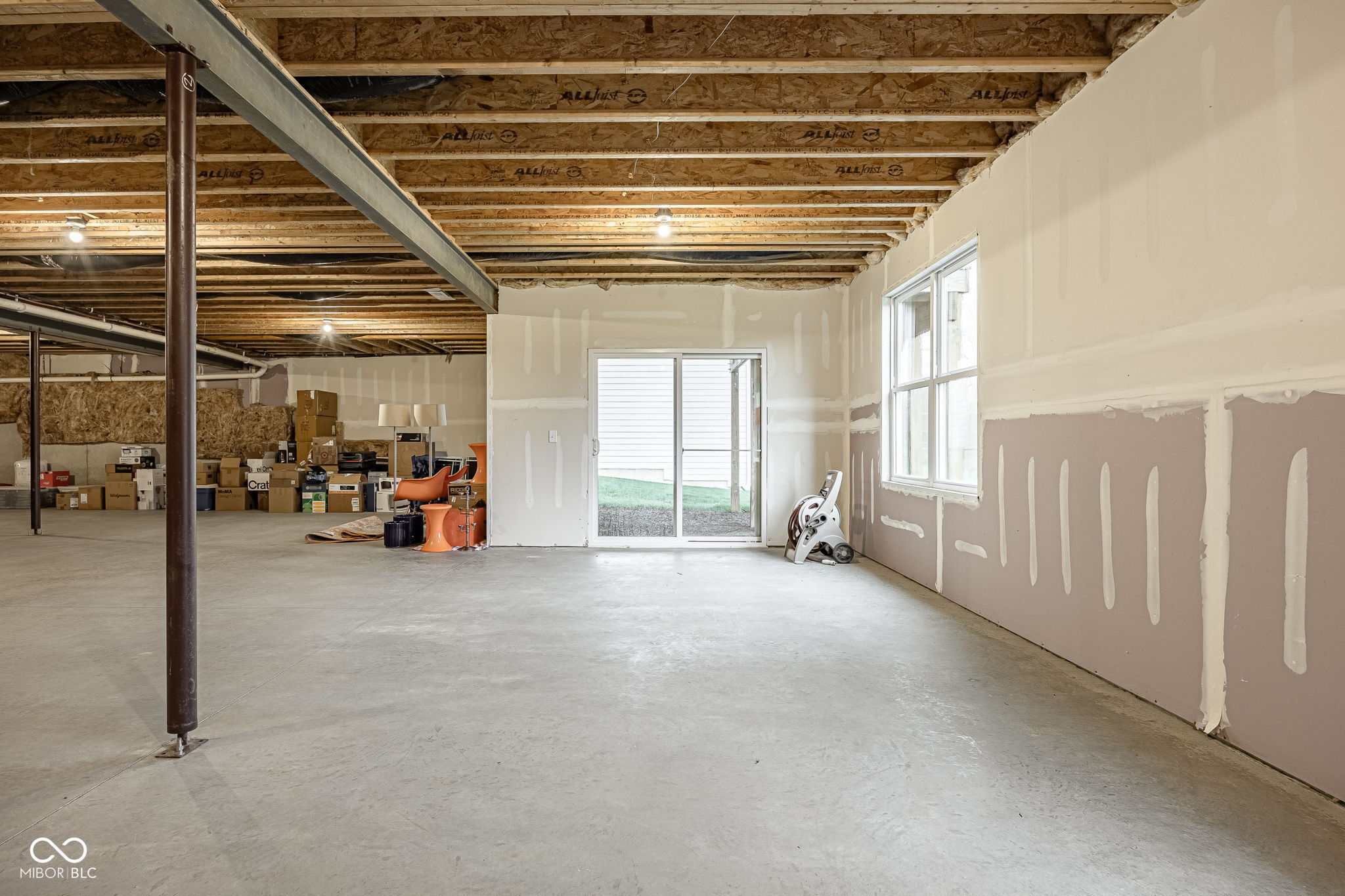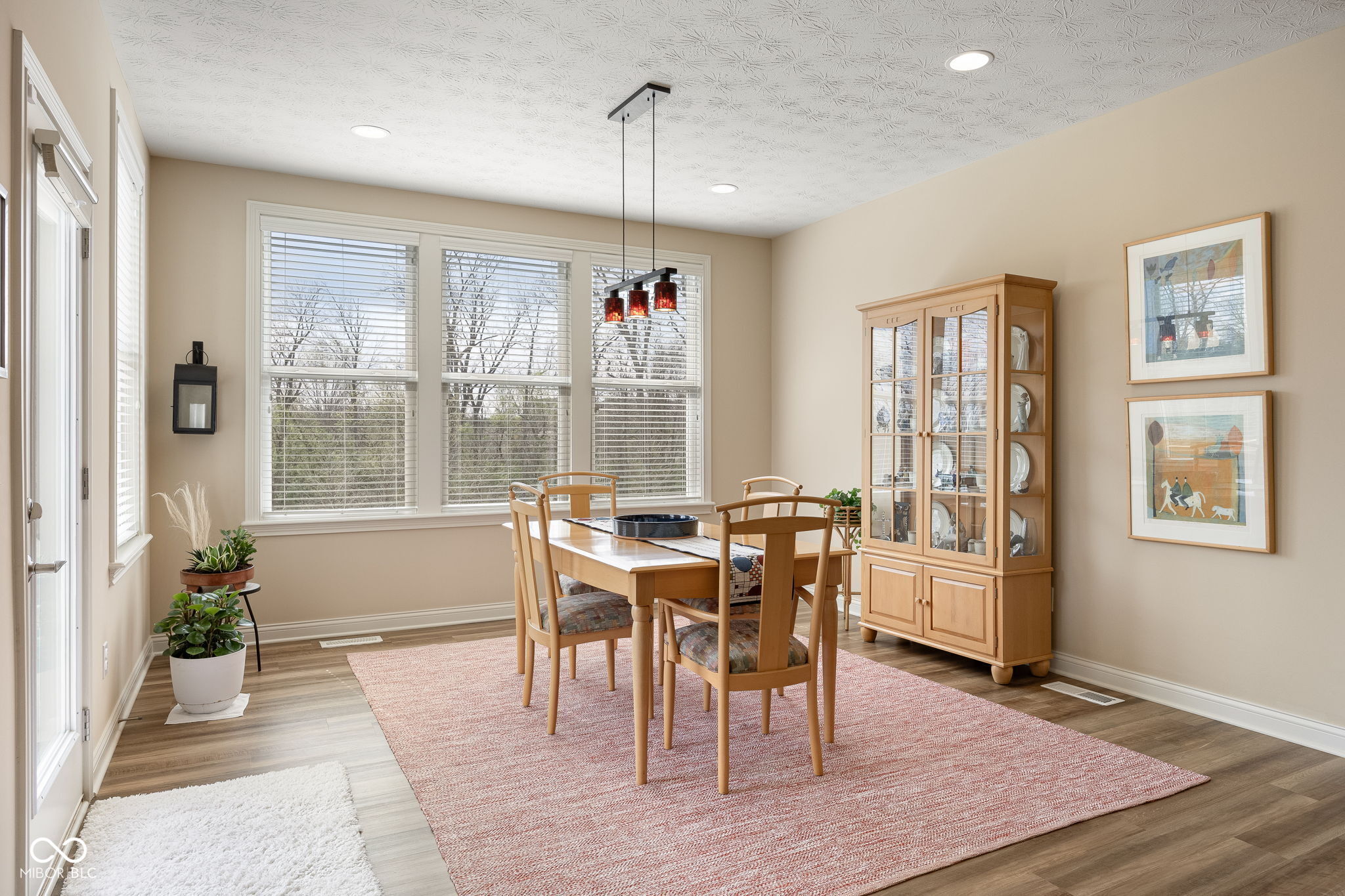 This well-maintained ranch home offers over 2,400 square feet of main-level living with a thoughtfully designed split-bedroom floor plan, bright natural sunlight, and a protected west facing view. A guest suite at the front and a spacious primary suite on the opposite side of the home. Currently utilized as a two bedroom, it also offers a flex room that can easily convert into a third bedroom with the addition of a door. The open floor plan centers around the kitchen with an oversized quartz island, gas cooktop, and exterior exhaust hood, seamlessly connecting to the dining area and living room. Living room features a gas fireplace, nine-foot ceilings and large west-facing windows, which fill the home with natural light. The primary retreat includes crown molding, dual vanities, oversized tiled shower, and a large walk-in closet. Enjoy outdoor living on your deck overlooking protected, wooded backdrop. The full WALK OUT basement offers an additional 2,400 square feet of potential living space, with plumbing rough-ins already in place for future bedrooms and expanded living areas. Centrally located in Westfield with easy access to 31, a short walk to Cool Creek Park and the Monon Trail, and minutes from all that downtown Westfield offers.