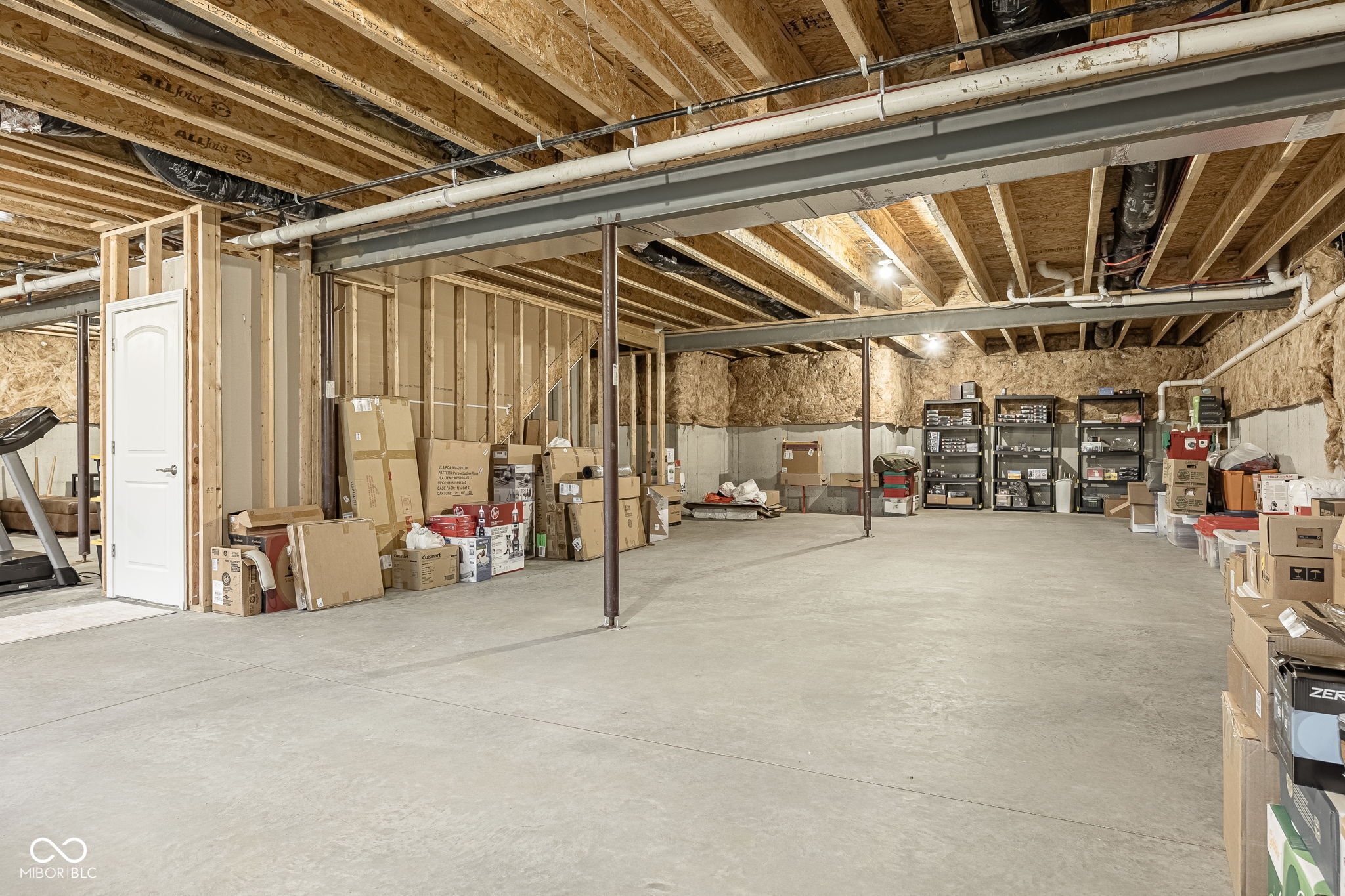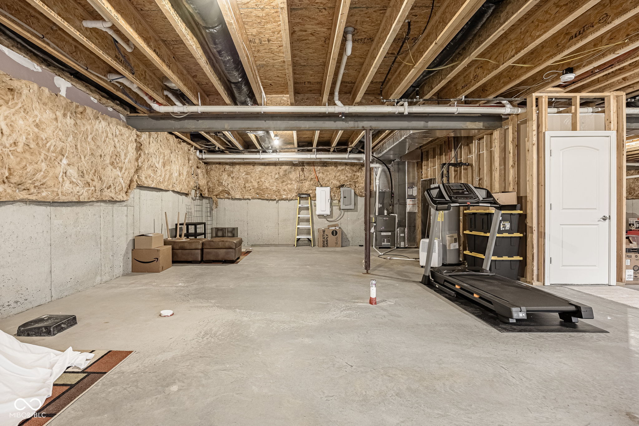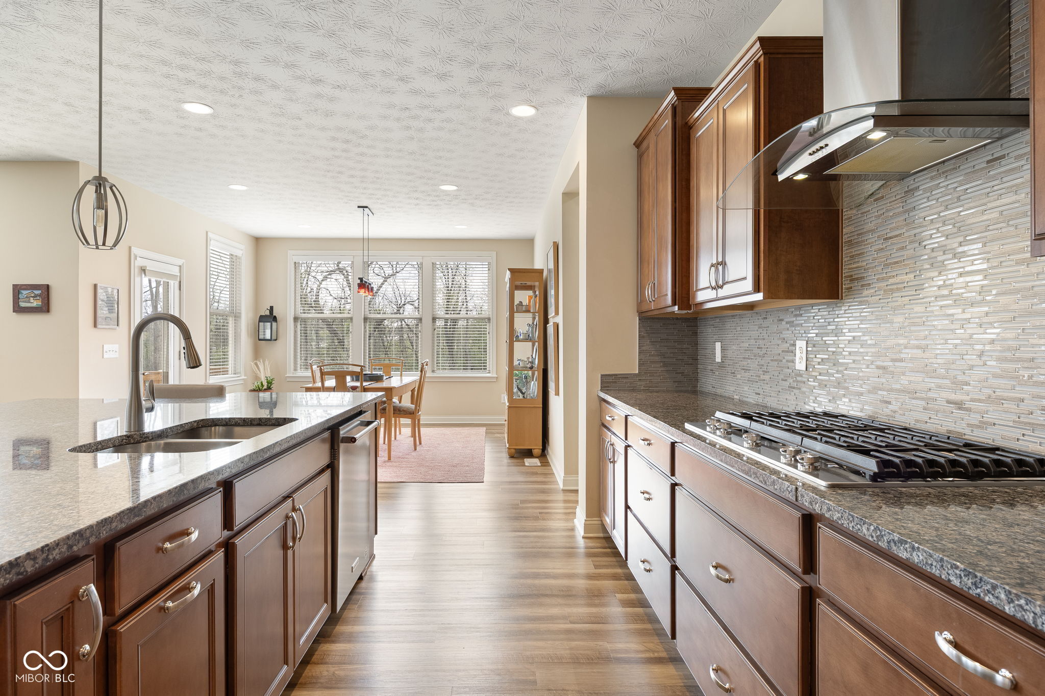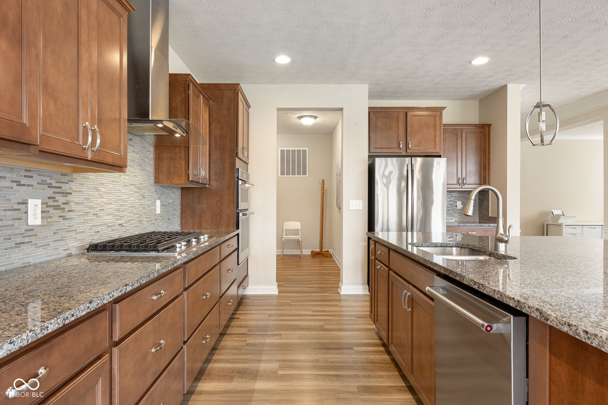 This well-maintained ranch home offers over 2,400 square feet of main-level living with a thoughtfully designed split-bedroom floor plan, bright natural sunlight, and a protected west facing view. A guest suite at the front and a spacious primary suite on the opposite side of the home. Currently utilized as a two bedroom, it also offers a flex room that can easily convert into a third bedroom with the addition of a door. The open floor plan centers around the kitchen with an oversized quartz island, gas cooktop, and exterior exhaust hood, seamlessly connecting to the dining area and living room. Living room features a gas fireplace, nine-foot ceilings and large west-facing windows, which fill the home with natural light. The primary retreat includes crown molding, dual vanities, oversized tiled shower, and a large walk-in closet. Enjoy outdoor living on your deck overlooking protected, wooded backdrop. The full WALK OUT basement offers an additional 2,400 square feet of potential living space, with plumbing rough-ins already in place for future bedrooms and expanded living areas. Centrally located in Westfield with easy access to 31, a short walk to Cool Creek Park and the Monon Trail, and minutes from all that downtown Westfield offers.