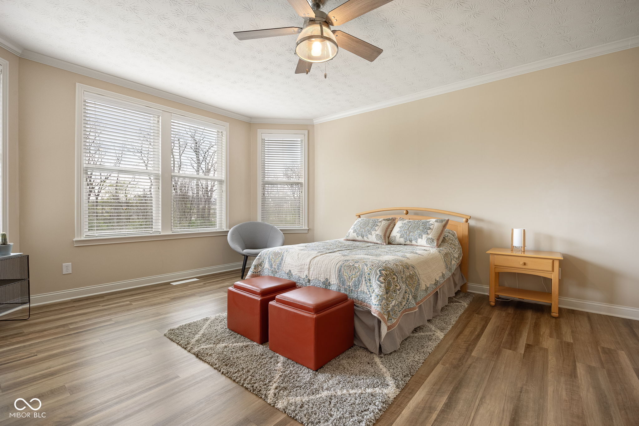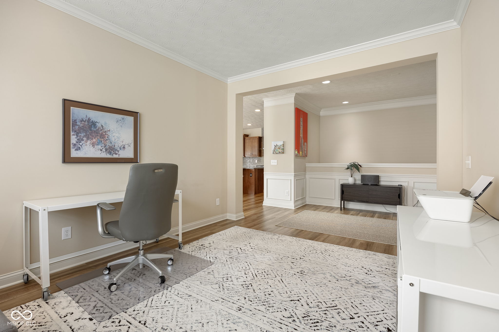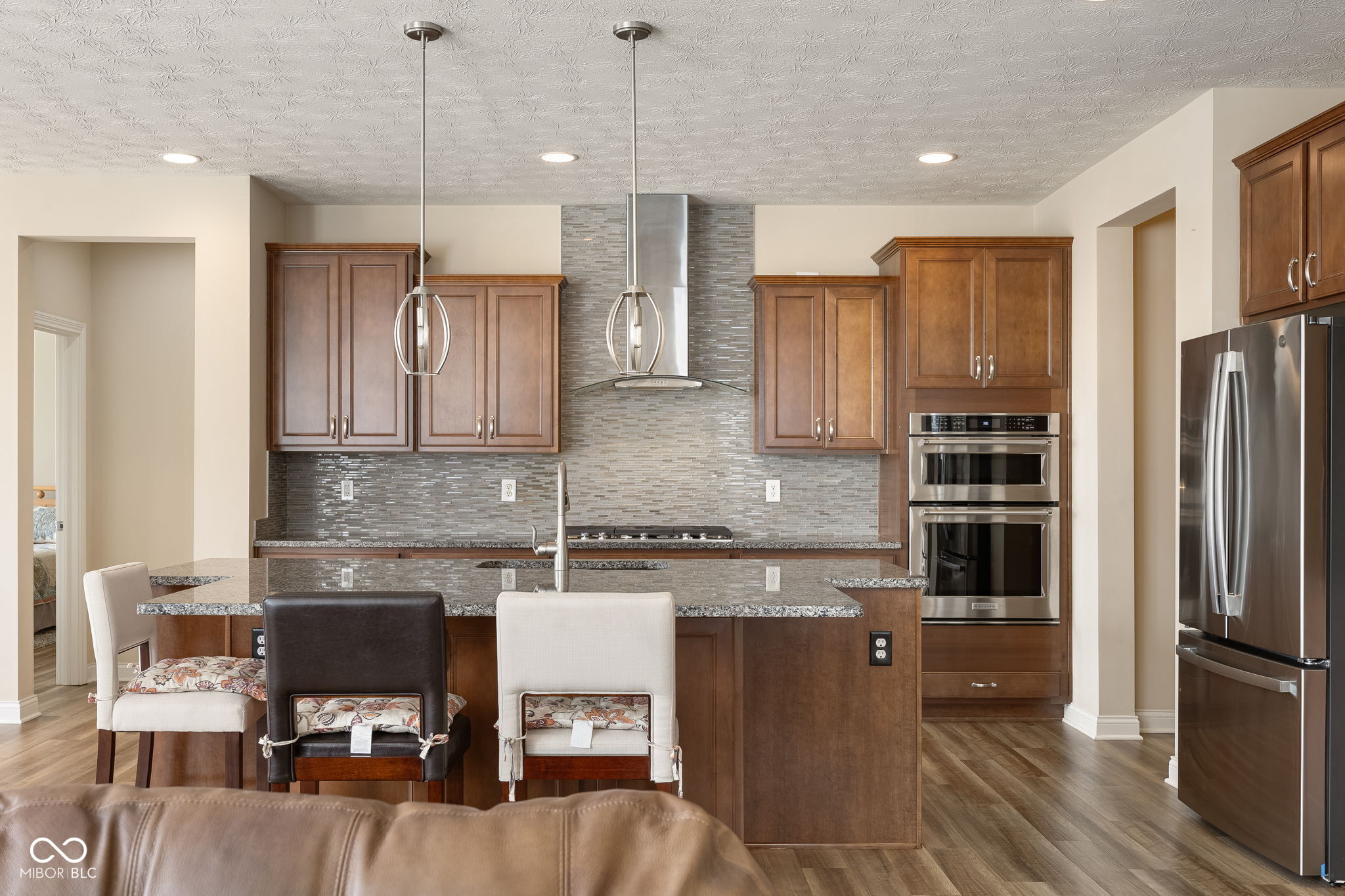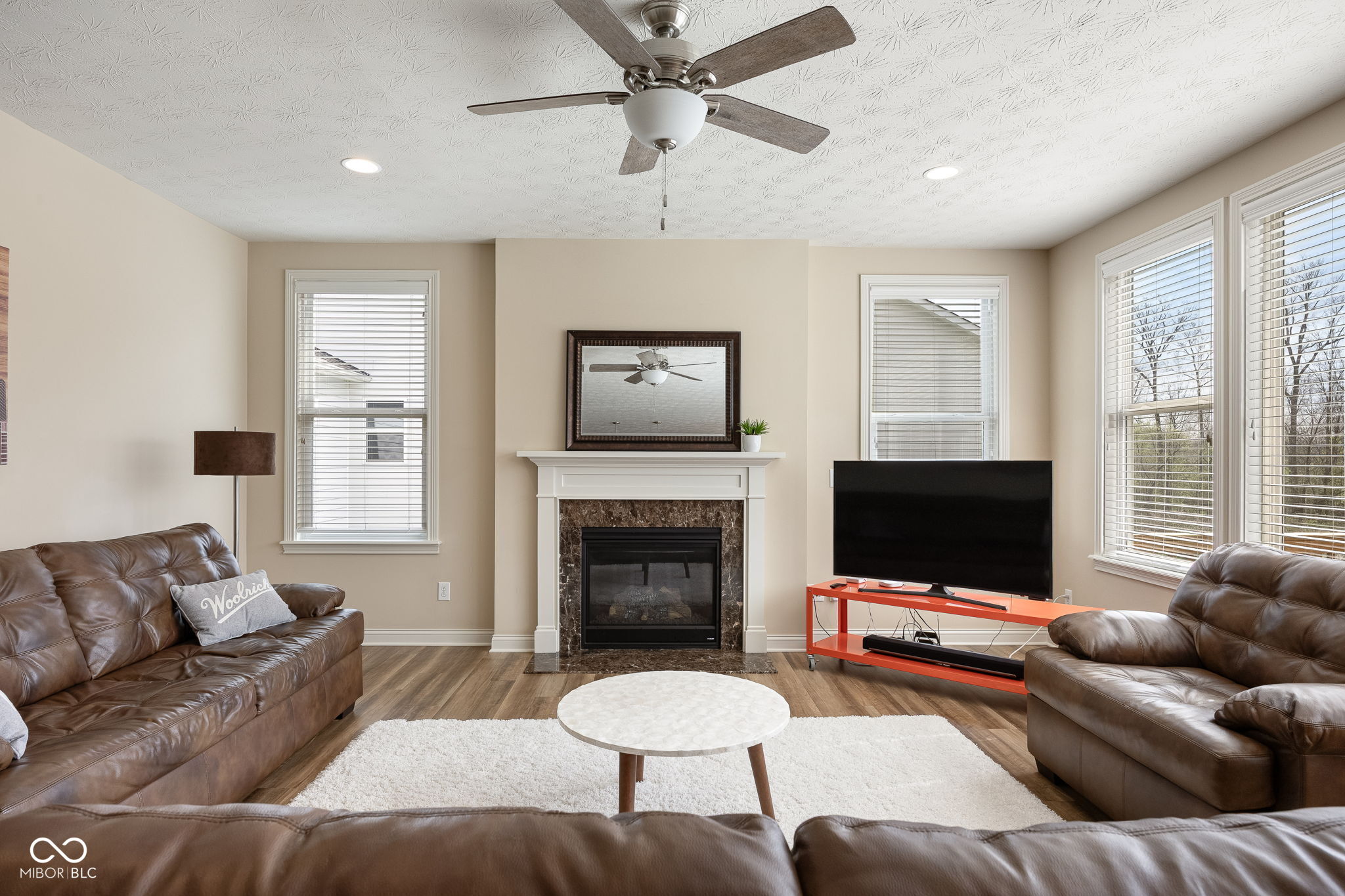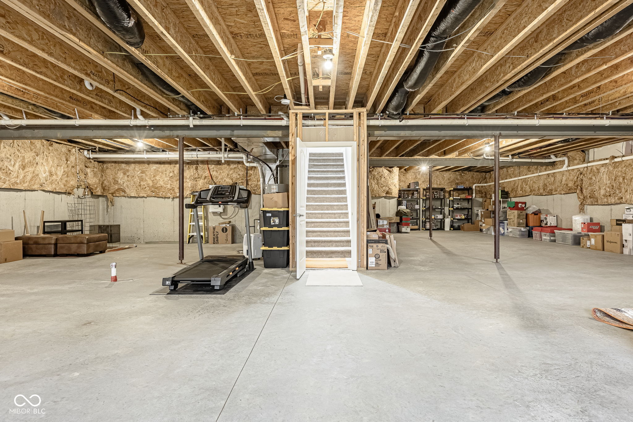 This well-maintained ranch home offers over 2,400 square feet of main-level living with a thoughtfully designed split-bedroom floor plan, bright natural sunlight, and a protected west facing view. A guest suite at the front and a spacious primary suite on the opposite side of the home. Currently utilized as a two bedroom, it also offers a flex room that can easily convert into a third bedroom with the addition of a door. The open floor plan centers around the kitchen with an oversized quartz island, gas cooktop, and exterior exhaust hood, seamlessly connecting to the dining area and living room. Living room features a gas fireplace, nine-foot ceilings and large west-facing windows, which fill the home with natural light. The primary retreat includes crown molding, dual vanities, oversized tiled shower, and a large walk-in closet. Enjoy outdoor living on your deck overlooking protected, wooded backdrop. The full WALK OUT basement offers an additional 2,400 square feet of potential living space, with plumbing rough-ins already in place for future bedrooms and expanded living areas. Centrally located in Westfield with easy access to 31, a short walk to Cool Creek Park and the Monon Trail, and minutes from all that downtown Westfield offers.