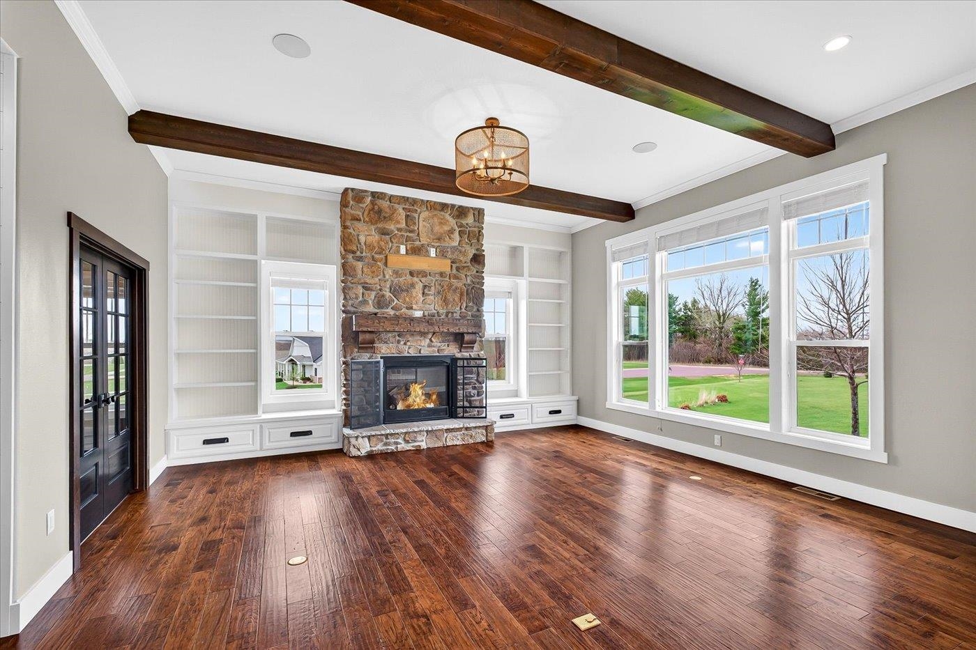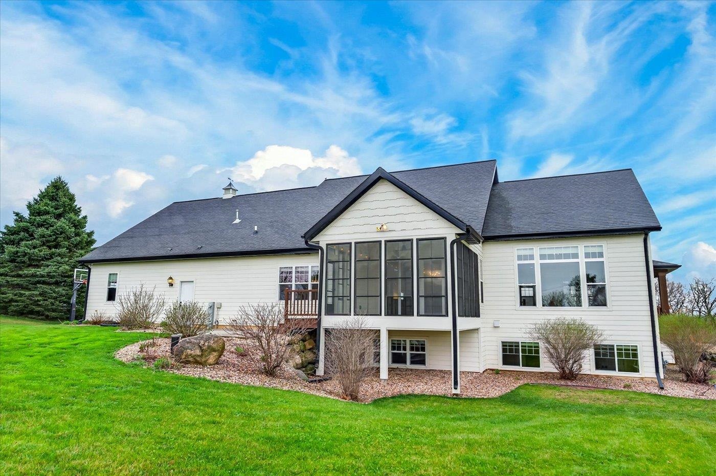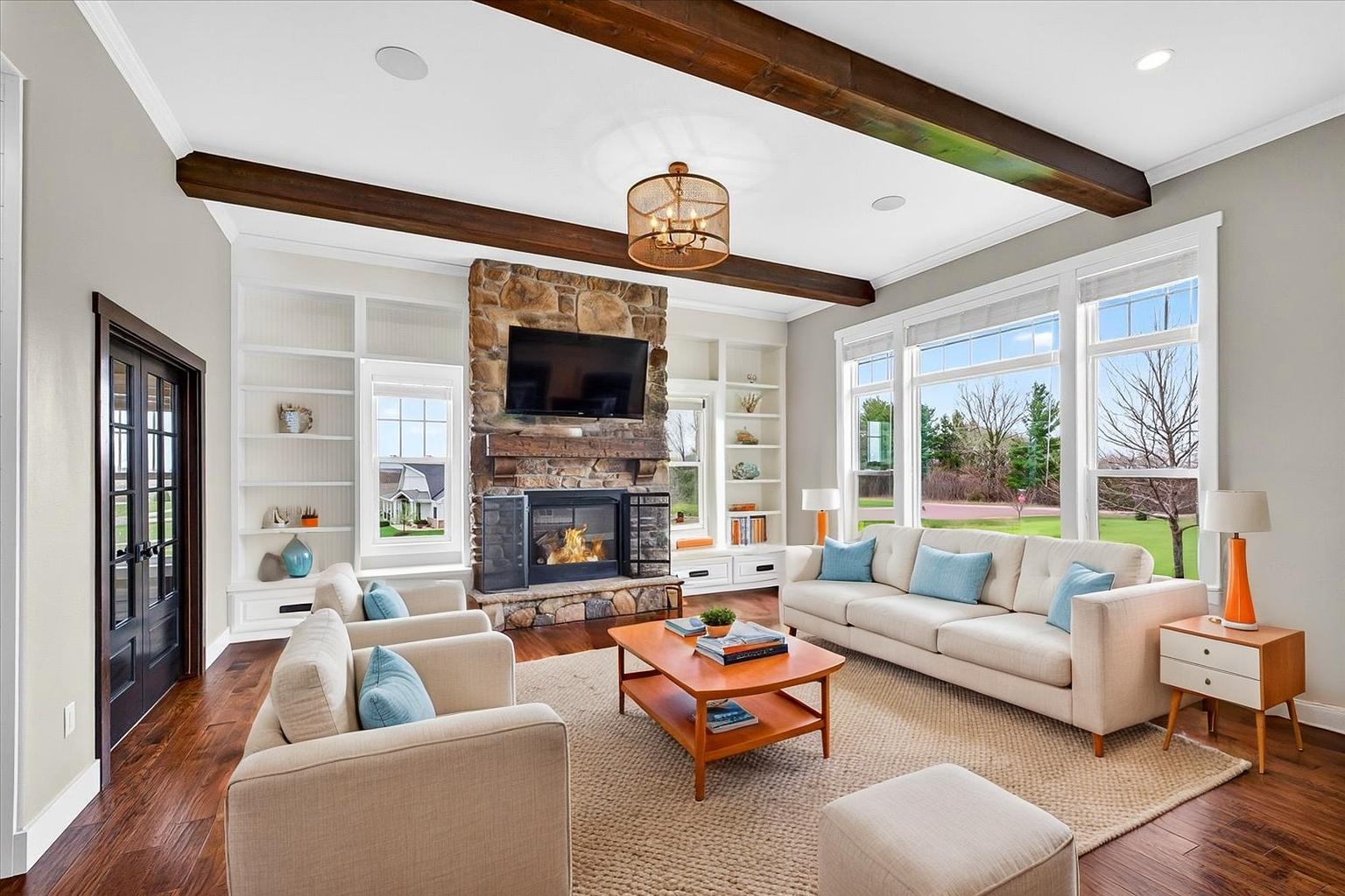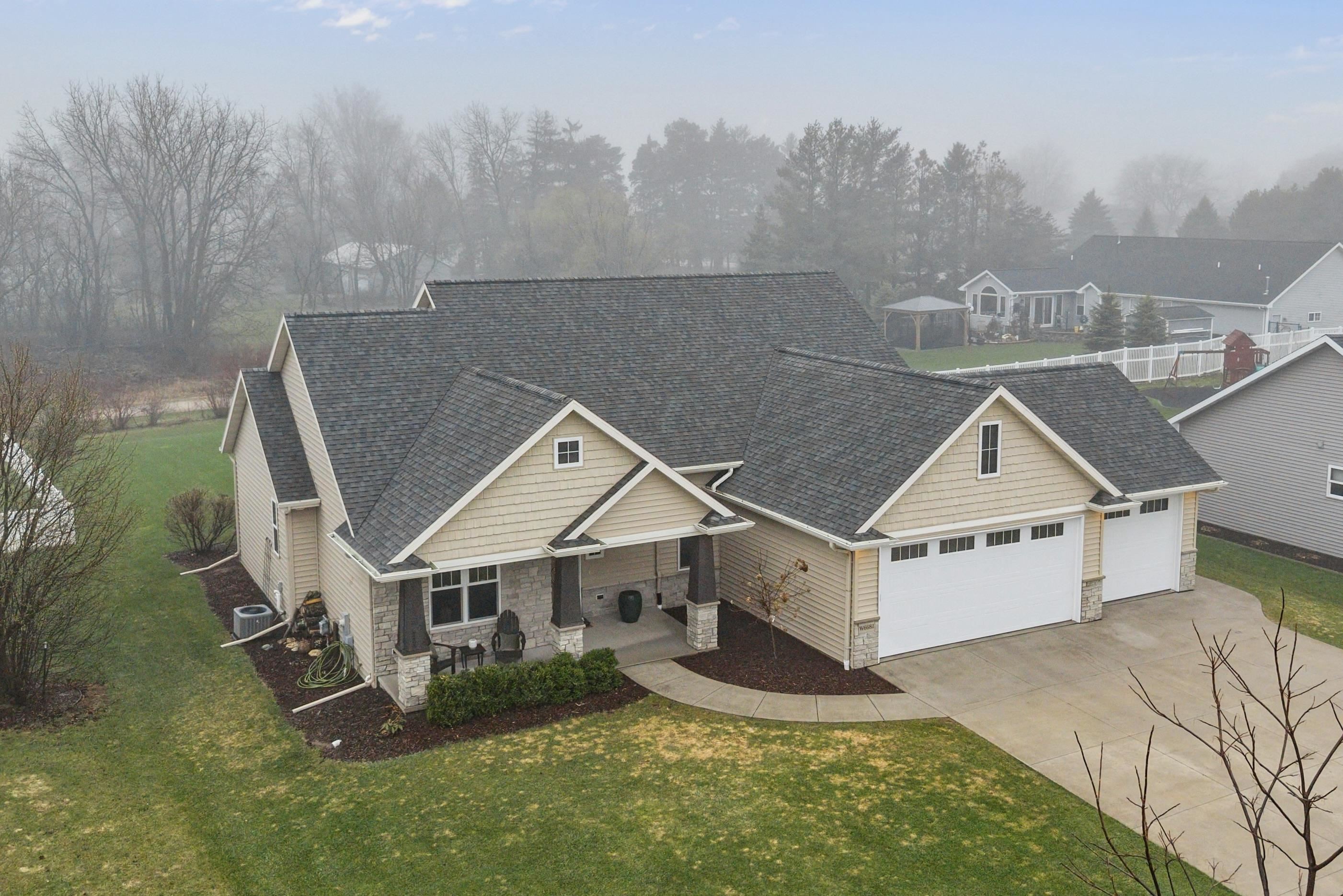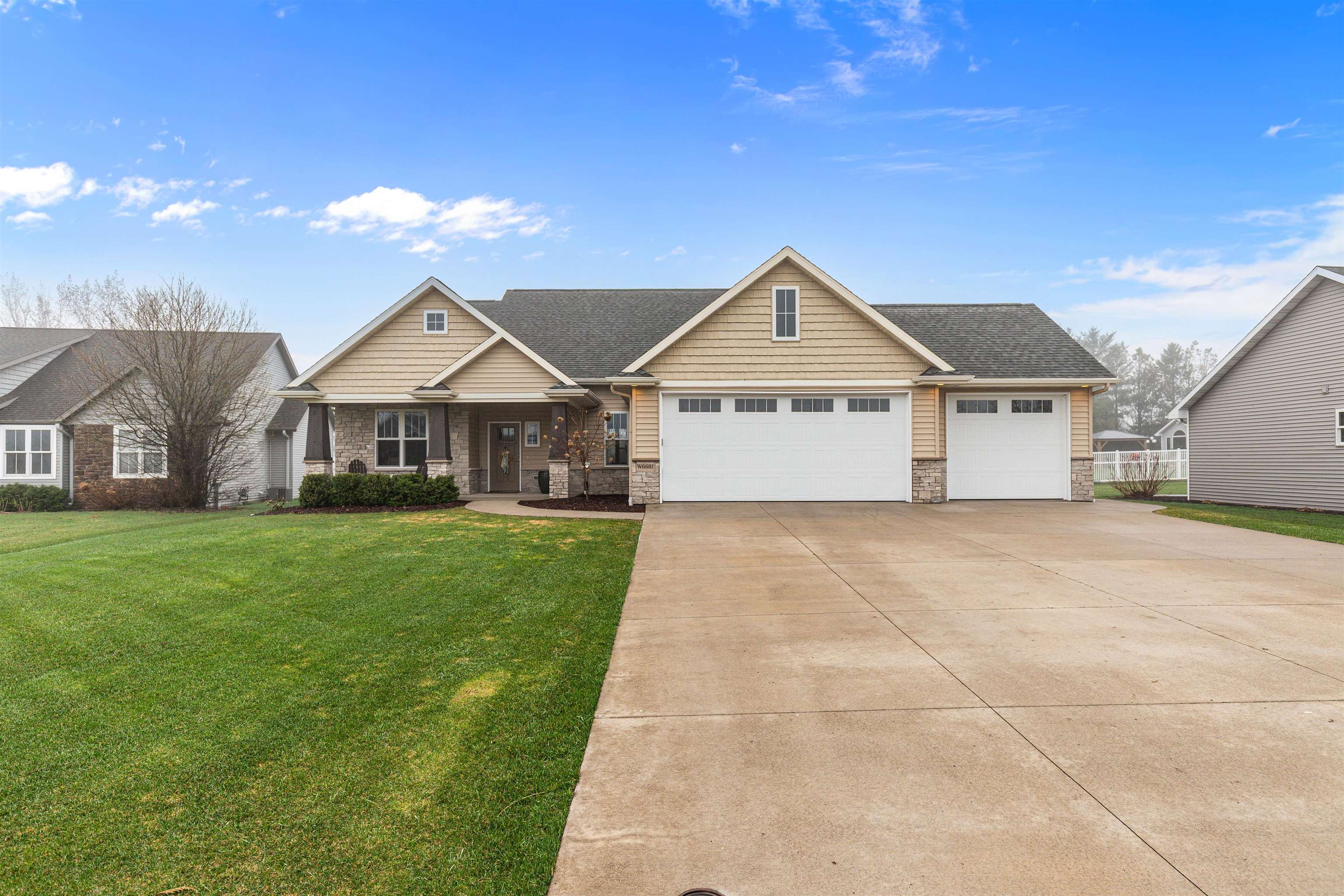 This 2017 Parade Home in Greenville offers 6 bedrooms, 4.5 bathrooms, and an exceptionally spacious layout. Zero-entry design adds convenience, while the upper level features a second primary suite tucked behind a hidden door. The open main living area is highlighted by beautiful stonework, a fireplace, built-ins, ceiling detail, and a large kitchen with attractive finishes. The dining area opens to a covered back patio overlooking a spacious backyard. The finished lower level offers a large rec room, additional bedrooms, a full bath, storage room, and unfinished flex space currently used as a workout room. Additional highlights 3-zone heating and a tankless water heater. Just a few blocks from Appleton airport and Chaska Golf Course, this home combines space, style, and flexibility.