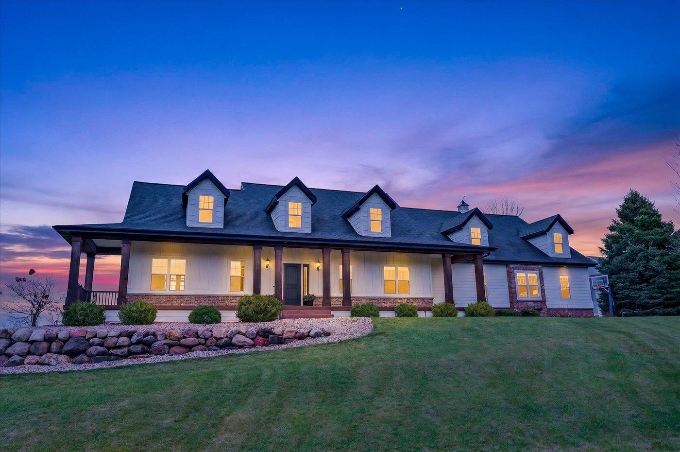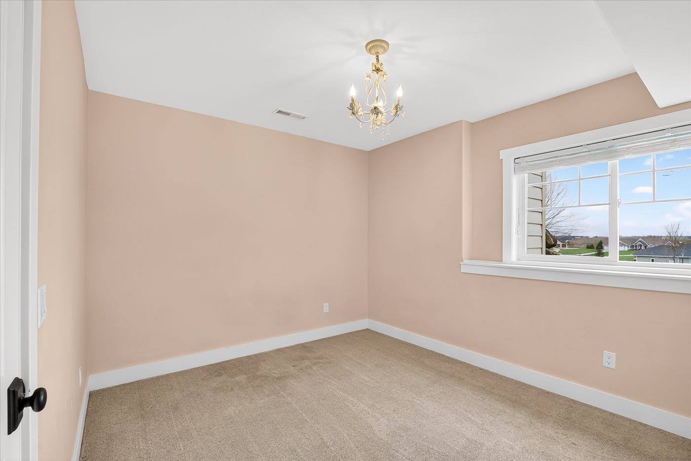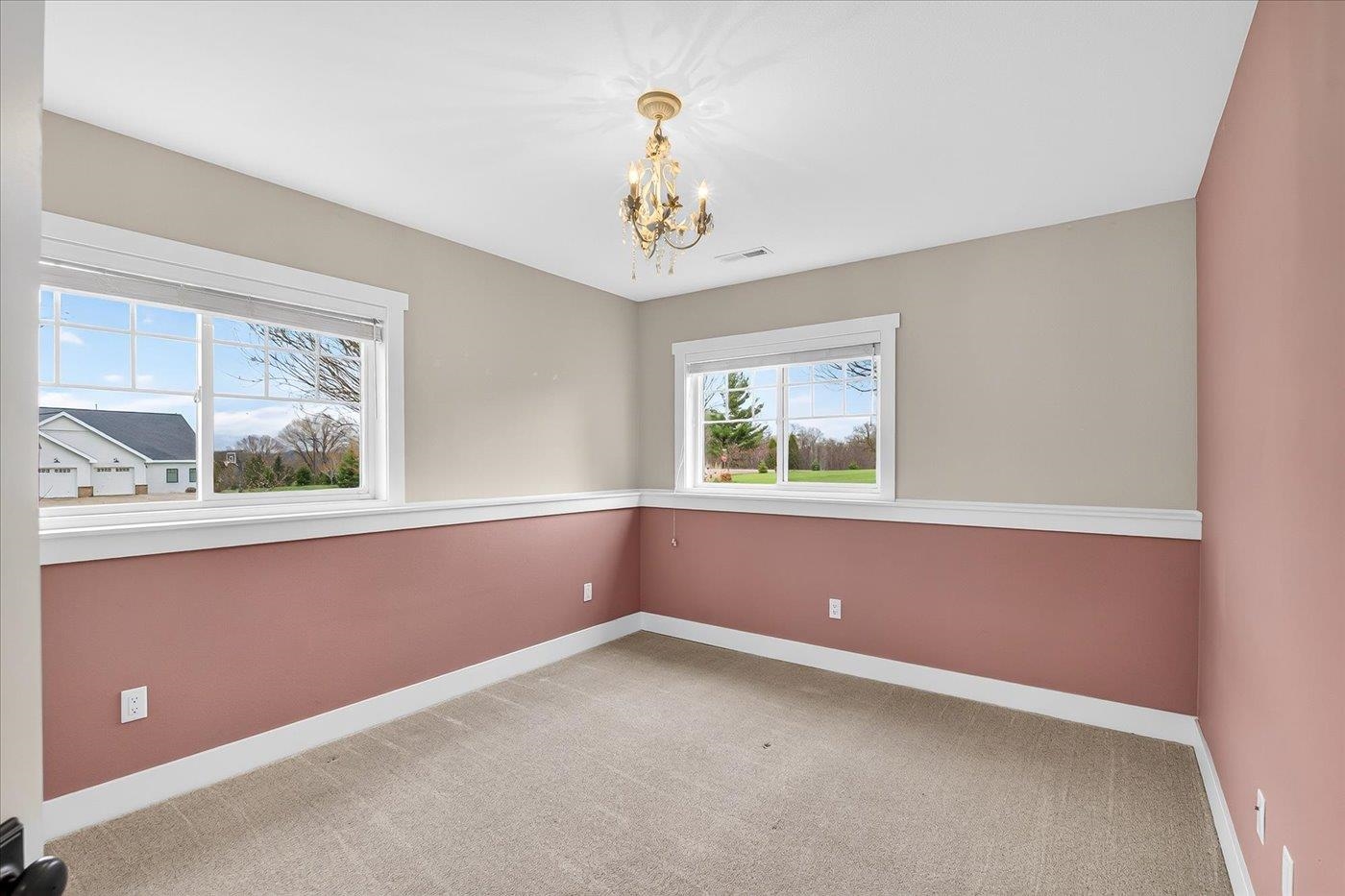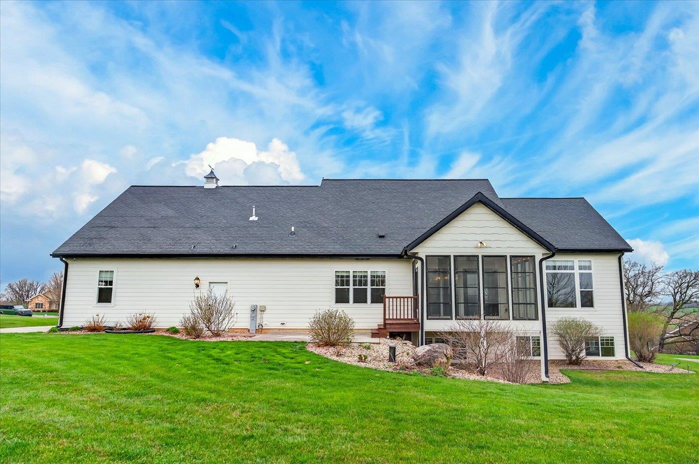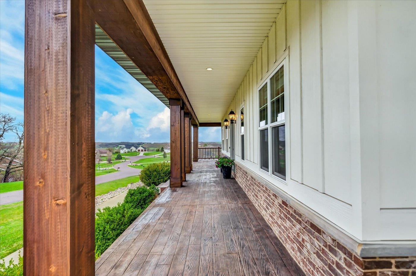 This 2017 Parade Home in Greenville offers 6 bedrooms, 4.5 bathrooms, and an exceptionally spacious layout. Zero-entry design adds convenience, while the upper level features a second primary suite tucked behind a hidden door. The open main living area is highlighted by beautiful stonework, a fireplace, built-ins, ceiling detail, and a large kitchen with attractive finishes. The dining area opens to a covered back patio overlooking a spacious backyard. The finished lower level offers a large rec room, additional bedrooms, a full bath, storage room, and unfinished flex space currently used as a workout room. Additional highlights 3-zone heating and a tankless water heater. Just a few blocks from Appleton airport and Chaska Golf Course, this home combines space, style, and flexibility.