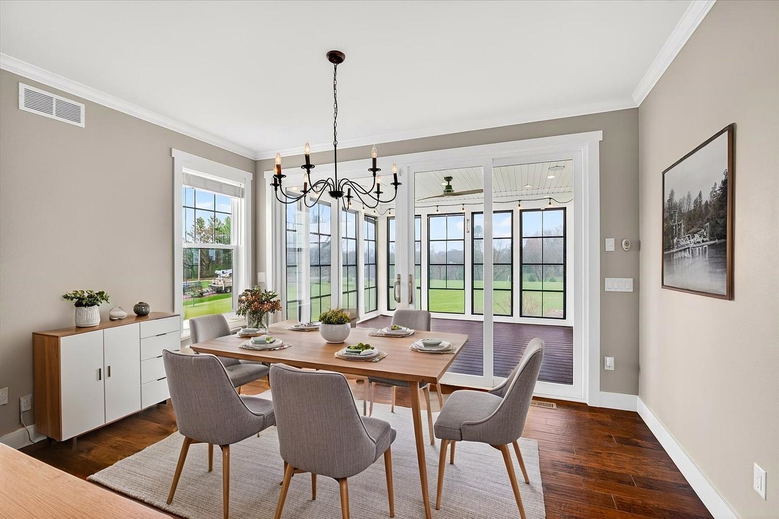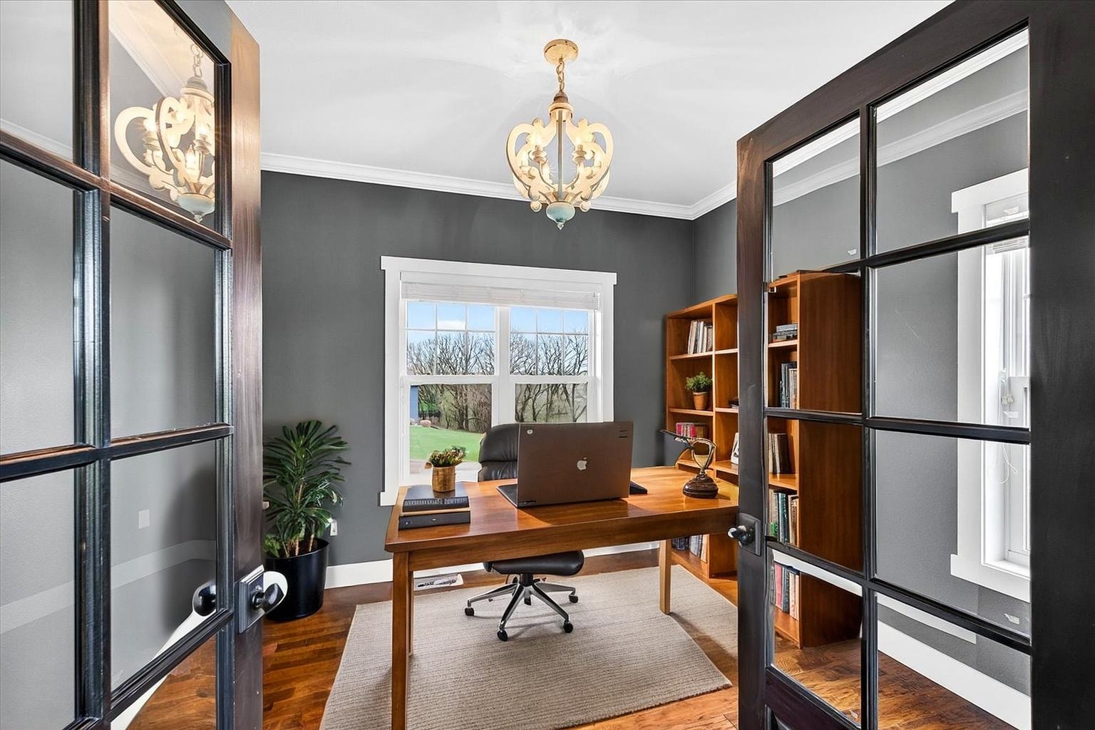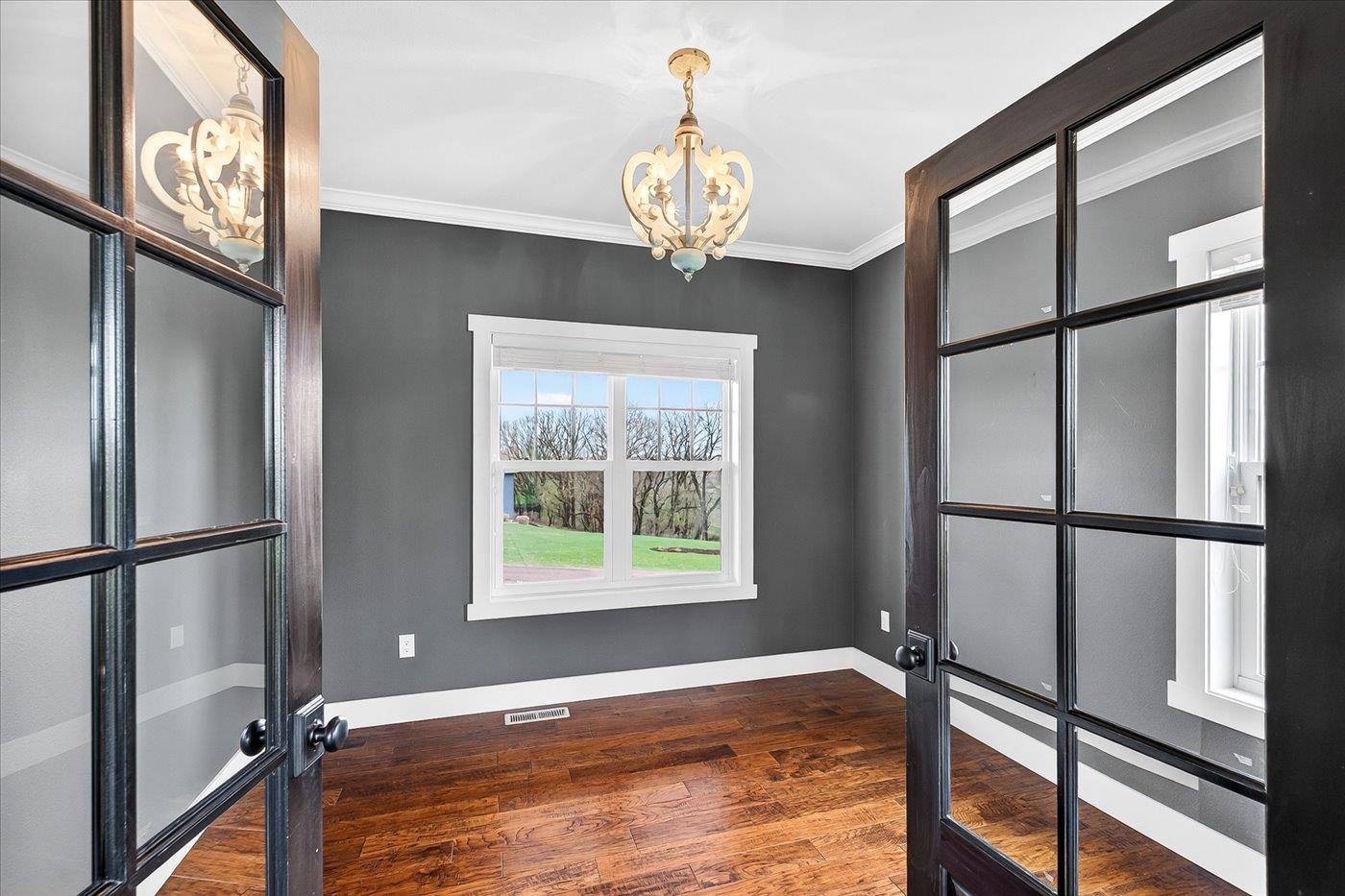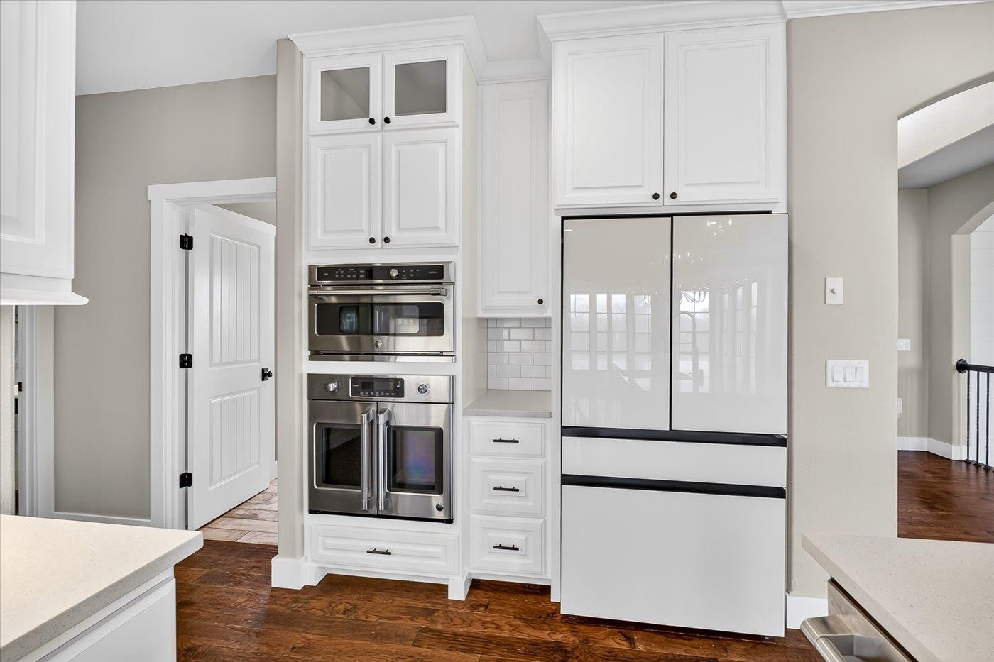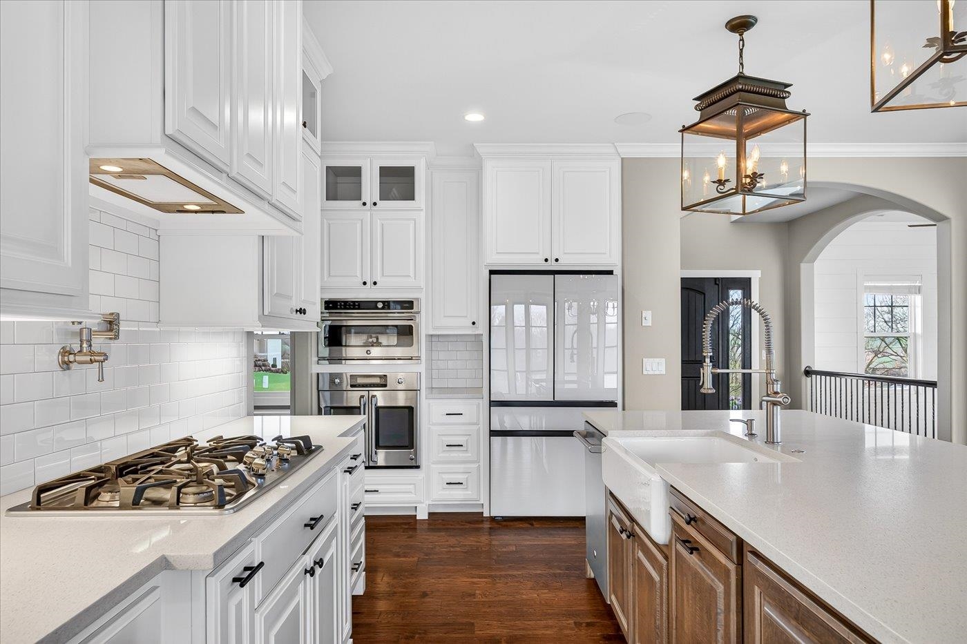 This 2017 Parade Home in Greenville offers 6 bedrooms, 4.5 bathrooms, and an exceptionally spacious layout. Zero-entry design adds convenience, while the upper level features a second primary suite tucked behind a hidden door. The open main living area is highlighted by beautiful stonework, a fireplace, built-ins, ceiling detail, and a large kitchen with attractive finishes. The dining area opens to a covered back patio overlooking a spacious backyard. The finished lower level offers a large rec room, additional bedrooms, a full bath, storage room, and unfinished flex space currently used as a workout room. Additional highlights 3-zone heating and a tankless water heater. Just a few blocks from Appleton airport and Chaska Golf Course, this home combines space, style, and flexibility.