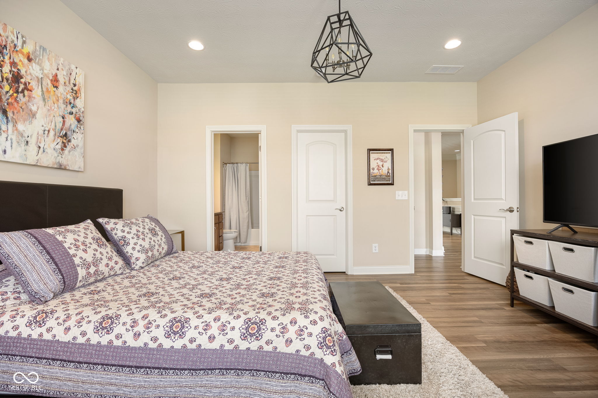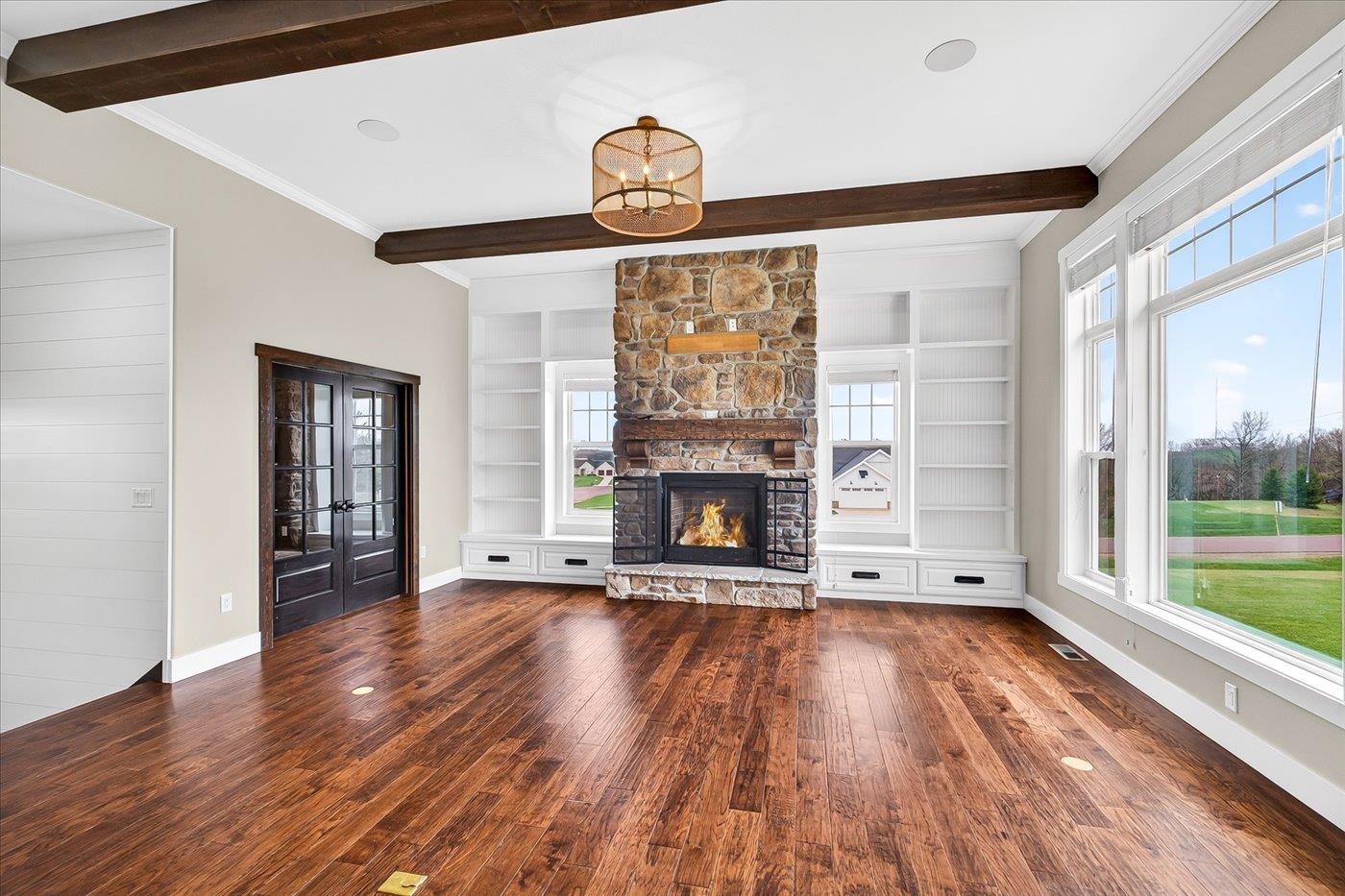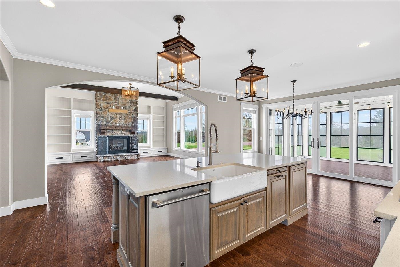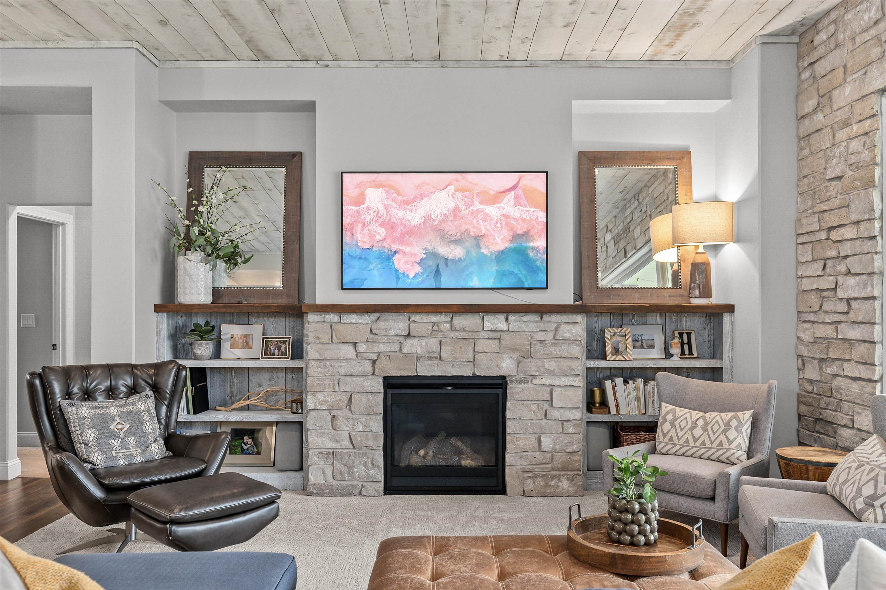 This 2017 Parade Home in Greenville offers 6 bedrooms, 4.5 bathrooms, and an exceptionally spacious layout. Zero-entry design adds convenience, while the upper level features a second primary suite tucked behind a hidden door. The open main living area is highlighted by beautiful stonework, a fireplace, built-ins, ceiling detail, and a large kitchen with attractive finishes.