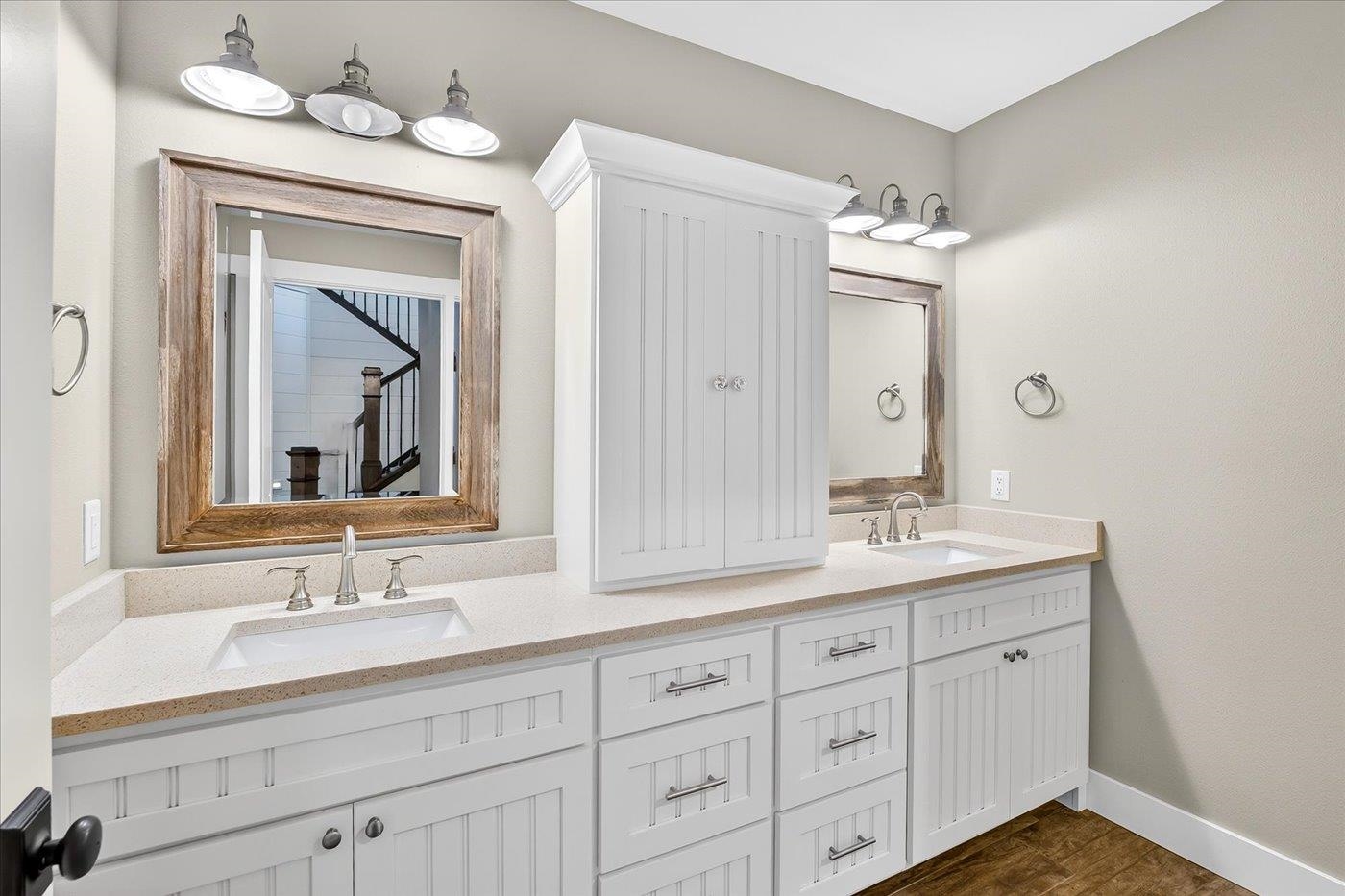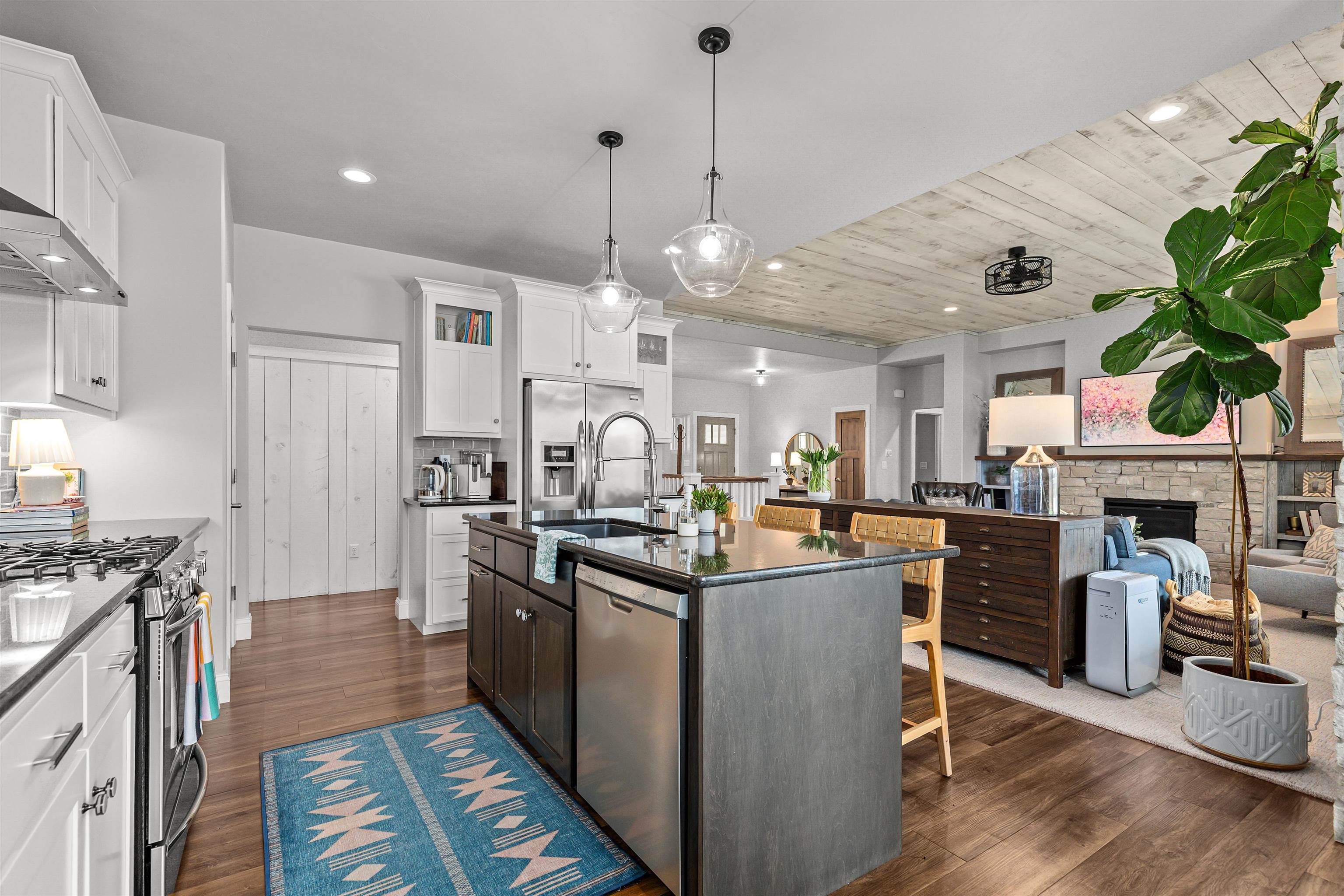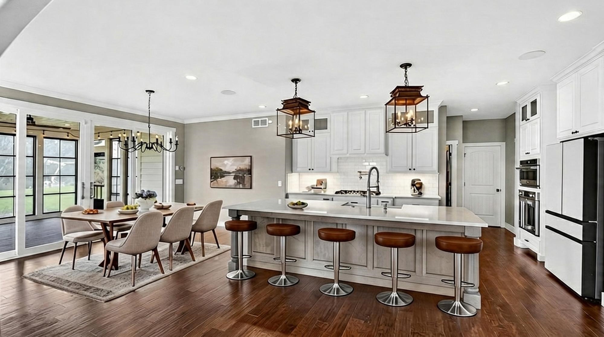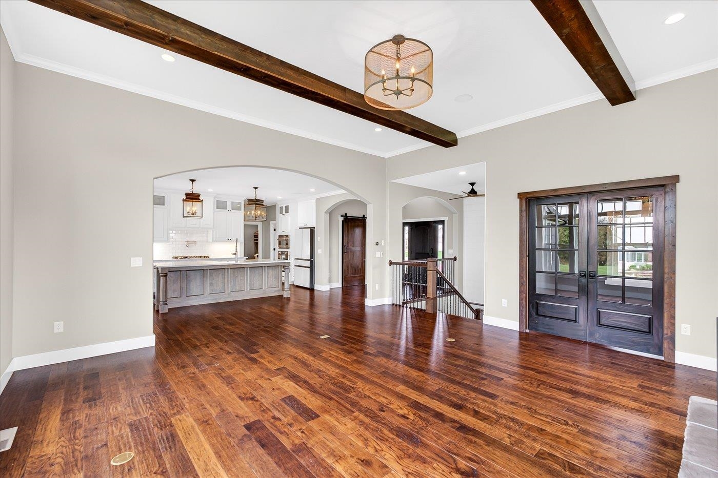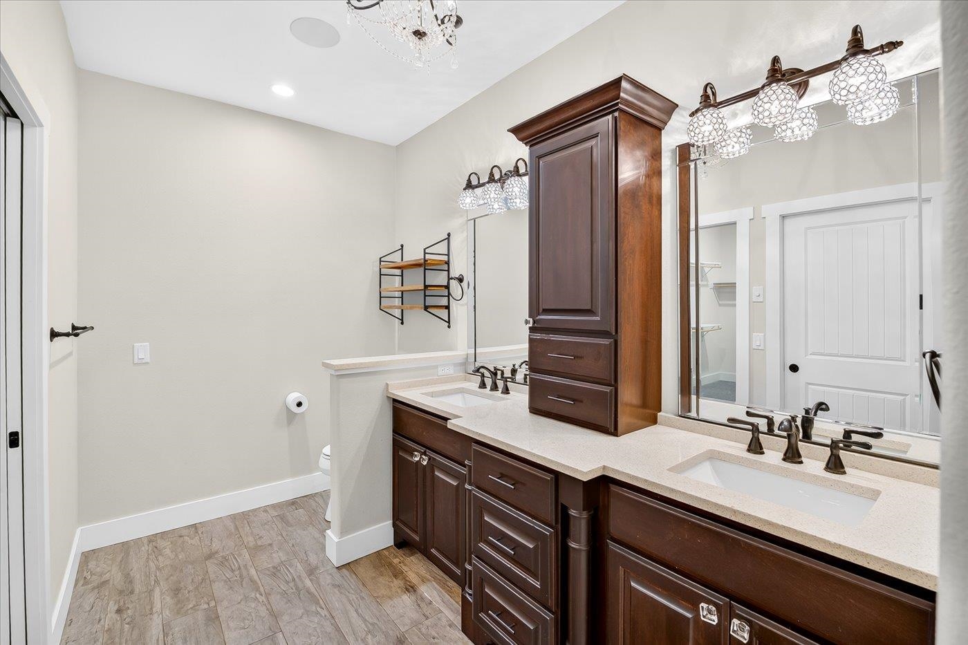 This 2017 Parade Home in Greenville offers 6 bedrooms, 4.5 bathrooms, and an exceptionally spacious layout. Zero-entry design adds convenience, while the upper level features a second primary suite tucked behind a hidden door. The open main living area is highlighted by beautiful stonework, a fireplace, built-ins, ceiling detail, and a large kitchen with attractive finishes.