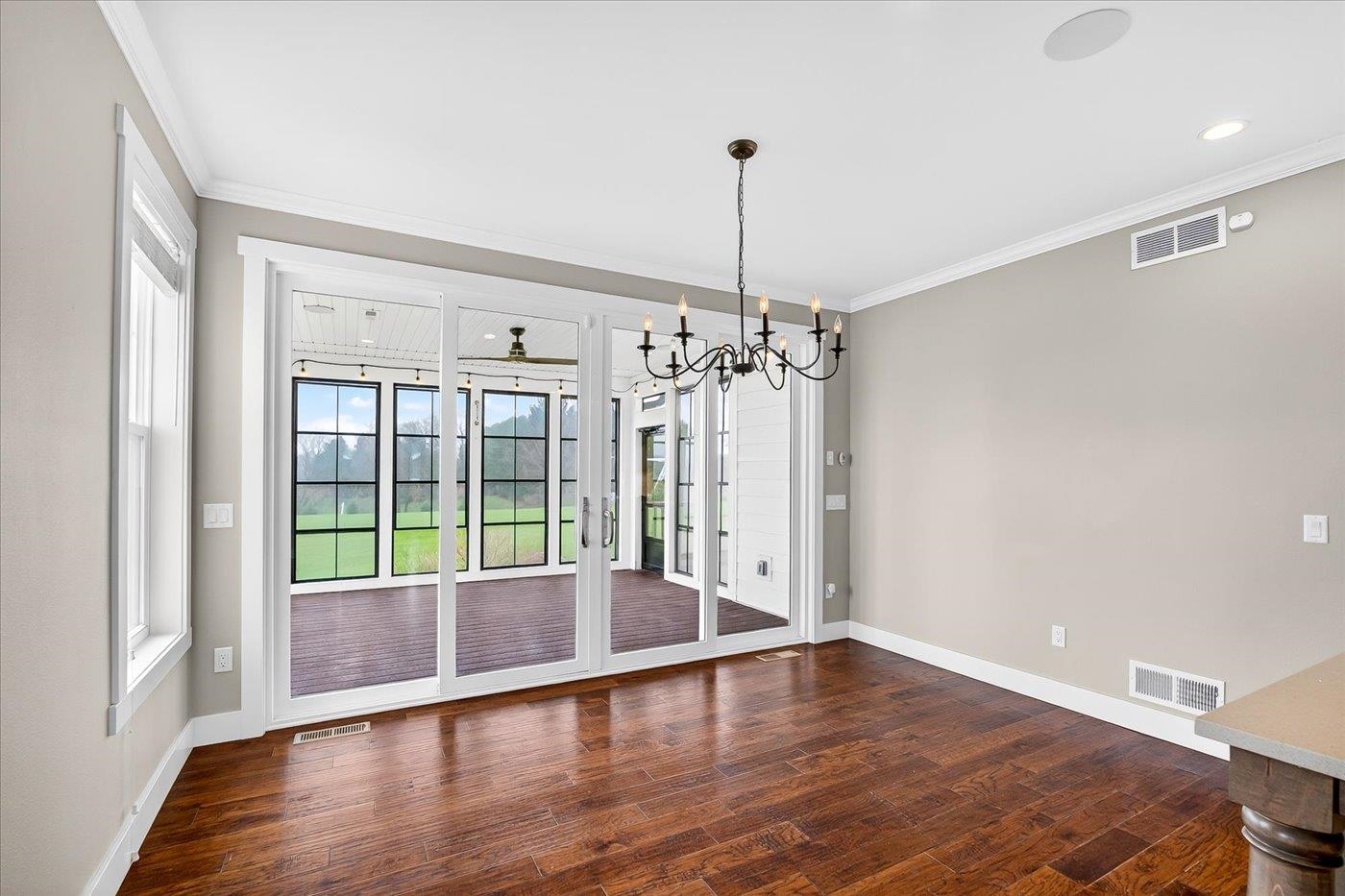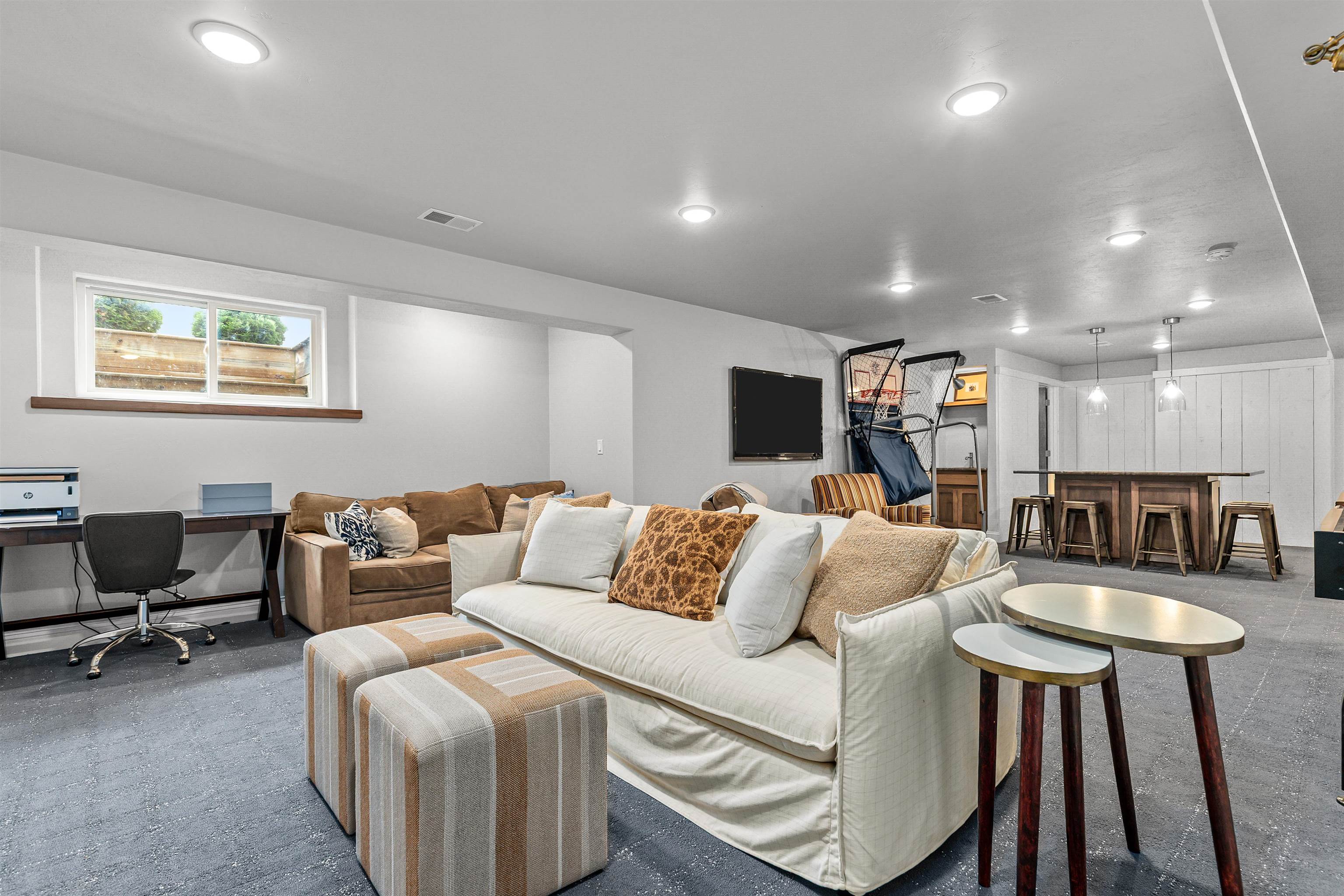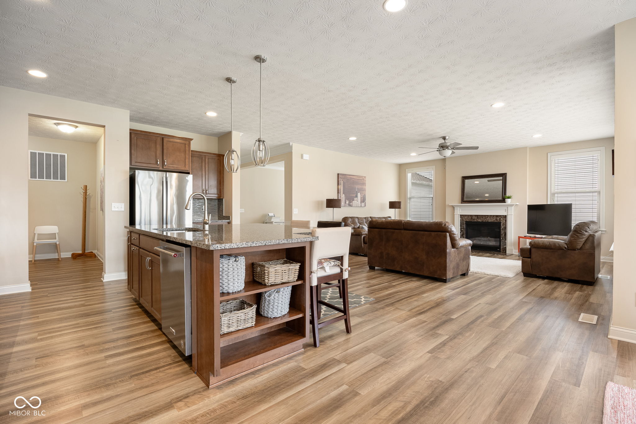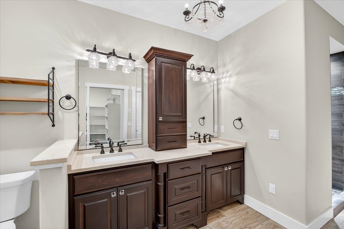 This 2017 Parade Home in Greenville offers 6 bedrooms, 4.5 bathrooms, and an exceptionally spacious layout. Zero-entry design adds convenience, while the upper level features a second primary suite tucked behind a hidden door. The open main living area is highlighted by beautiful stonework, a fireplace, built-ins, ceiling detail, and a large kitchen with attractive finishes.