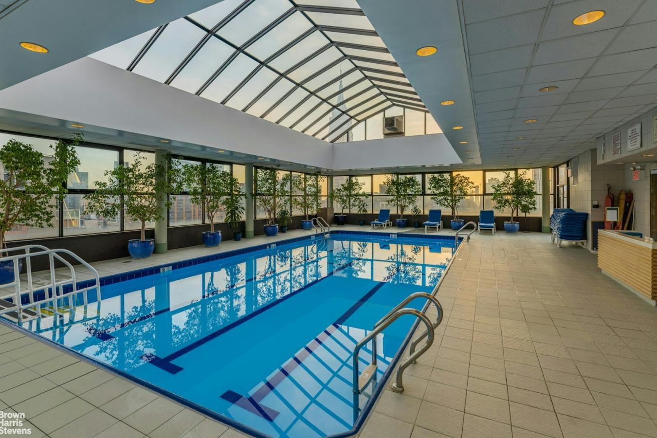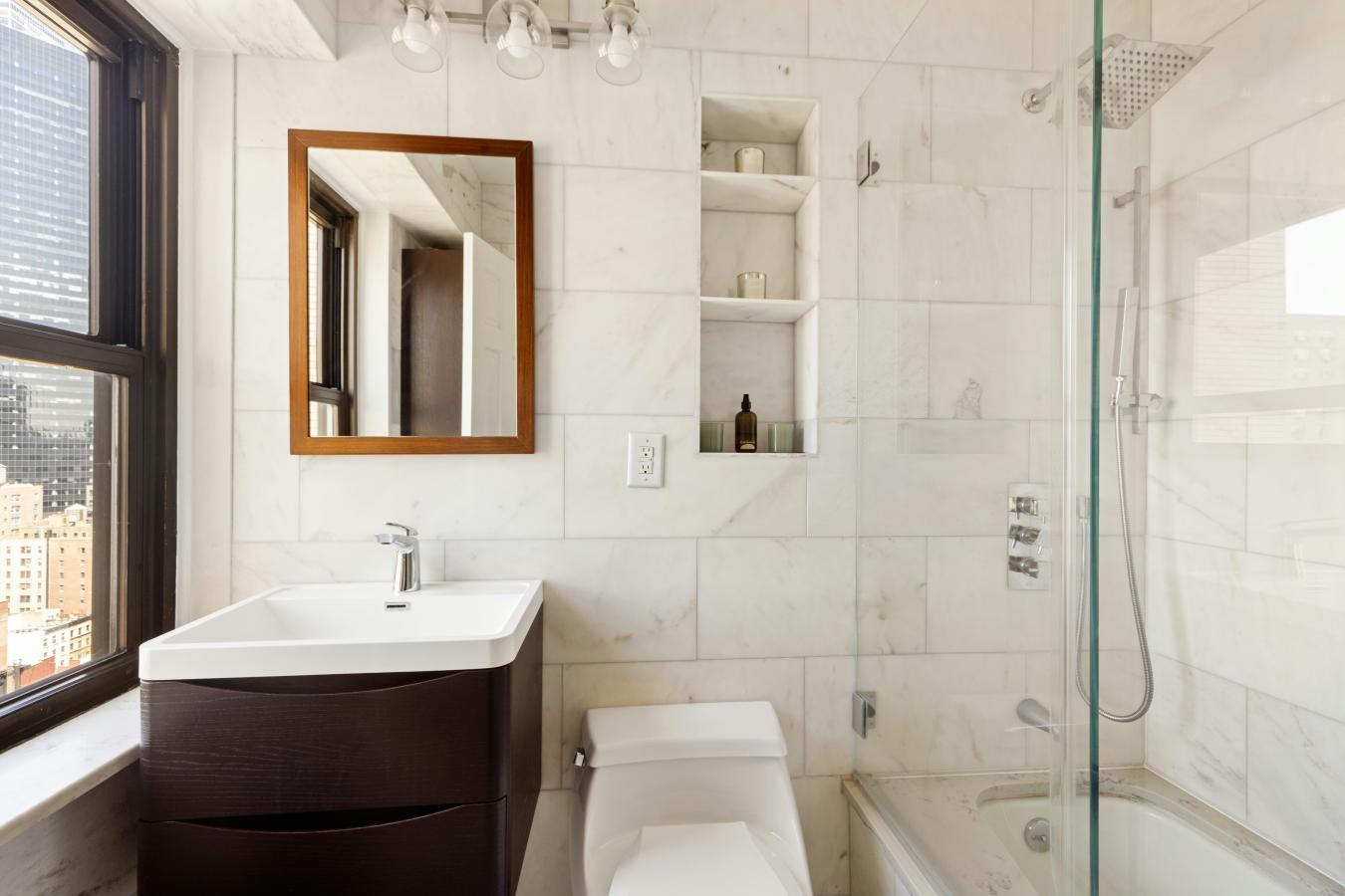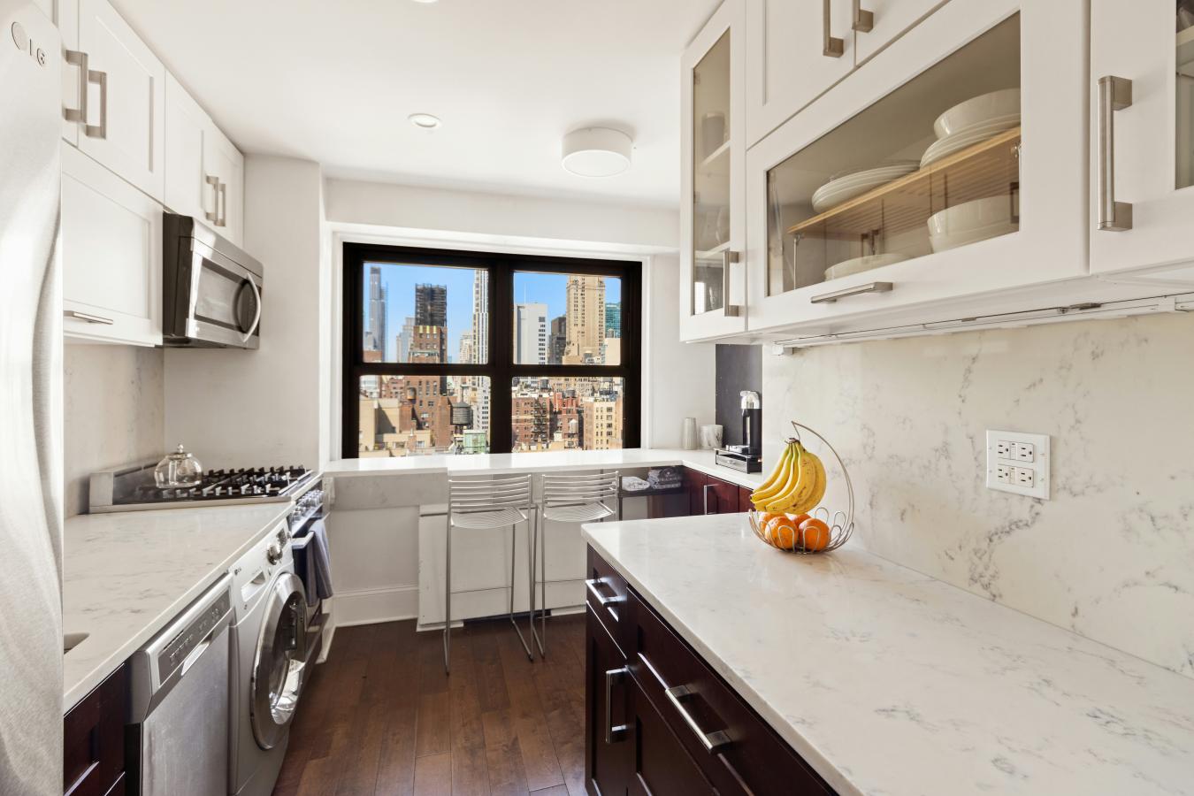 This high-floor, spacious two-bedroom, one-and-a-half-bath home has been totally transformed, with no details spared. An inviting home features an entry foyer that leads to a dining area and a very spacious living room with great light and northern cityscape views. Watch the lights change color at the Empire State Building from the den or 2nd bedroom as well as the double-windowed kitchen and windowed primary bedroom with amazing western views. The beautifully renovated and well-designed kitchen has custom cabinetry, quartzite countertops and backsplash, stainless appliances, a washer/dryer, and a breakfast bar to sip your coffee while taking in the views. Both the primary bath and powder room are finished in Carrera marble with elegant fixtures and spa-like details, including a thermostatic-controlled rain and handheld shower. Cleverly designed, your guests can access the bathtub from a door in the powder room. The primary bedroom is currently configured with a wall and pocket door that separates the sleeping area from a dedicated nursery. Easy to remove, it would fit a king-sized bed and more. From the beautiful oak hardwood floors, pocket doors, custom lighting, thermostats in all rooms, decorative molding, and plenty of closets, just bring your personal stuff and move on in! Located in The Murray Hill Mews, one of Midtowns finest luxury full-service buildings, rich in amenities all included in your maintenance. There is a rooftop indoor pool, roof deck, gym and sauna, resident lounge & a playroom. Garage on premises with direct access. This co-op allows pied--terres and pets under 20 lbs. and co-purchasing and guarantors are permitted on a case-by-case basis. Conveniently located in prime Murray Hill near Grand Central and NYU Hospital, top restaurants, and shopping, including Trader Joes and Fairway Market. Easy show, so schedule an appointment right away!