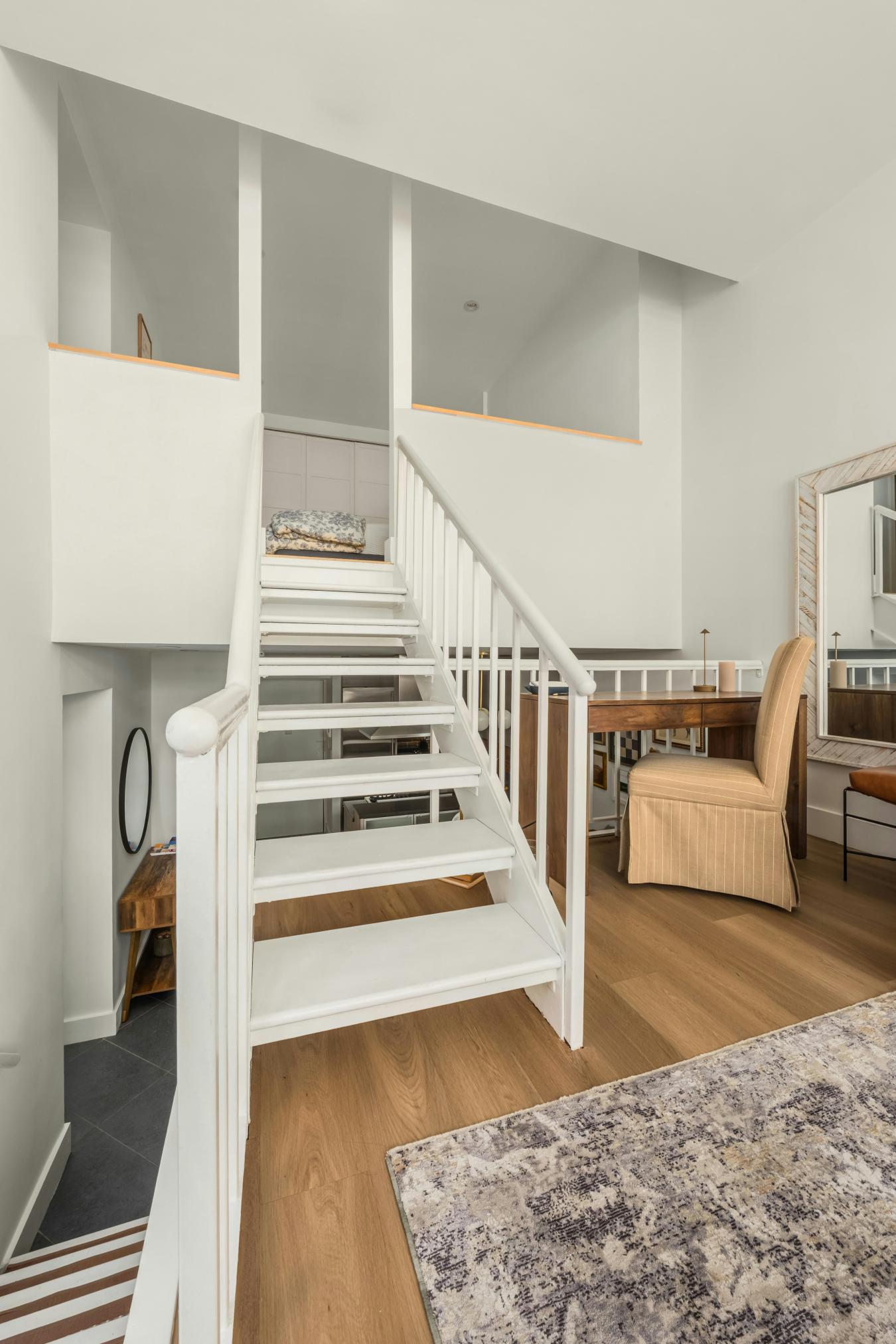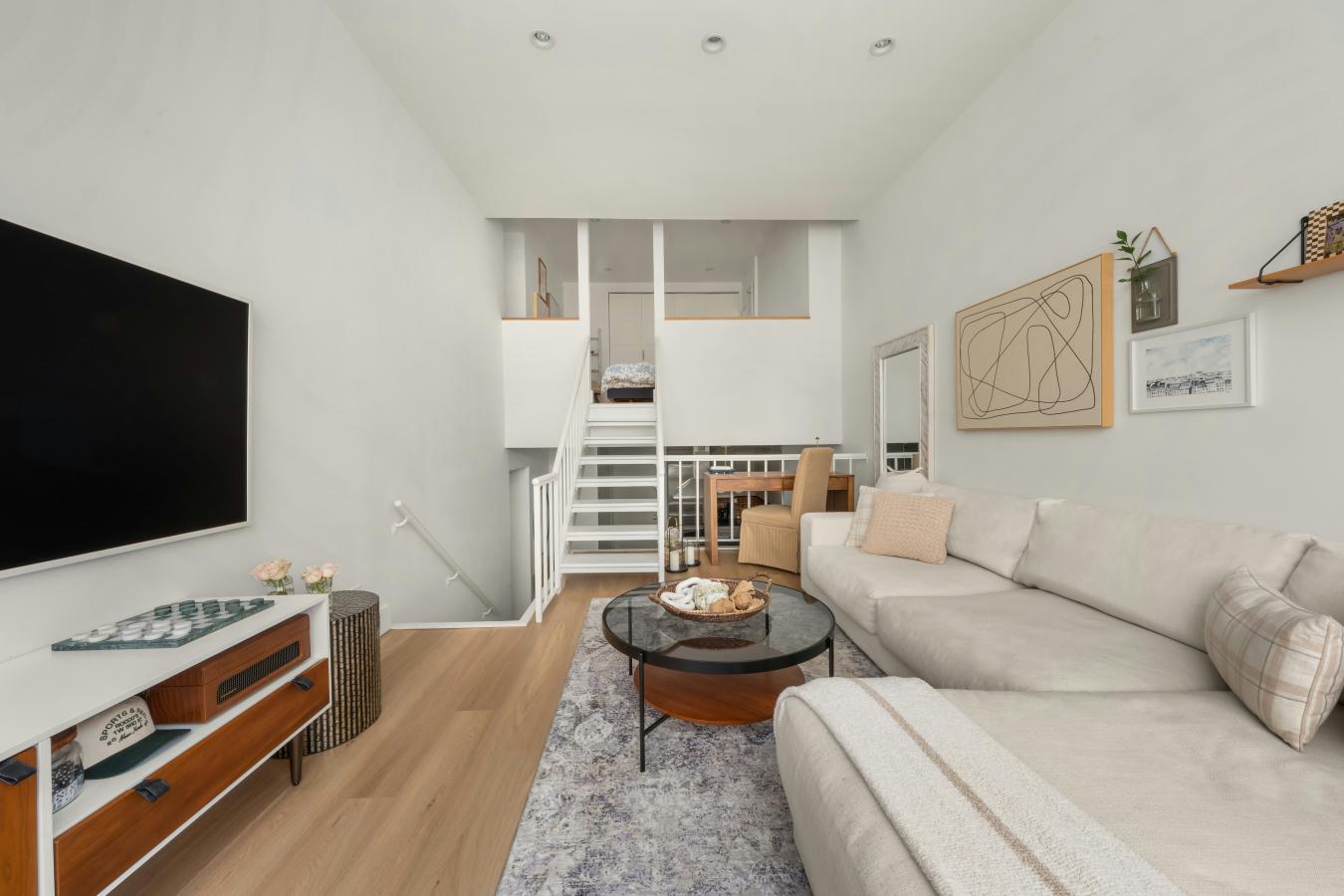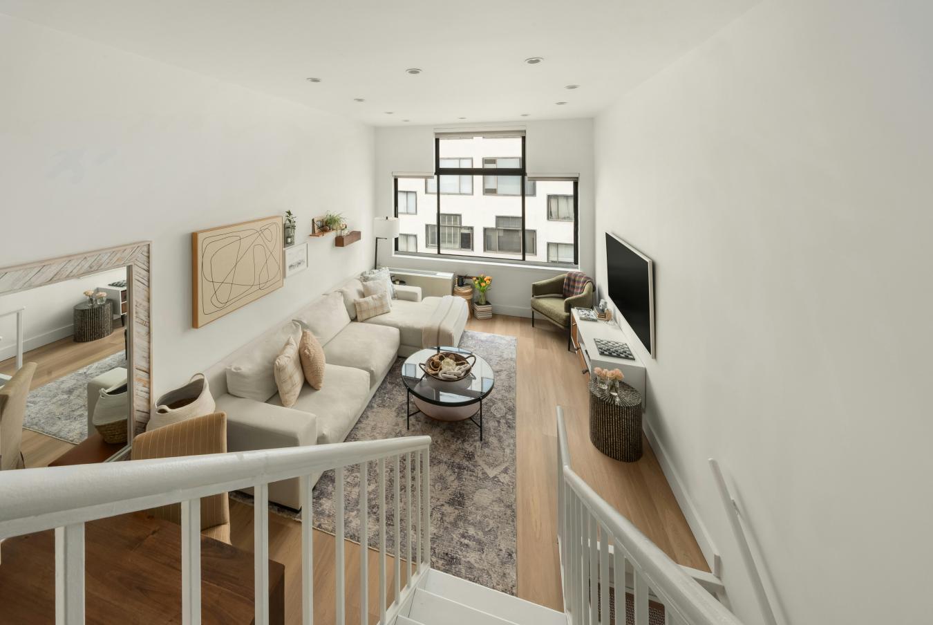 Welcome home to Apt 822, a beautifully maintained, light-filled one-bedroom, two-bathroom triplex ideally situated in the heart of Greenwich Village. Spanning three levels, the home offers an airy, loft-style layout with a dramatic double-height living room highlighted by expansive west-facing windows that bathe the space in natural light.
