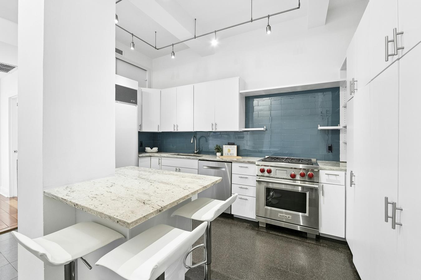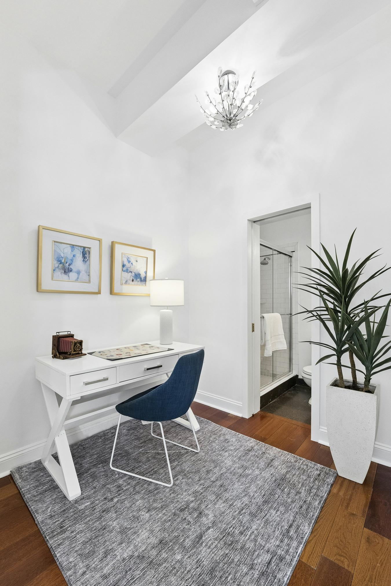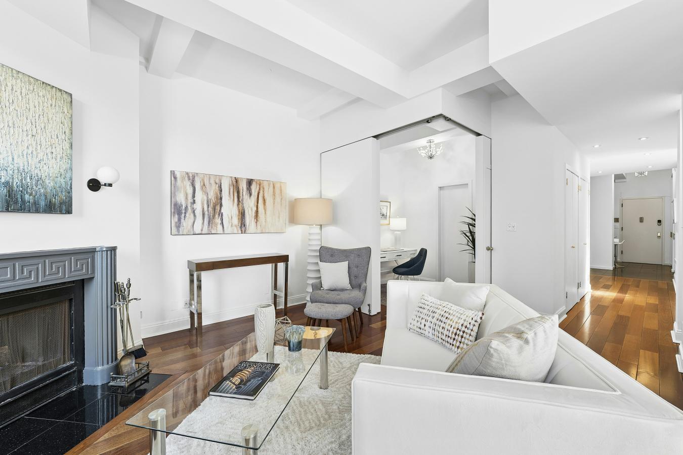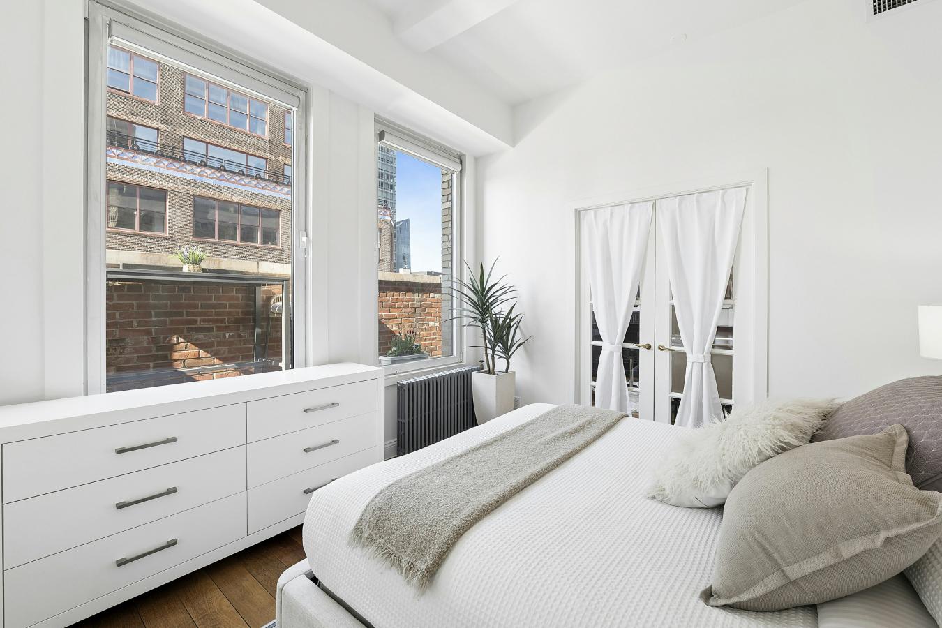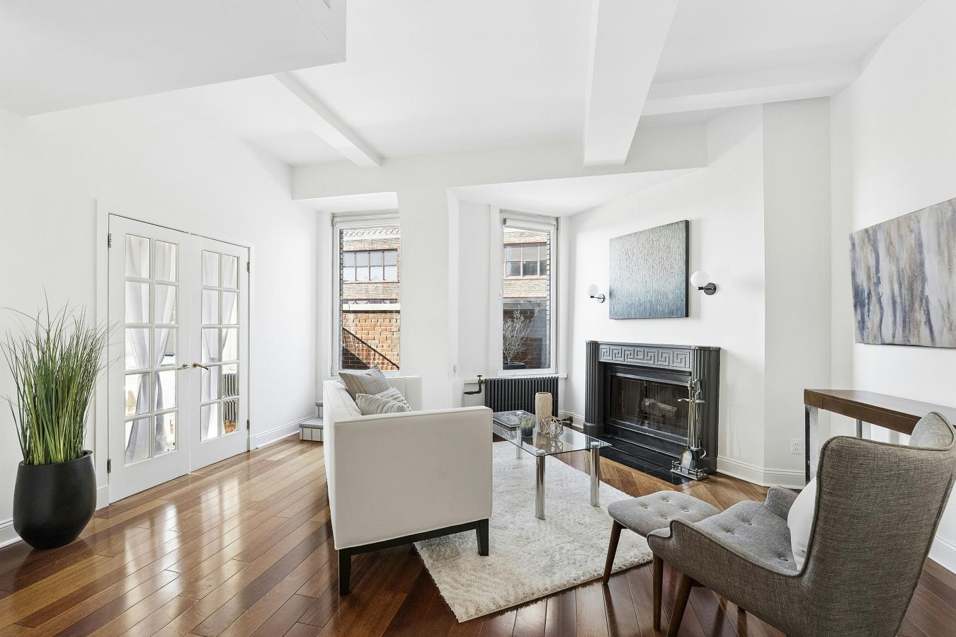Rare High Floor Pre-War One Bedroom / Two Bathroom with Fireplace Boasting Terrace and Striking Views in NoMad This rarely available NoMad loft home suits the discerning eye, meeting all of your lifestyle needs. The 10-foot beamed ceilings (even higher in the kitchen) throughout set the tone.
