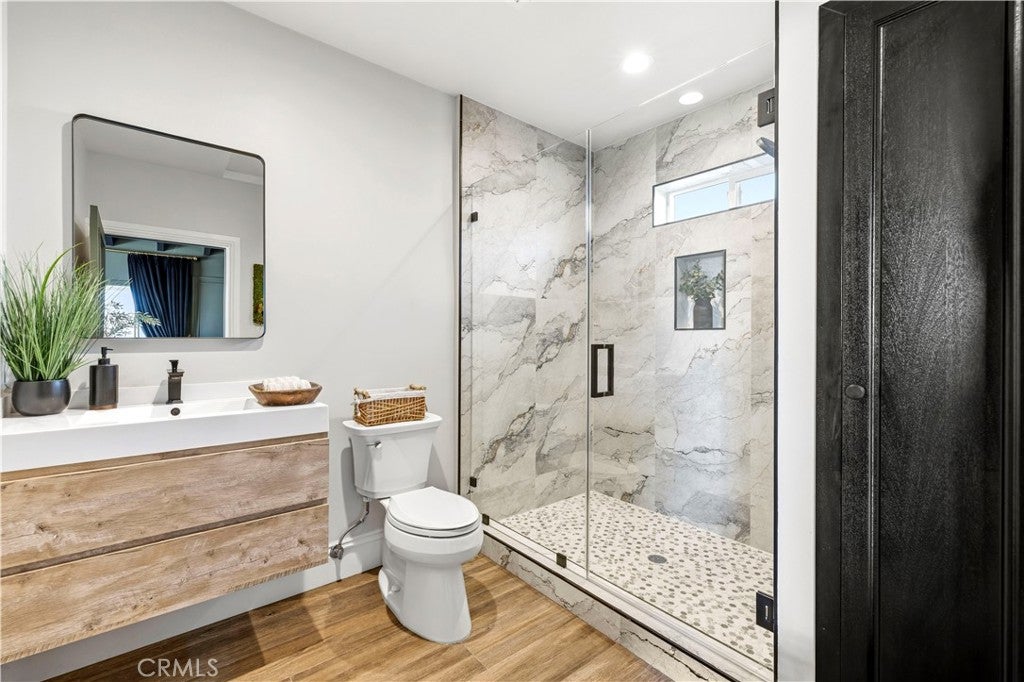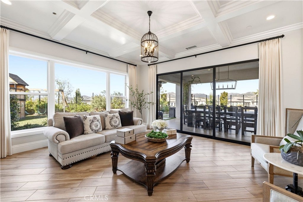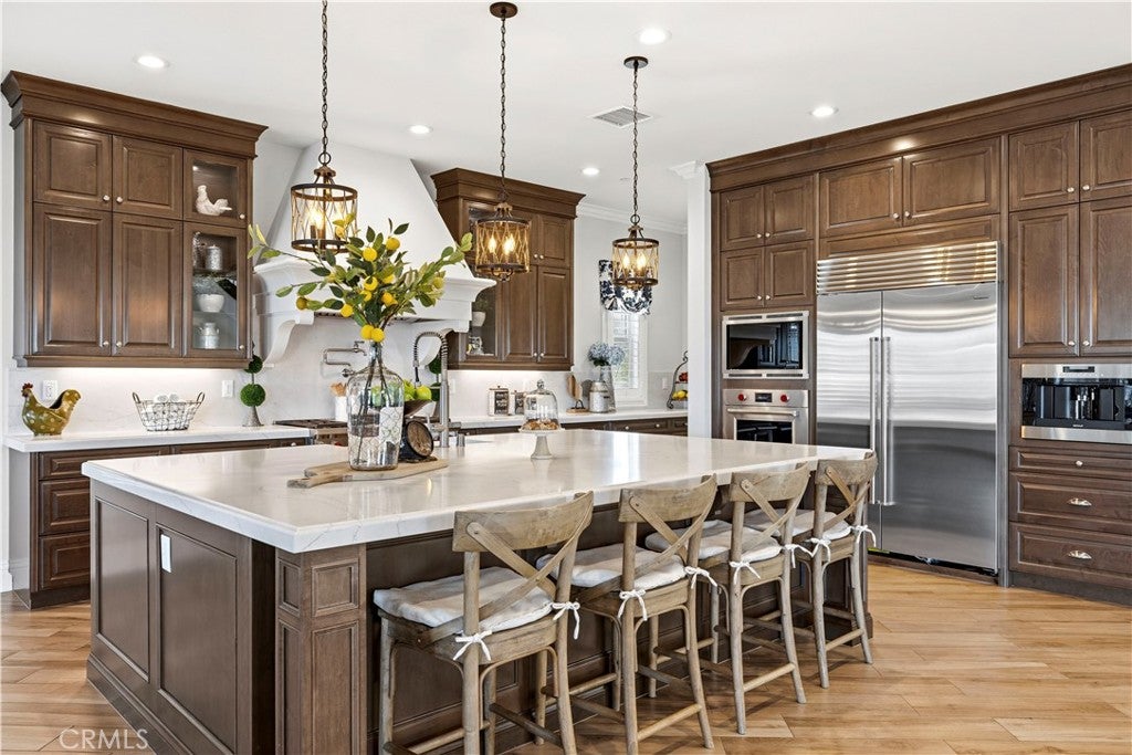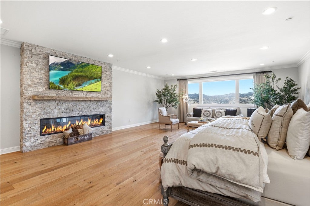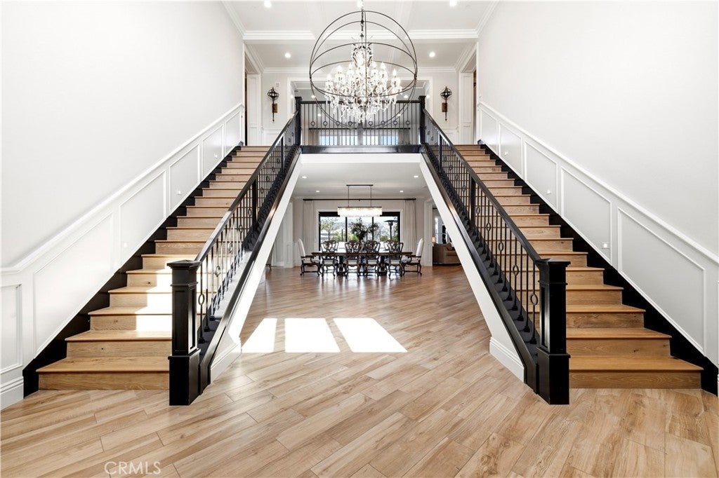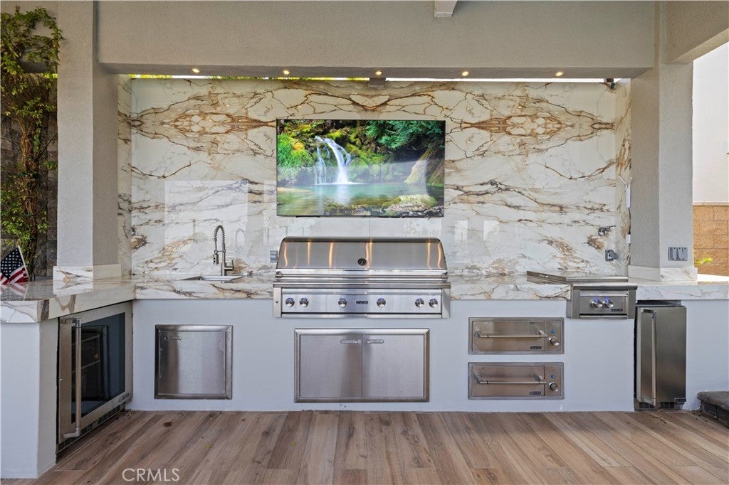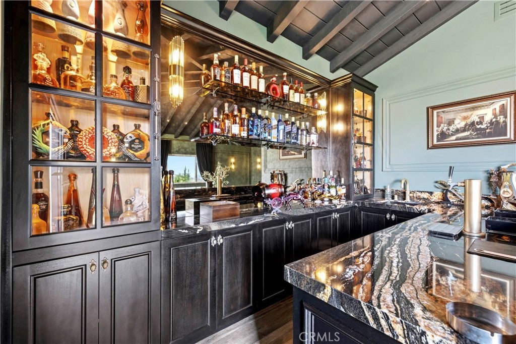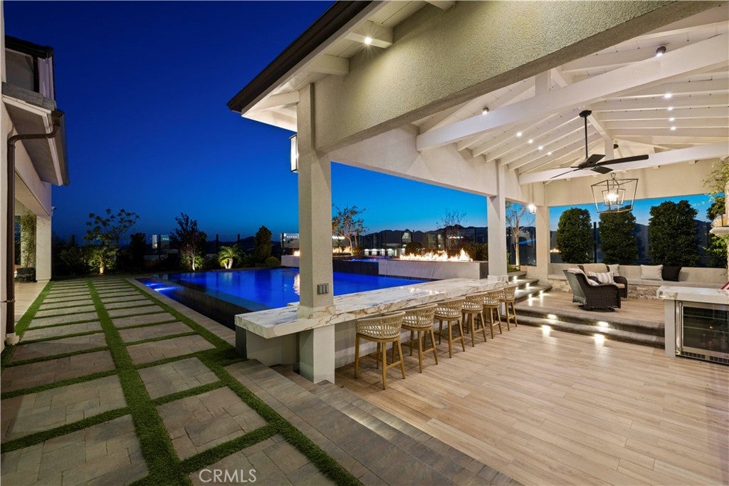 Behind the gates of the prestigious Skyline collection in the guard gated Westcliffe community of Porter Ranch, this exceptional 5 bedroom, 7 bath estate is tucked away at the end of a quiet cul de sac on a 14,498 sqft lot, offering rare privacy and some of the best views in the community. With approximately 6,572 sqft of living space, including a 5,996 sqft main residence and detached 576 sqft ADU, this home blends scale, warmth, and elevated design in all the right ways. A beautifully designed driveway, mature landscaping, and warm exterior lighting create a grand yet inviting arrival. Inside, a dramatic foyer with striking dual staircases, coffered ceilings, detailed wainscoting, and soaring ceilings sets the tone. The main level also features a downstairs bedroom with full bath and a private office. The chefs kitchen is both stunning and functional, appointed with Wolf appliances, upgraded cabinetry, a custom hood, pot filler, and natural quartzite countertops. The family room is anchored by an elegant stacked stone gas fireplace and premium in ceiling speakers, while throughout the home youll find custom millwork, solid wood doors, upgraded California doors, designer drapes, remote controlled window treatments, wood like tile flooring downstairs, and wood flooring upstairs. The expanded primary suite is a true retreat with its own custom fireplace, remote controlled bath drapery, and a handcrafted custom closet featuring two massive islands. Additional upgrades include upgraded linen cabinetry, Life Source whole house water filtration, hard wired 360 degree security cameras, and a Tesla charging port with overhead storage. The backyard is a true resort, with over 1 million invested in yard improvements, featuring a saltwater pool with dramatic water and fire features, a separate fire pit, Sonos speakers, app controlled pool, lighting and music, and a covered outdoor entertaining area with beamed ceilings, fireplace lounge, and full Lynx outdoor kitchen with an extra large grill, gas range, two food warmers, fridge, and ice machine. The detached ADU is set up as the ultimate speakeasy style bar and entertaining space with handmade mahogany cabinetry, vintage style mirrors, beer tap, Fisher and Paykel dishwasher, fridge, ice maker, AC and heat, and a large bath with oversized shower. Surrounded by fruit trees, grapevines, herbs, and lush landscaping, this is a rare Westcliffe offering that delivers unforgettable presence and timeless appeal.