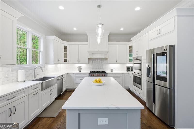 Recently Constructed, this 4-Side Brick Executive Home, the last home built in Prestigious Prestwick (7 years old), walking distance to Atlanta Athletic Club and Perimeter Christian School. Sitting beautifully on the 1.99 Acres, it has the 2nd Largest Lot in Prestwick. Lush landscaping and hardwood trees give total privacy to this perfectly flat cul-de-sac lot with tons of space for a pool, hot tub, tennis/pickleball court, fire pit, playground, or other endless possibilities for Outdoor Entertainment. Beautifully crafted QUALITY Construction with Spacious Guest Suite and Full Bath plus 1/2 Bath on Main Floor, up to date finishes and top of the line appliances, including Stainless Farm Sink, Custom Imported Metal Double Front Doors, Premium Quality Wolf Gas Stove, Wolf Double Oven, Custom White Cabinets throughout with Soft Close Hinges, Iron-Spindle staircases, Oak Hardwood Floors on main and 2nd floor, Large Owners Suite with Hardwood Floors, Sitting Room with Fireplace and Spacious His/Hers Walk-In Closets. White Marble Bath with large waterfall Shower and Soaking Tub, 3 additional spacious secondary bedrooms up, each with own private bath. Finished Full terrace Level with lots of natural light, marble surround gas log fireplace, and low maintenance Wood-Look Tile Floors. Space Stubbed for wet bar or Kitchenette. Space was designed with Beauty, Quality and Functionality as top priorities. Close proximity to Johns Creek High School,Wesleyan Schools, and The Forum. Understated Elegance in Johns Creek!
