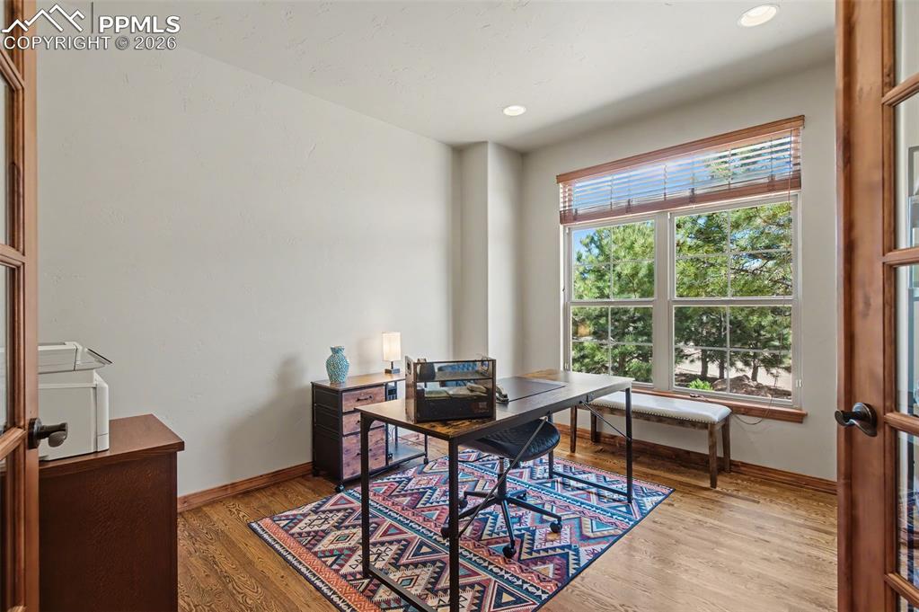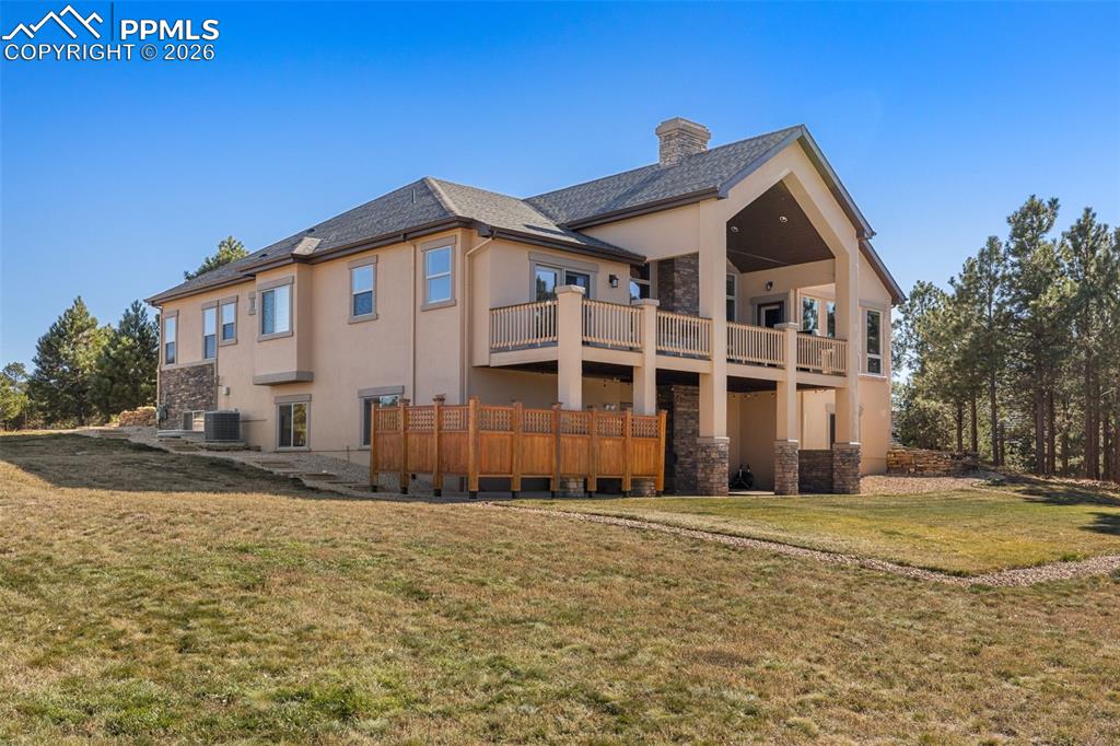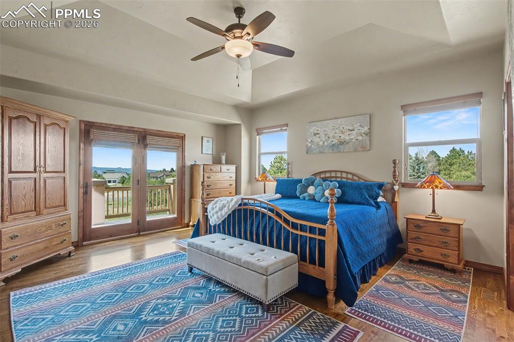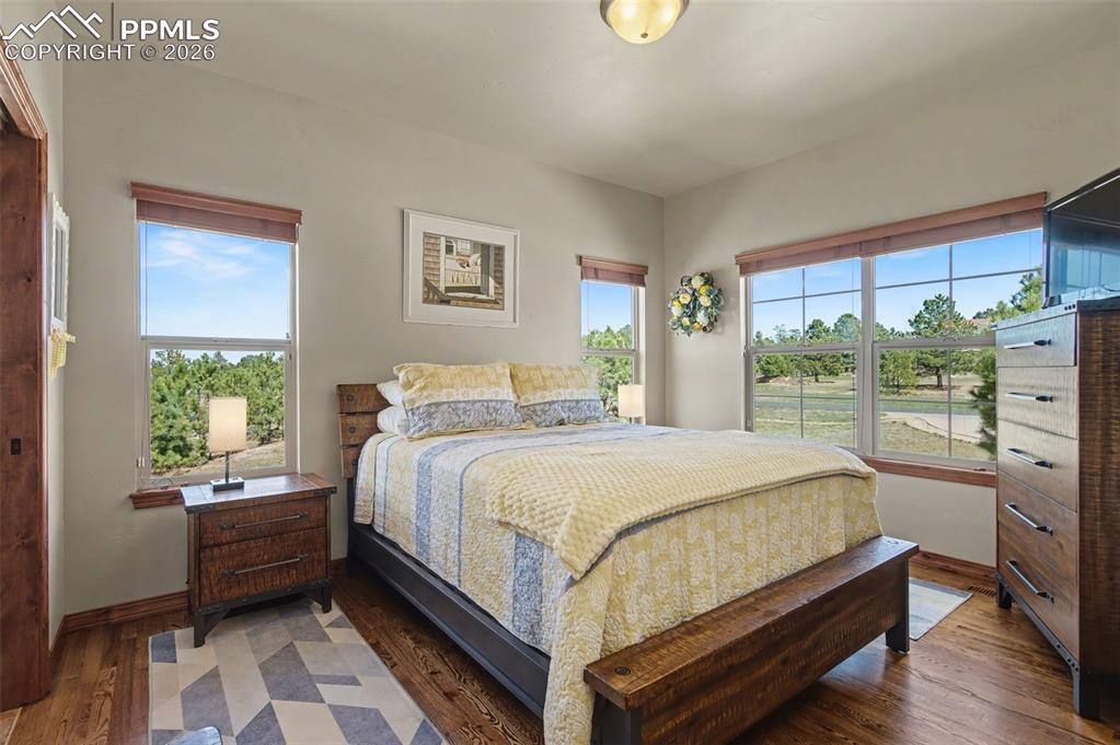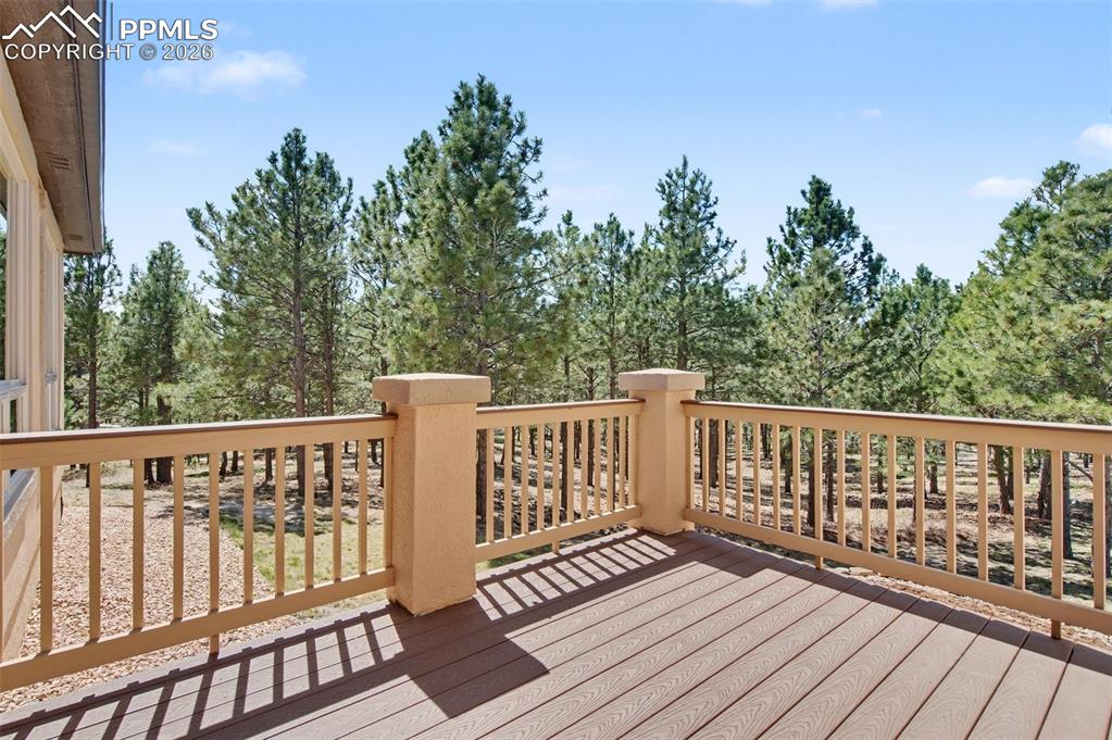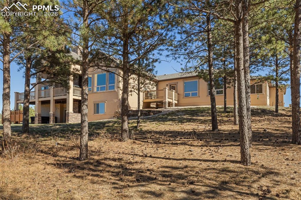 Nestled in sought-after High Forest Ranch, this luxurious ranch-style home offers breathtaking mountain views from every level, gorgeous upgrades, and wonderful amenities. Step inside and beautiful hardwood floors beckon you into the great room, featuring a vaulted, beamed ceiling, and stone indoor/outdoor fireplace. The great room seamlessly connects to the gourmet kitchen, dining area, and a walk-out to the deck- perfect for dining al fresco. Channel your inner chef with an oversized island, granite countertops, walk-in pantry, and stainless-steel appliances including a double oven and gas range with beautiful range hood. Retreat to the spacious primary suite featuring gorgeous mountain views, walk-out to the deck, and ensuite 5-piece bath with walk-in closet. The convenient laundry room and mudroom is off of the attached 3-car garage, which offers ample storage and convenience. Pass through the laundry room to access the casita, featuring a private entrance, bedroom, bathroom, well-appointed kitchen, dining area, living room, enclosed deck, and attached 2-car garage. Back in the main house, another bedroom with ensuite bath, office, and powder room round out the main level. Downstairs features an expansive family room with wet bar, cozy fireplace, and walk-out to the covered patio with hot tub, perfect for relaxing at the end of the day. Two additional bedrooms with walk-in closets, full bathroom, and a large storage space provide endless opportunities for guests, home gym, work space, craft space, and more. This impeccably cared-for home boasts central vacuum and smart home thermostat. With acreage for gardening, lawn games, and more, this backyard is a hosts dream. This picturesque, gated neighborhood offers countless amenities including parks, trails, tennis courts, and a club house with community gatherings, designed to foster lasting friendships. Enjoy luxury Colorado living at its finest- Schedule a showing to see this magnificently upgraded home today!