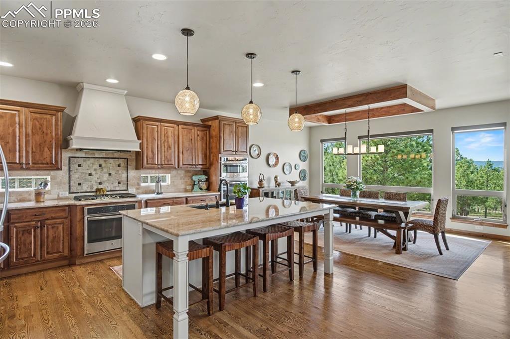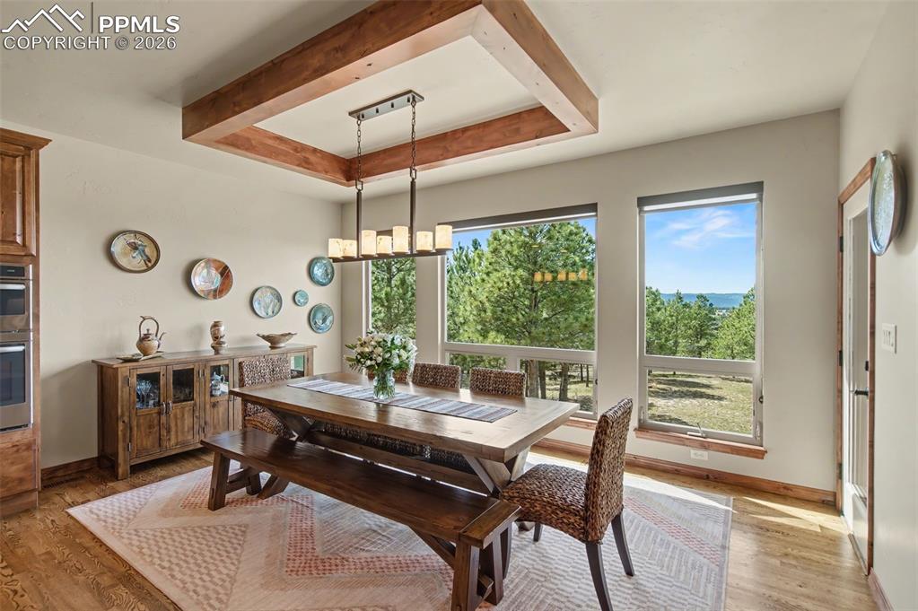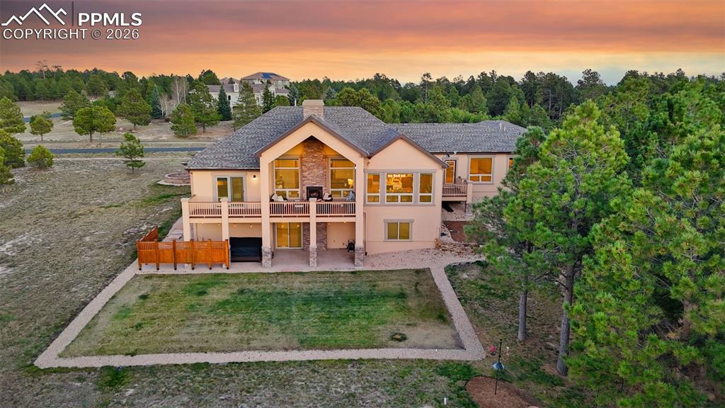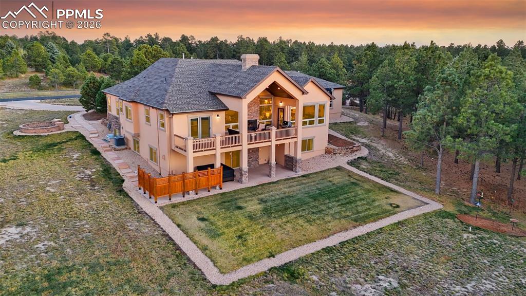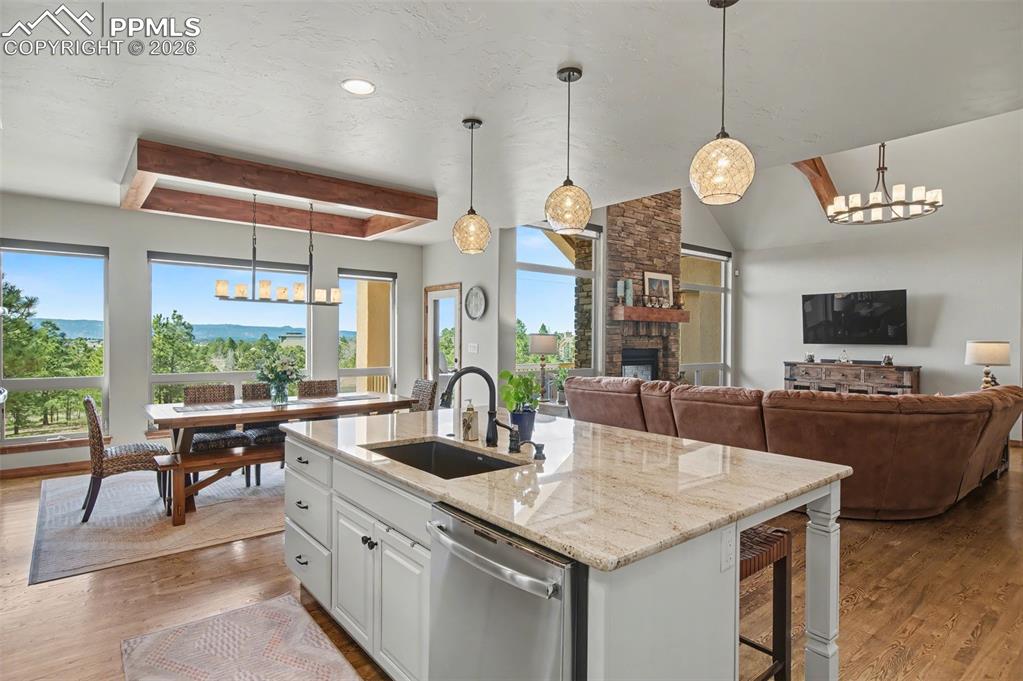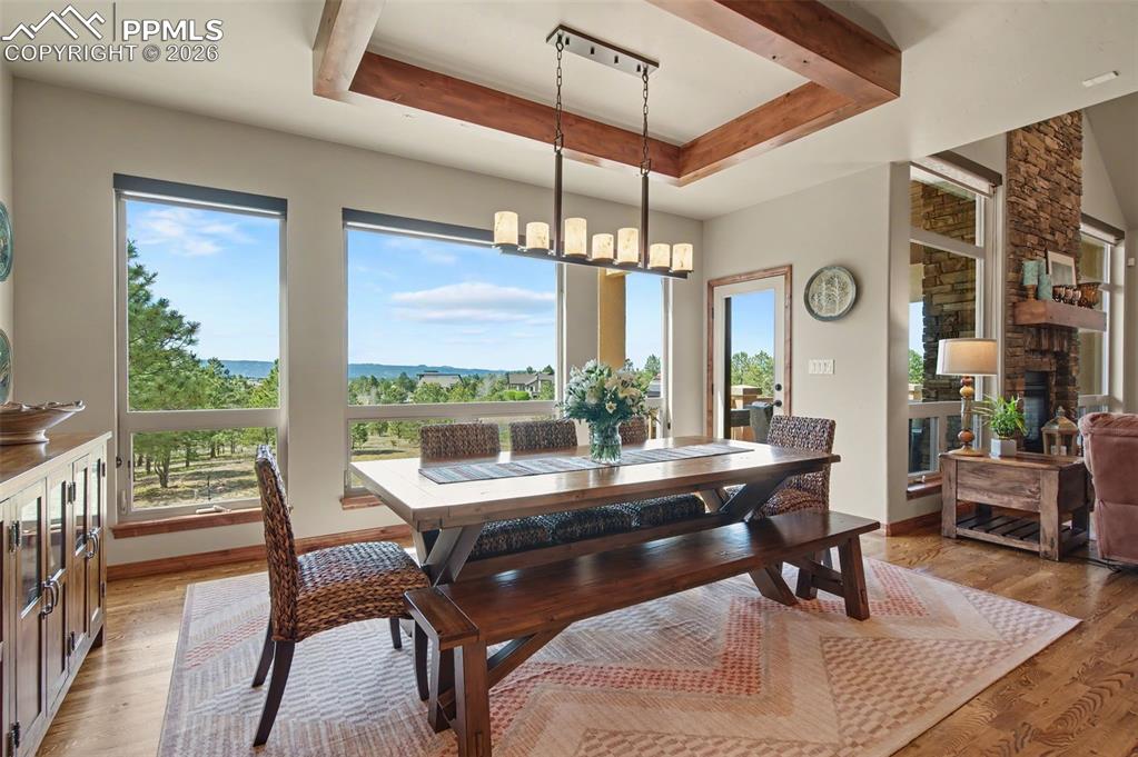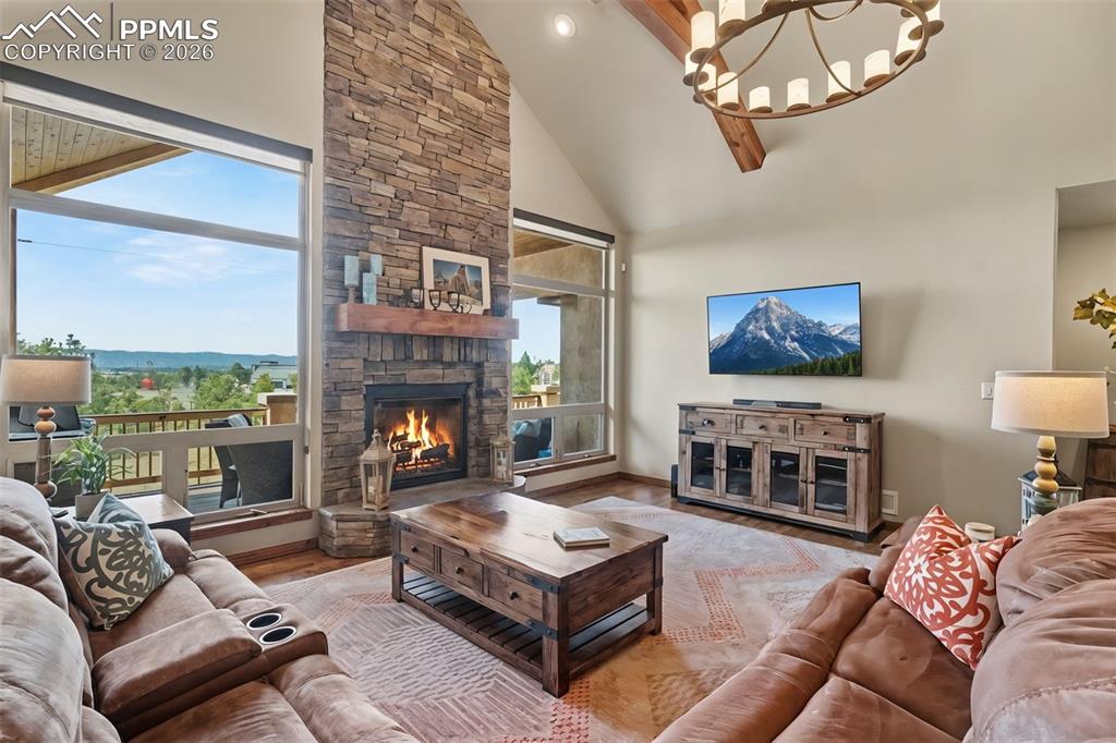 Nestled in sought-after High Forest Ranch, this luxurious ranch-style home offers breathtaking mountain views from every level, gorgeous upgrades, and wonderful amenities. Step inside and beautiful hardwood floors beckon you into the great room, featuring a vaulted, beamed ceiling, and stone indoor/outdoor fireplace.