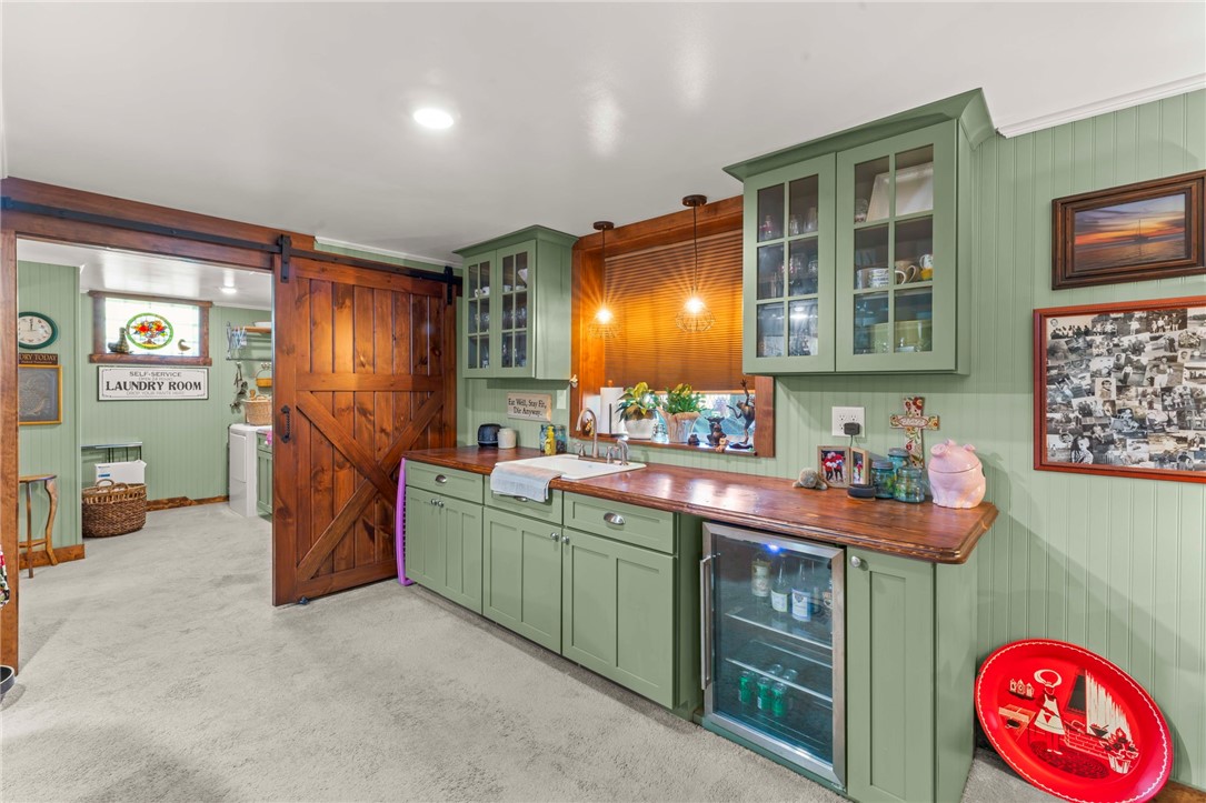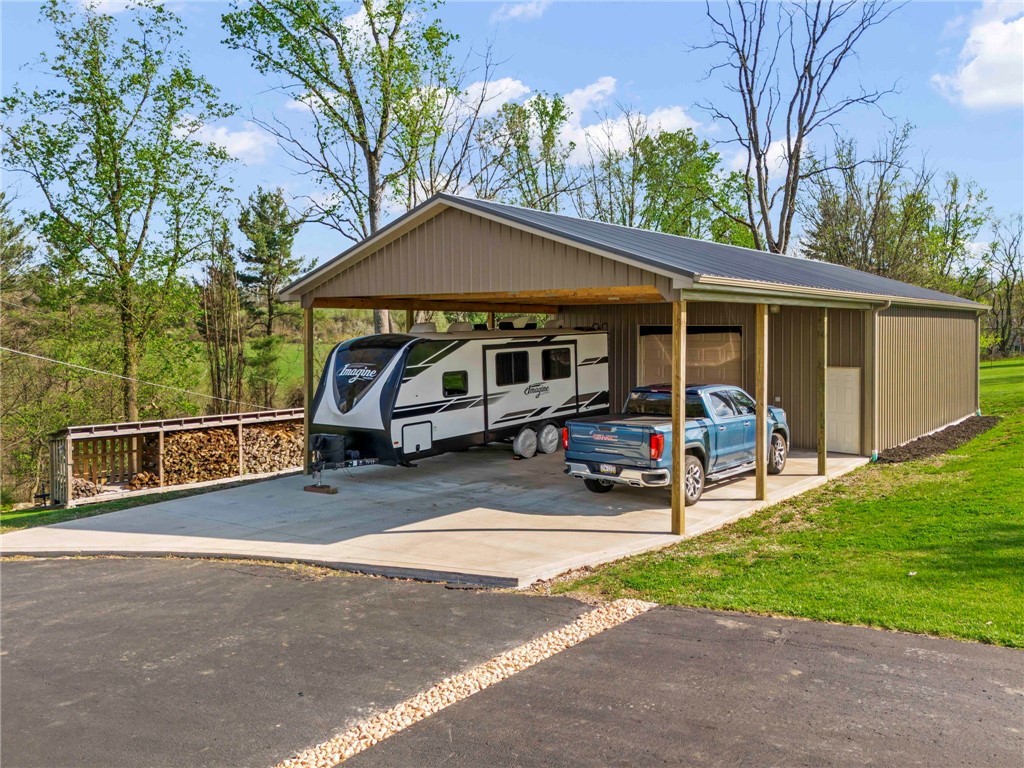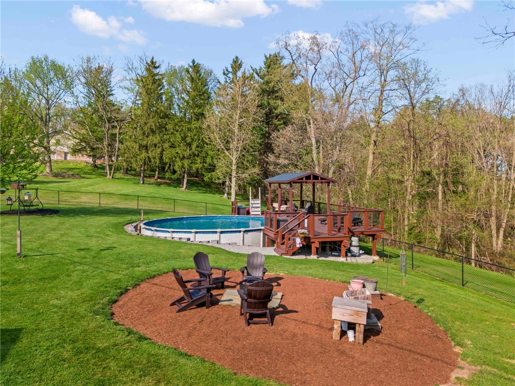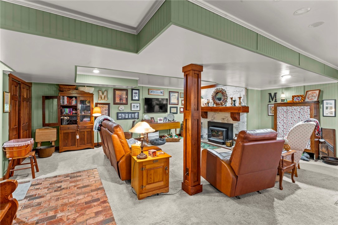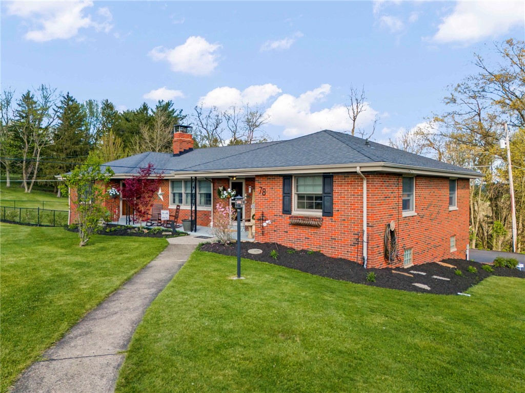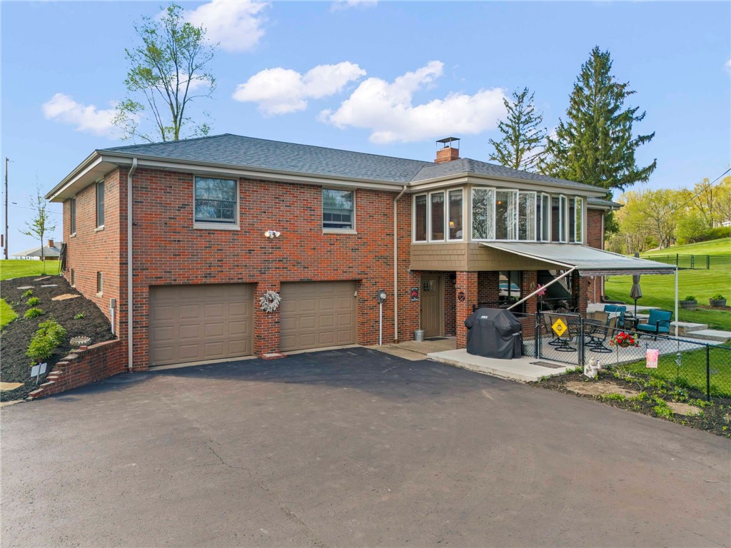 Sprawling 3 Bedroom Brick Ranch Nestled on 5 Acres Completely Redone Inside & Out! Beautiful custom craftsmanship abounds, custom entry closet & storage bench, spacious & relaxing living room featuring a coffered ceiling, fireplace with gas logs & custom built-ins, dining area open to the updated kitchen boasting quartz tops, custom cherry KraftMaid cabinetry with pullouts & organizers, rechargeable LED lighting under cabinets, farmhouse sink, tile backsplash, stainless appliances, shiplap ceiling, hardwood flooring & breakfast bar, enclosed sunroom with wood panel walls, electric baseboard heat, shiplap ceiling, custom wood archway, tile flooring & casement windows with screens and beautiful view of the tree lined rear yard, expansive primary bedroom suite complete with custom built-ins, shiplap ceiling, hardwood flooring, full bath featuring wood paneled walls with chair rail, cast iron clawfoot bathtub & tile flooring, 2 closets & a spacious walk-in closet with pulldown attic stairs that could also be used as a den or 4th bedroom, 2 additional generous sized bedrooms & full hall bathroom, finished walk-out lower level features a refinished fireplace with German schmear technique, kitchenette featuring custom cabinetry, wood countertop, beverage cooler & drop-in sink, full bathroom with glass block window, corrugated aluminum walls & tile shower with glass doors, laundry room with barn door entry, custom cabinetry, wood countertop & drop-in porcelain sink, storage closet & storage under the stairs, 2 car garage, awning covered patio, fenced-in rear yard with above ground swimming pool with sundeck & shaded pergola with drop down shades, firepit area, 30x30 car port, 40x30 Amish constructed pole barn with 30x10 storage loft with elevator lift & foldout stairs, OSB walls with rigid insulation, steel panel ceiling with blown insulation, wood burner, enclosed office, 10x10 garage door with drop down fabric screen, 100 AMP service panel, conveniently located to I-79, Route 19, Meadows Racetrack & Casino, Tanger Outlets & more!