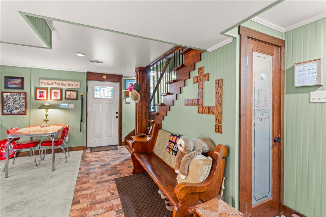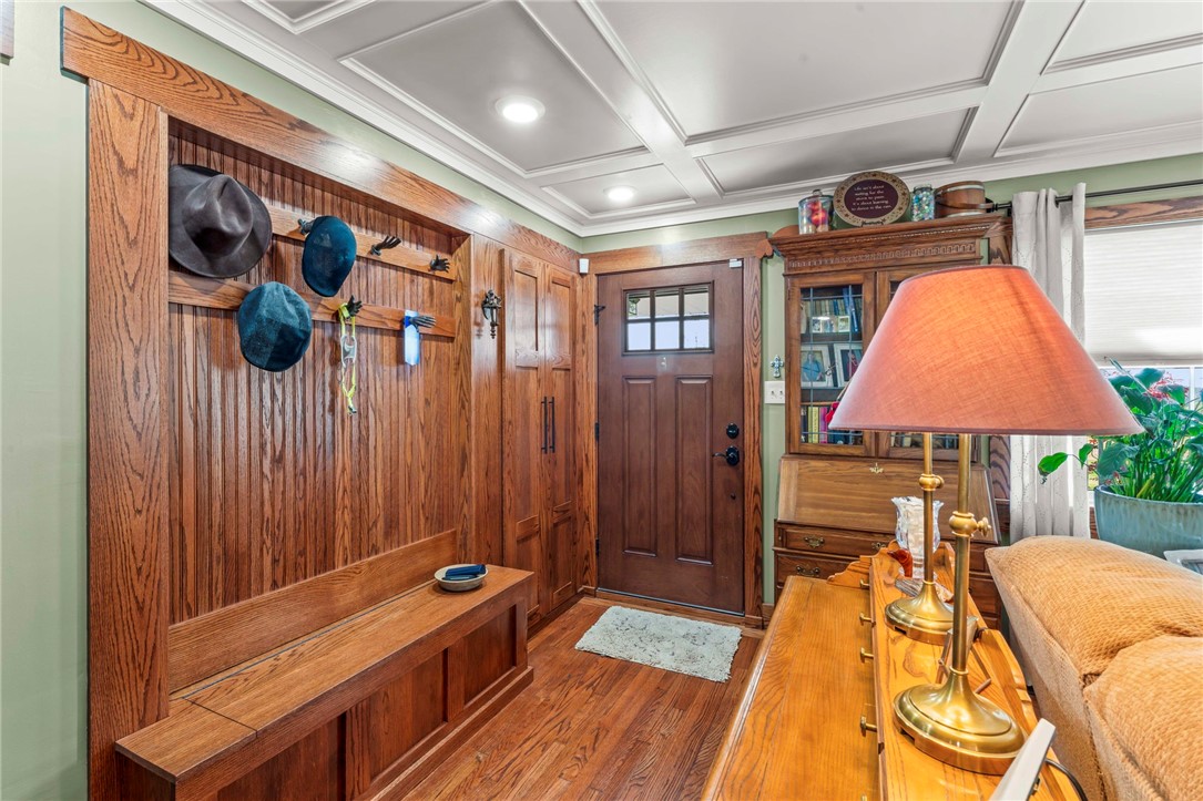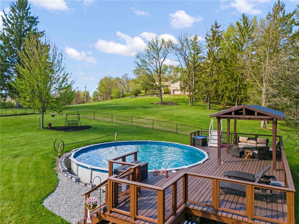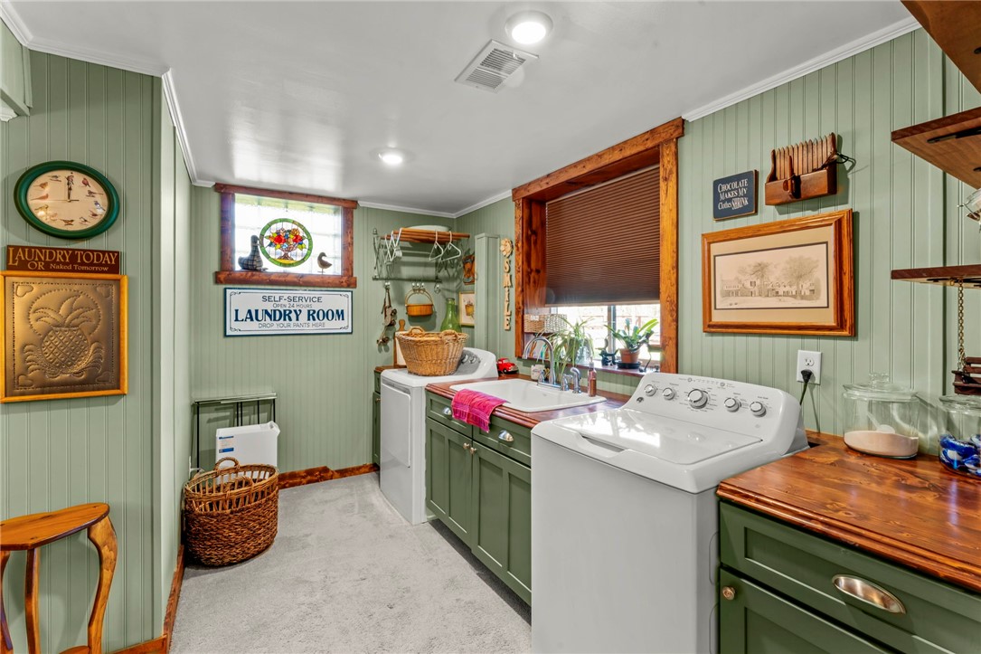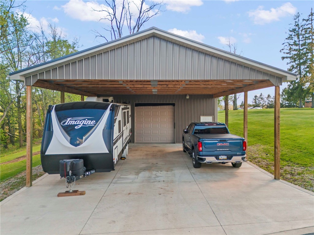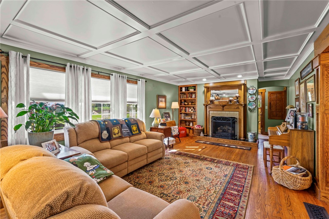 Sprawling 3 Bedroom Brick Ranch Nestled on 5 Acres Completely Redone Inside & Out! Beautiful custom craftsmanship abounds, custom entry closet & storage bench, spacious & relaxing living room featuring a coffered ceiling, fireplace with gas logs & custom built-ins, dining area open to the updated kitchen boasting quartz tops, custom cherry KraftMaid cabinetry with pullouts & organizers, rechargeable LED lighting under cabinets, farmhouse sink, tile backsplash, stainless appliances, shiplap ceiling, hardwood flooring & breakfast bar, enclosed sunroom with wood panel walls, electric baseboard heat, shiplap ceiling, custom wood archway, tile flooring & casement windows with screens and beautiful view of the tree lined rear yard, expansive primary bedroom suite complete with custom built-ins, shiplap ceiling, hardwood flooring, full bath featuring wood paneled walls with chair rail, cast iron clawfoot bathtub & tile flooring, 2 closets & a spacious walk-in closet with pulldown attic stairs that could also be used as a den or 4th bedroom, 2 additional generous sized bedrooms & full hall bathroom, finished walk-out lower level features a refinished fireplace with German schmear technique, kitchenette featuring custom cabinetry, wood countertop, beverage cooler & drop-in sink, full bathroom with glass block window, corrugated aluminum walls & tile shower with glass doors, laundry room with barn door entry, custom cabinetry, wood countertop & drop-in porcelain sink, storage closet & storage under the stairs, 2 car garage, awning covered patio, fenced-in rear yard with above ground swimming pool with sundeck & shaded pergola with drop down shades, firepit area, 30x30 car port, 40x30 Amish constructed pole barn with 30x10 storage loft with elevator lift & foldout stairs, OSB walls with rigid insulation, steel panel ceiling with blown insulation, wood burner, enclosed office, 10x10 garage door with drop down fabric screen, 100 AMP service panel, conveniently located to I-79, Route 19, Meadows Racetrack & Casino, Tanger Outlets & more!
