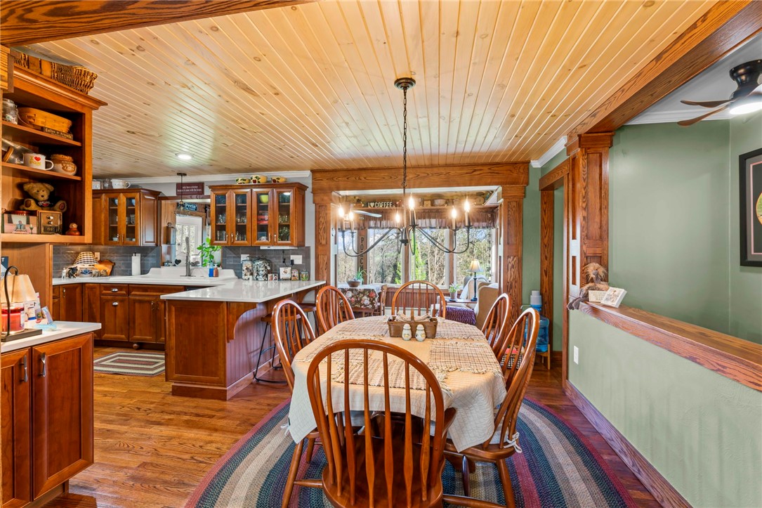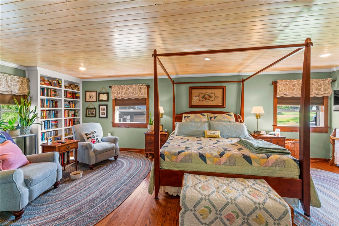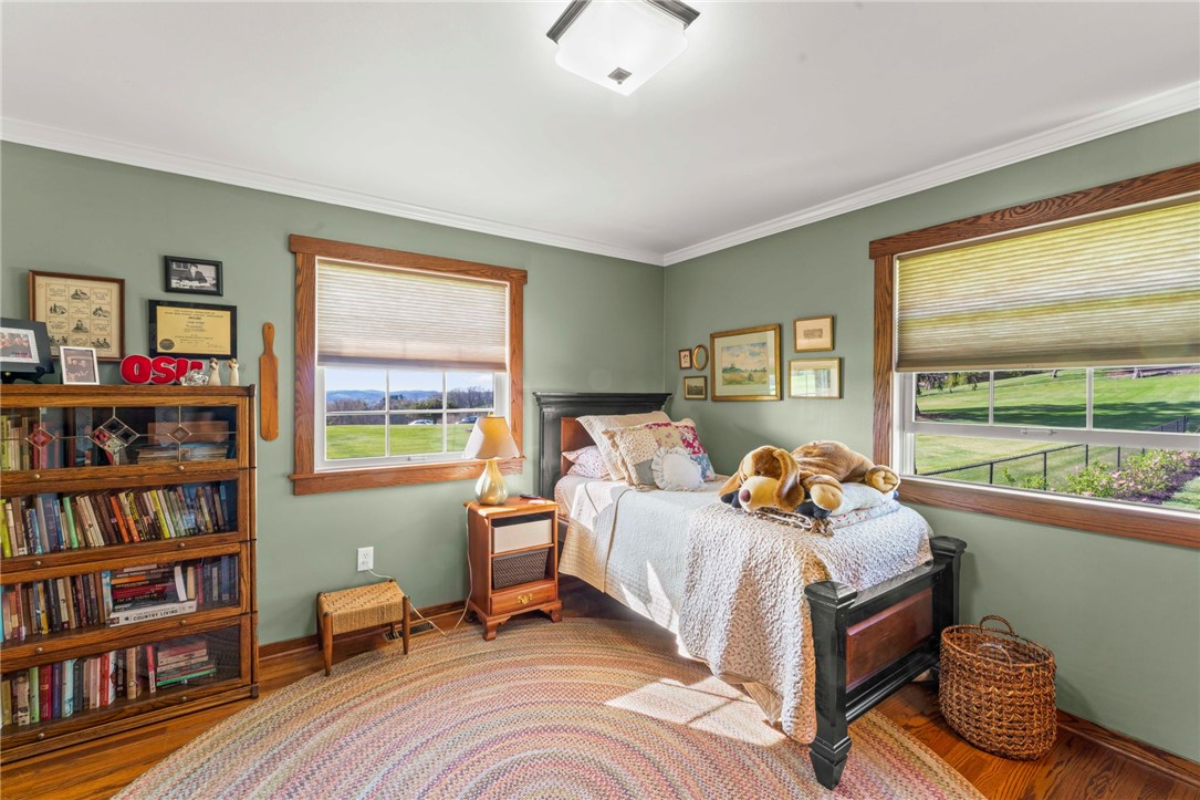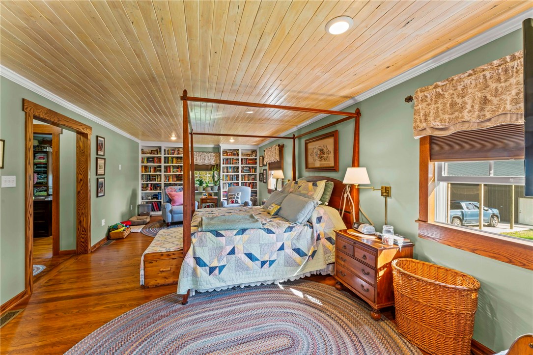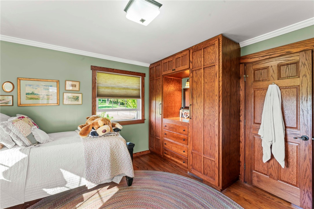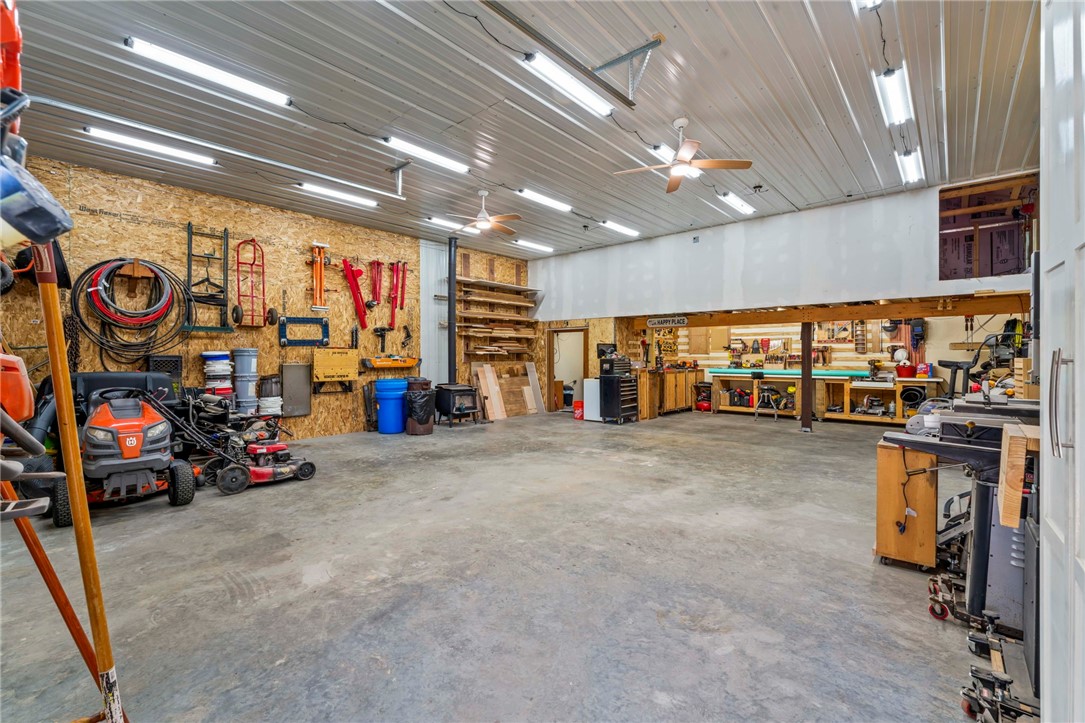 Sprawling 3 Bedroom Brick Ranch Nestled on 5 Acres Completely Redone Inside & Out! Beautiful custom craftsmanship abounds, custom entry closet & storage bench, spacious & relaxing living room featuring a coffered ceiling, fireplace with gas logs & custom built-ins, dining area open to the updated kitchen boasting quartz tops, custom cherry KraftMaid cabinetry with pullouts & organizers, rechargeable LED lighting under cabinets, farmhouse sink, tile backsplash, stainless appliances, shiplap ceiling, hardwood flooring & breakfast bar, enclosed sunroom with wood panel walls, electric baseboard heat, shiplap ceiling, custom wood archway, tile flooring & casement windows with screens and beautiful view of the tree lined rear yard, expansive primary bedroom suite complete with custom built-ins, shiplap ceiling, hardwood flooring, full bath featuring wood paneled walls with chair rail, cast iron clawfoot bathtub & tile flooring, 2 closets & a spacious walk-in closet with pulldown attic stairs that could also be used as a den or 4th bedroom, 2 additional generous sized bedrooms & full hall bathroom, finished walk-out lower level features a refinished fireplace with German schmear technique, kitchenette featuring custom cabinetry, wood countertop, beverage cooler & drop-in sink, full bathroom with glass block window, corrugated aluminum walls & tile shower with glass doors, laundry room with barn door entry, custom cabinetry, wood countertop & drop-in porcelain sink, storage closet & storage under the stairs, 2 car garage, awning covered patio, fenced-in rear yard with above ground swimming pool with sundeck & shaded pergola with drop down shades, firepit area, 30x30 car port, 40x30 Amish constructed pole barn with 30x10 storage loft with elevator lift & foldout stairs, OSB walls with rigid insulation, steel panel ceiling with blown insulation, wood burner, enclosed office, 10x10 garage door with drop down fabric screen, 100 AMP service panel, conveniently located to I-79, Route 19, Meadows Racetrack & Casino, Tanger Outlets & more!