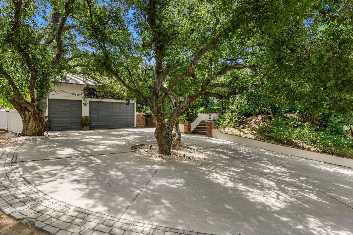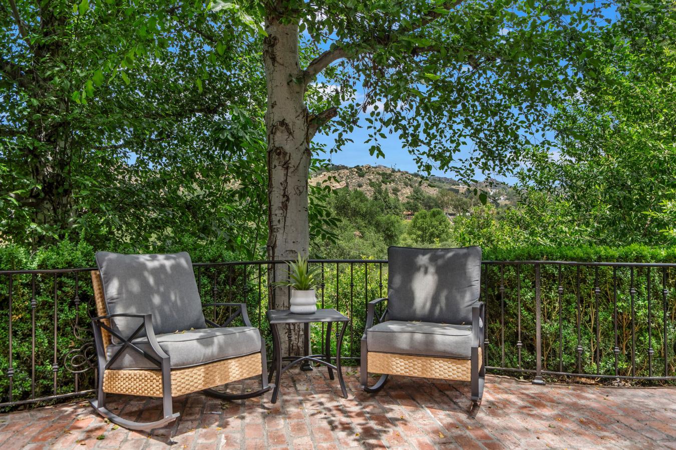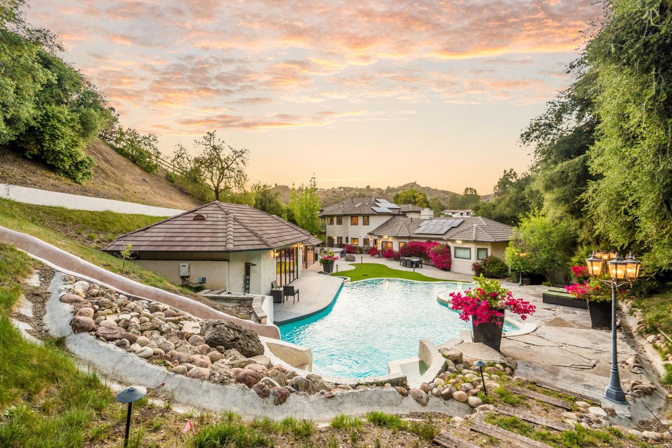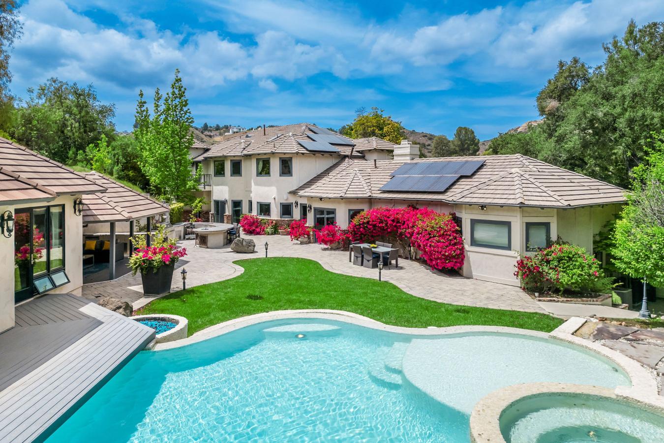 Step into storybook elegance at this one-of-a-kind estate with a guest house surrounded by rolling hills and unforgettable outdoor amenities. Up a privately gated drive, a cobbled walkway leads to the grand brick facade and formal double-door entry, opening to limestone floors, vaulted ceilings, and elegant architectural details throughout. The spacious living room features a fireplace and charming seating nook with lattice glass windows, while the formal dining room is flanked by floor-to-ceiling windows and is connected to a butlers pantry for seamless entertaining. The chefs kitchen is a true centerpiece, with views of the beautiful backyard, a large honed black granite island, top-of-the-line appliances, a built-in breakfast banquette, and ample storage. The kitchen flows effortlessly into the family room with custom built-ins, a fireplace, and sliding doors to the patio for alfresco dining. The main level also includes an elegant private office with decorative ceiling accents and built-ins; a guest room adjacent to a bathroom and laundry room; a powder room; and a full game room with a built-in bar, wine coolers, and entertainment center that opens to the yard. Upstairs, the luxurious primary retreat is a sanctuary all its own, featuring hillside views, a fireplace, dual custom walk-in closets, and a light-filled turret. The primary bath boasts a balcony, a large soaking tub with expansive views, a separate shower, dual vanities, and a makeup counter. Two additional spacious en-suite bedrooms with large closets complete the second floor. Step outside to a private resort setting: an infinity-edge saltwater pool with a waterfall and custom-built slide and spa, a full outdoor kitchen with a BBQ and pizza oven, and a covered pavilion for year-round entertaining. A charming, custom-built treehouse adds whimsy, while an upper-level pad offers potential for future development. The detached guest house with bi-fold doors faces out over the stunning pool and includes a full kitchen with high-end appliances, a living/work/dining area, a bedroom, a bath, a laundry room, and a private sitting area, ideal for guests, extended family, or creative use. Additional highlights: an oversized 3-car garage with a storage room, solar panels, multiple-zone HVAC, exquisite lighting fixtures throughout, and Bell Canyons renowned community amenities: an equestrian center, clubhouse, gym, tennis/pickleball courts, and numerous annual events for all ages. The property is located within the award-winning Las Virgenes School District.