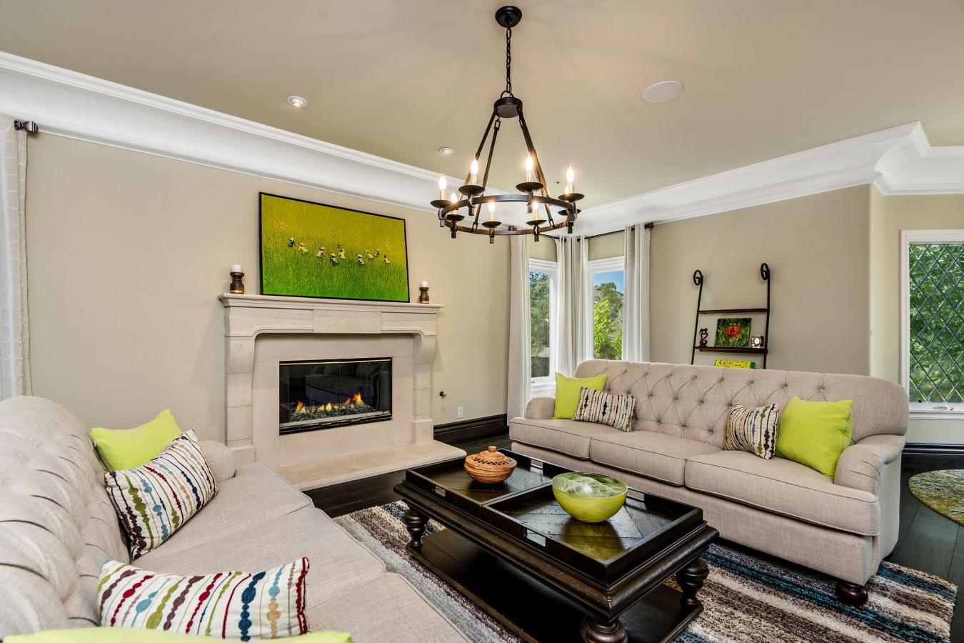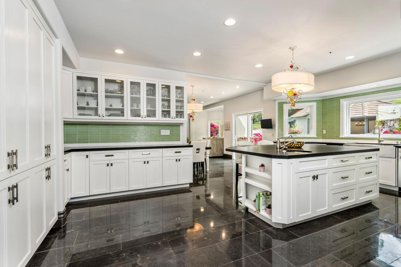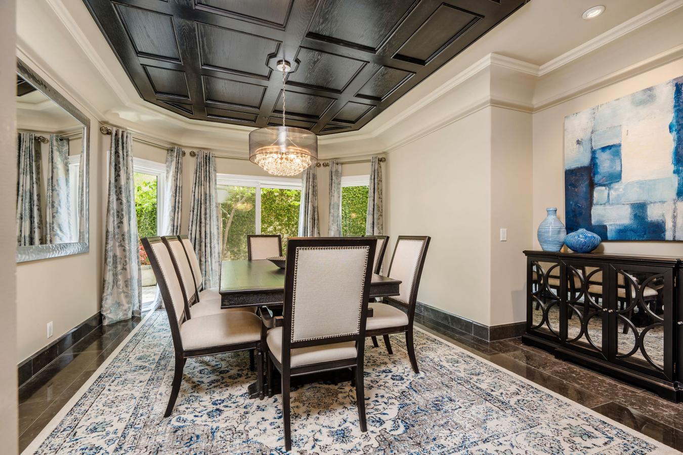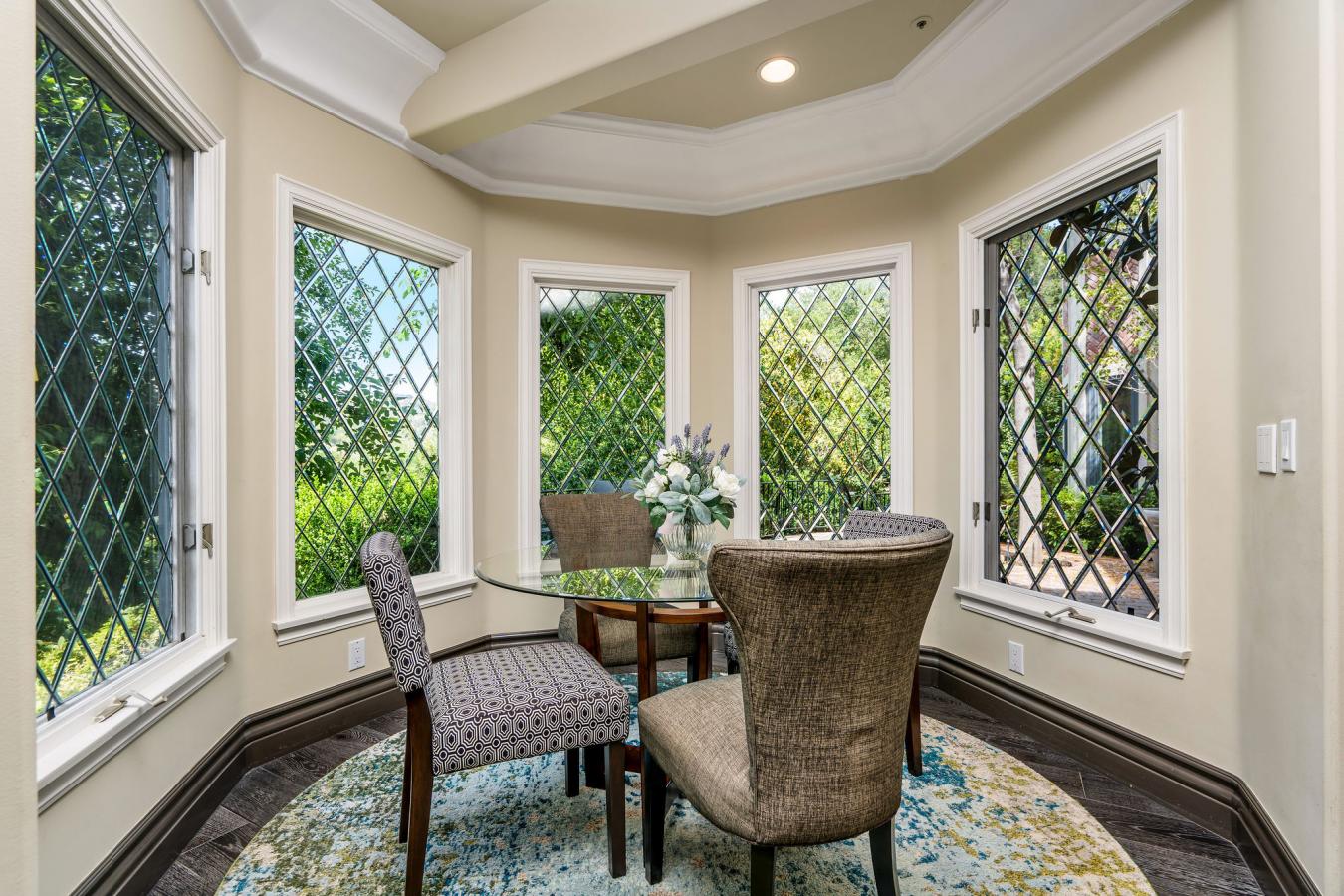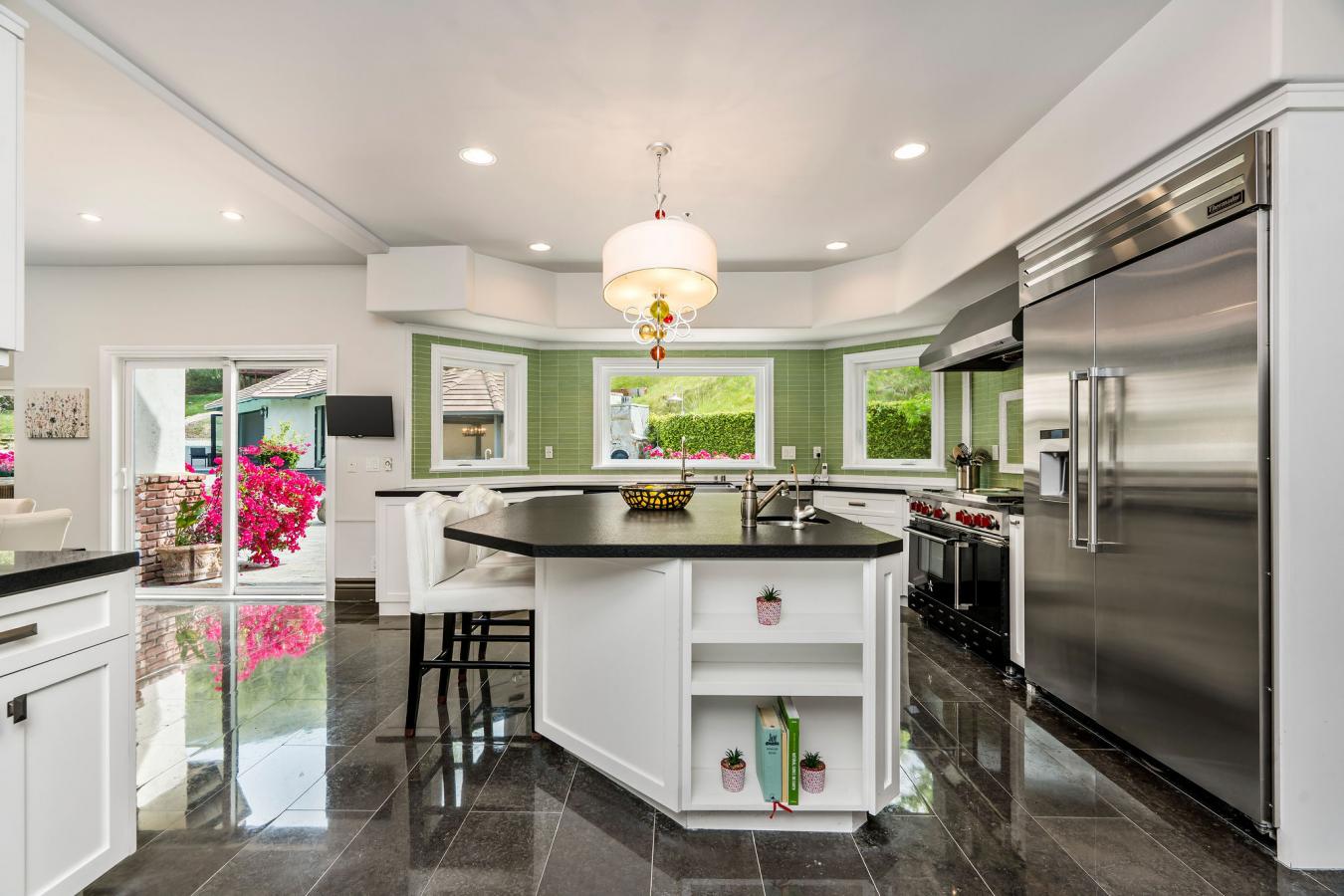 Step into storybook elegance at this one-of-a-kind estate with a guest house surrounded by rolling hills and unforgettable outdoor amenities. Up a privately gated drive, a cobbled walkway leads to the grand brick facade and formal double-door entry, opening to limestone floors, vaulted ceilings, and elegant architectural details throughout. The spacious living room features a fireplace and charming seating nook with lattice glass windows, while the formal dining room is flanked by floor-to-ceiling windows and is connected to a butlers pantry for seamless entertaining. The chefs kitchen is a true centerpiece, with views of the beautiful backyard, a large honed black granite island, top-of-the-line appliances, a built-in breakfast banquette, and ample storage. The kitchen flows effortlessly into the family room with custom built-ins, a fireplace, and sliding doors to the patio for alfresco dining. The main level also includes an elegant private office with decorative ceiling accents and built-ins; a guest room adjacent to a bathroom and laundry room; a powder room; and a full game room with a built-in bar, wine coolers, and entertainment center that opens to the yard. Upstairs, the luxurious primary retreat is a sanctuary all its own, featuring hillside views, a fireplace, dual custom walk-in closets, and a light-filled turret. The primary bath boasts a balcony, a large soaking tub with expansive views, a separate shower, dual vanities, and a makeup counter. Two additional spacious en-suite bedrooms with large closets complete the second floor. Step outside to a private resort setting: an infinity-edge saltwater pool with a waterfall and custom-built slide and spa, a full outdoor kitchen with a BBQ and pizza oven, and a covered pavilion for year-round entertaining. A charming, custom-built treehouse adds whimsy, while an upper-level pad offers potential for future development. The detached guest house with bi-fold doors faces out over the stunning pool and includes a full kitchen with high-end appliances, a living/work/dining area, a bedroom, a bath, a laundry room, and a private sitting area, ideal for guests, extended family, or creative use. Additional highlights: an oversized 3-car garage with a storage room, solar panels, multiple-zone HVAC, exquisite lighting fixtures throughout, and Bell Canyons renowned community amenities: an equestrian center, clubhouse, gym, tennis/pickleball courts, and numerous annual events for all ages. The property is located within the award-winning Las Virgenes School District.