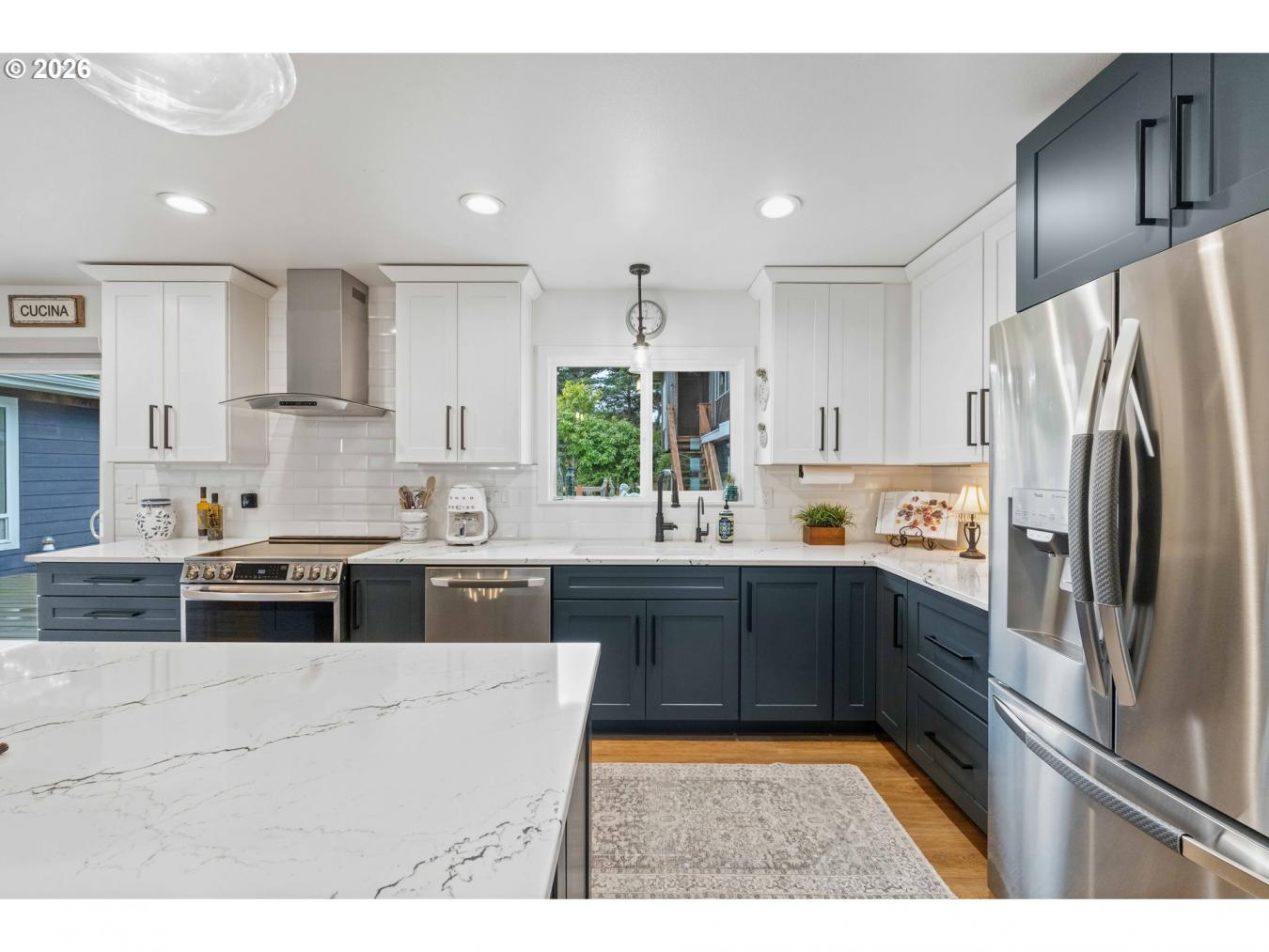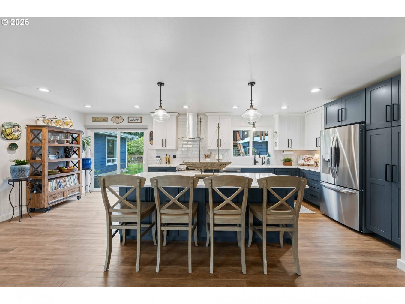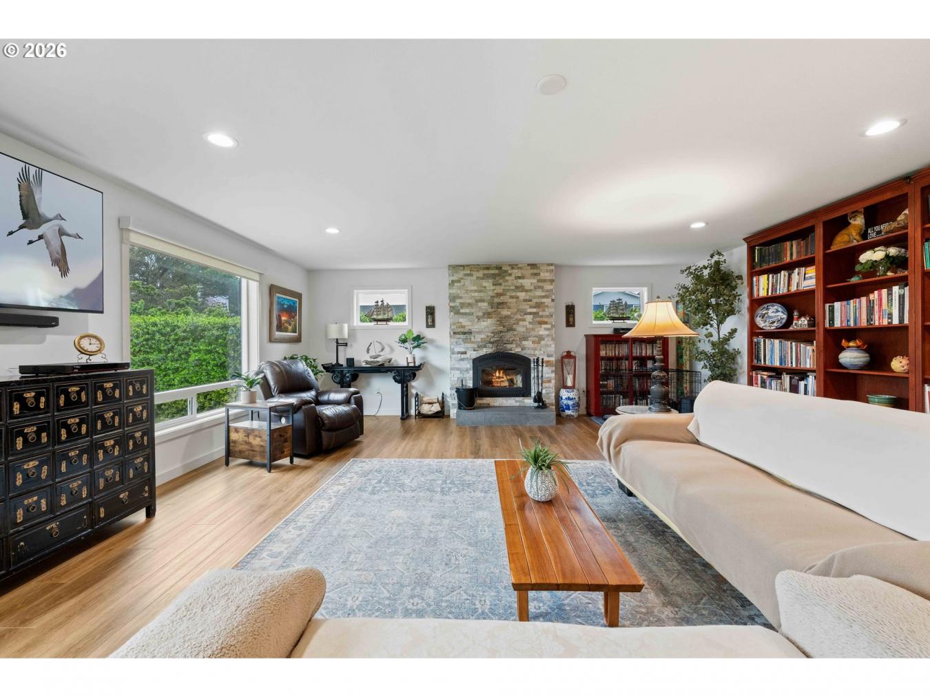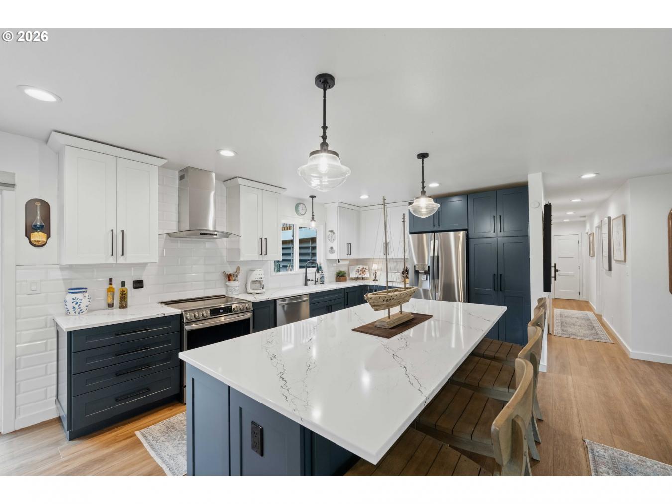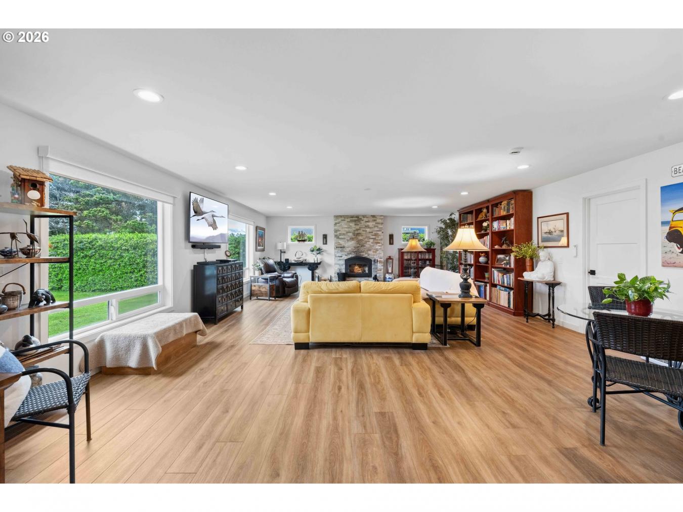 Located at 820 Jackson Ave SW in West Bandon, this exceptional property offers far more than a single residence, featuring a fully remodeled main home along with a beautifully updated guest apartment above a detached three-car garage, all just a few blocks from the beach. Set on a spacious 0.29-acre corner lot, the main home was taken down to the studs, expanded with additional living area and a new primary suite, and rebuilt with impressive attention to detail, resulting in over 2,700 square feet with four bedrooms and two bathrooms designed for both comfort and functionality. The interior showcases a generous living and dining area, a well-appointed kitchen with a large island, quartz countertops, quality cabinetry, and a full stainless appliance package, all complemented by durable luxury vinyl plank flooring throughout the home. Expansive windows provide abundant natural light, while a stately stone fireplace anchors the main living space. The roomy primary suite offers a spacious, well-appointed bath with a marble counter and large soaking tub with a tiled walk-in shower exuding this fine interior. The large laundry room with washer and dryer adds to everyday convenience. A new membrane roof enhances long-term value, and a sliding glass door opens to a composite deck overlooking a private backyard complete with a functional greenhouse and mature rhododendrons. The detached guest quarters is a standout feature, offering impeccable living space complete with a full kitchen, one bedroom, stack washer/dryer unit, and a bathroom with a beautifully tiled walk-in shower, along with a large balcony that makes it ideal for guests, extended living, or rental potential. Additional amenities include a paved circular driveway, an RV hookup, and pre-wiring for a hot tub, all in a highly regarded West Bandon location that offers excellent proximity to the coast and the many amenities of Bandon. Be sure to watch the video tour and call for your appointment to view this incredible residence.