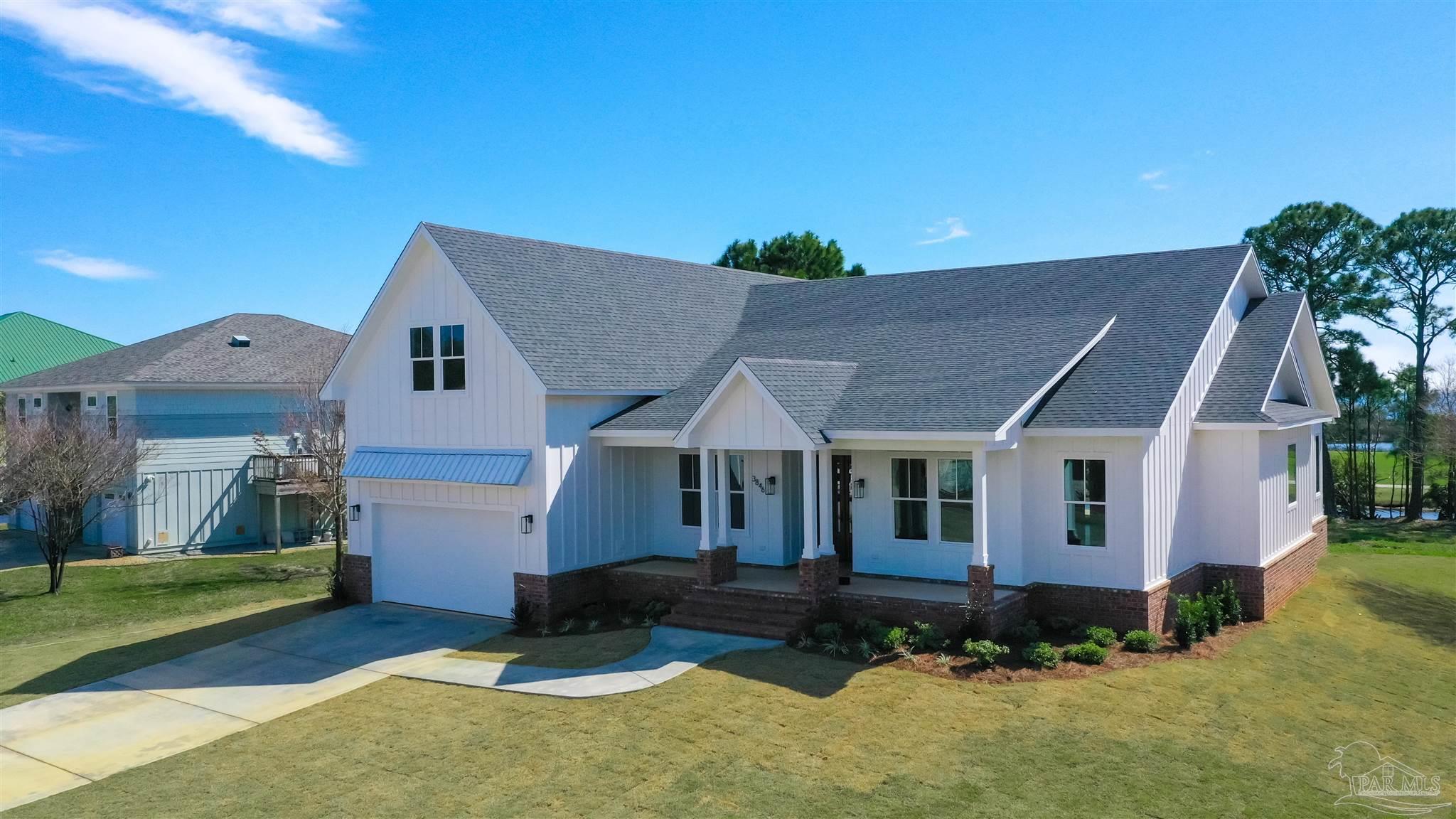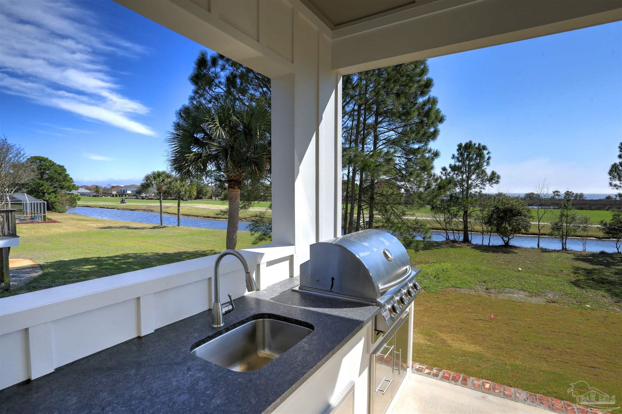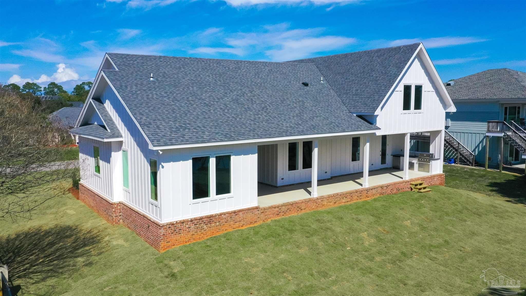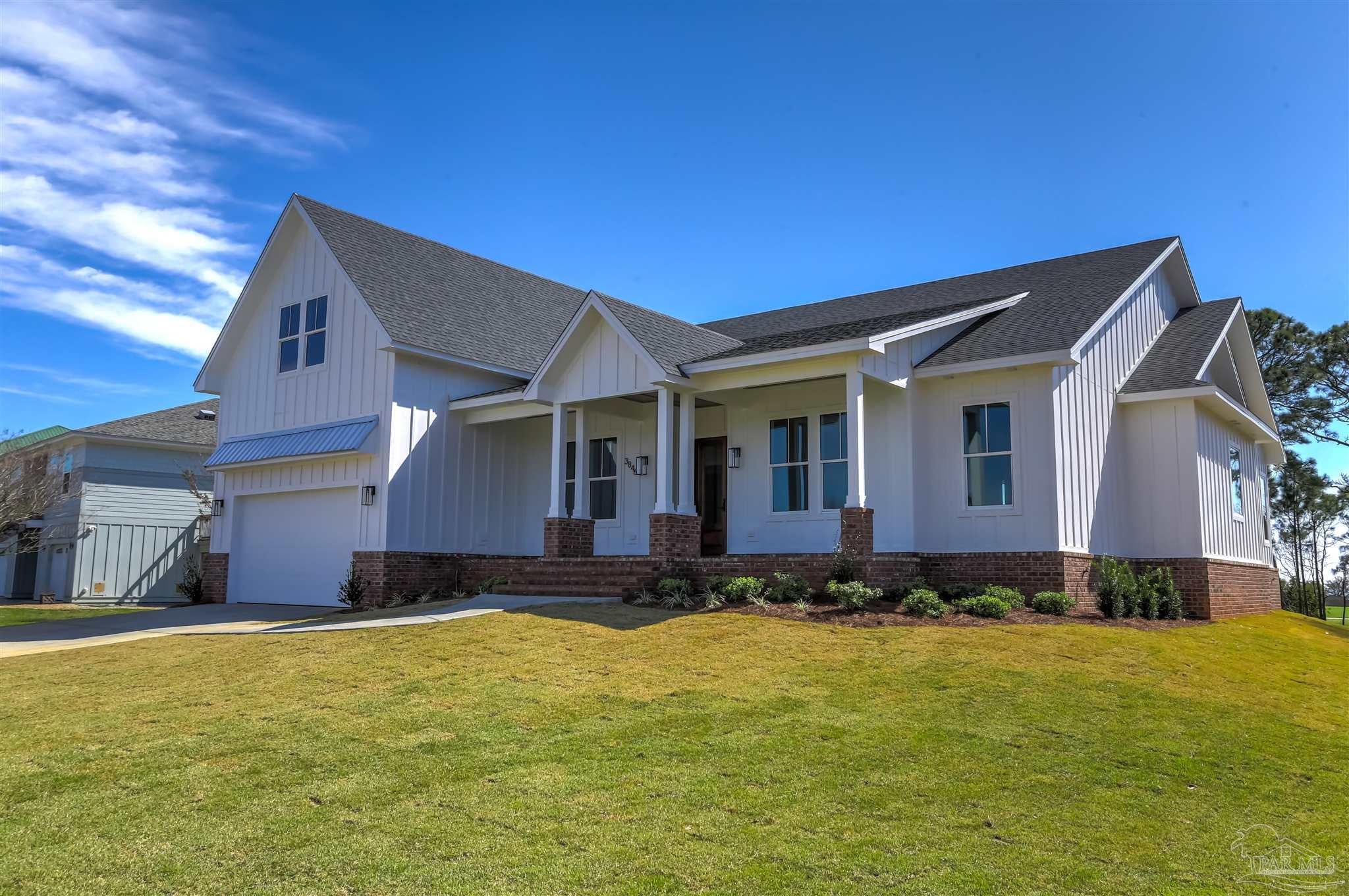 New Construction in a fantastic location in the Tiger Point Golf Community! Great views await the new owner of this 6 bedroom/ 4 bath home boasting 3400 SF of living area. This rear of this custom home faces south giving it Southern Exposure so you can soak up the sunshine and warmth in the winter months and the shade and summer breezes in the summer months on the large (595 SF) rear porch. The rear of this lot abuts the golf course property which gives you views of the canal, the 6th Fairway, sawgrass, and Santa Rosa Sound. The upstairs living area is over 900 SF and has 2 large bedrooms and one full bath. This is flexible space that could be used as a home office, workout room, media room, game room, man cave, etc. (plumbed for a wet bar). This would make nice guest quarters or a mother-in-law suite. There are several storage closets on the second level and access to the floored stand-up attic area for additional storage. The downstairs is an open floor plan with 10 ceilings and 8 solid doors. Kitchen features a walk-in pantry, stainless steel appliances with wine cooler, floating white oak shelves, and a large island. The living room has a gas fireplace and a triple sliding door that opens from either side that lets the inside flow to the outside porch area. There is a custom outdoor kitchen supplied by BBQ Guys with a grill, access doors/ drawers for storage, under counter refrigerator, sink, and granite countertop. Home constructed with PGT impact windows and slider, Wayne Dalton garage doors, Navien tankless water heater, Nuema stained double front door with triple locking feature, two American Standard HVAC systems, spray foam attic insulation, and has a sprinkler system on a timer. House is prewired to all bedrooms and living area for audio visual. This is a golf cart friendly neighborhood and The Pointe restaurant, sports bar, event venue, and golf clubhouse is a short ride away.