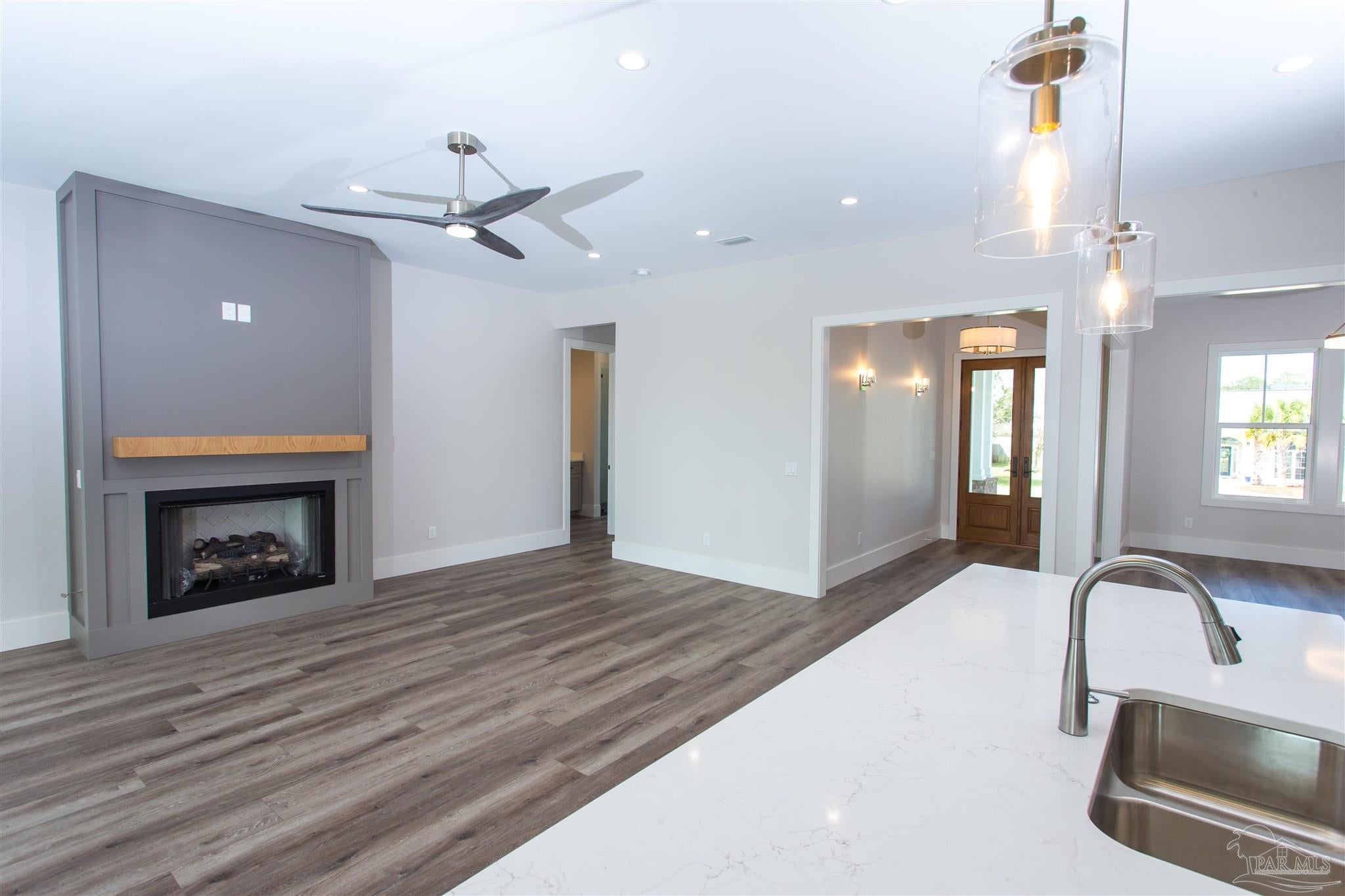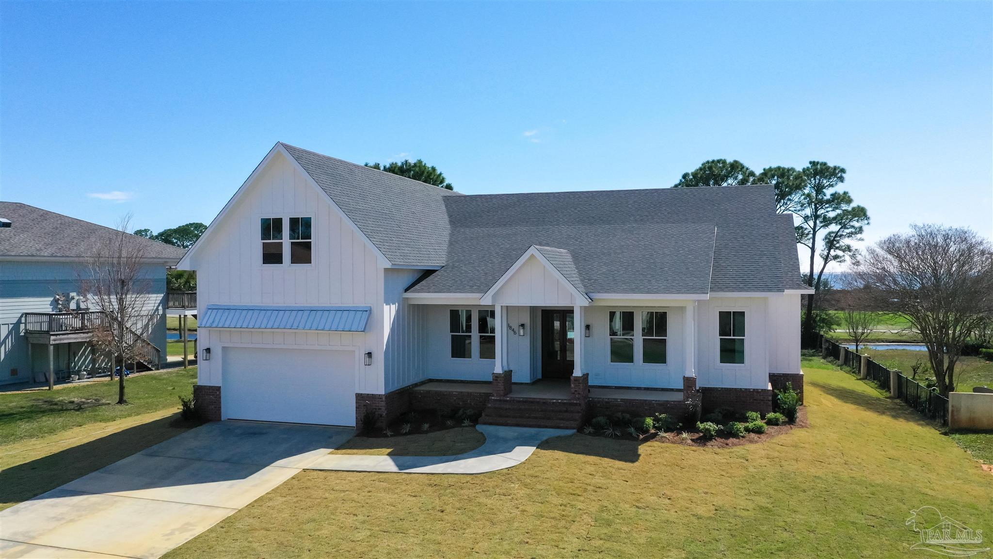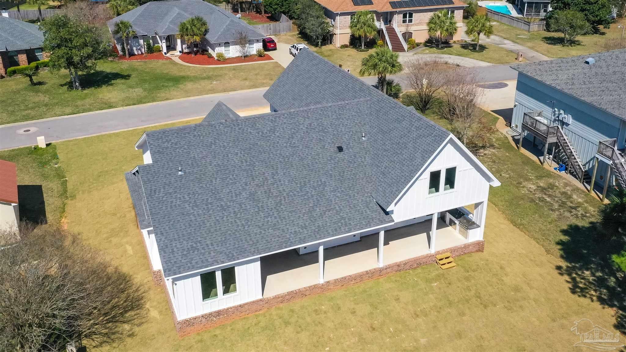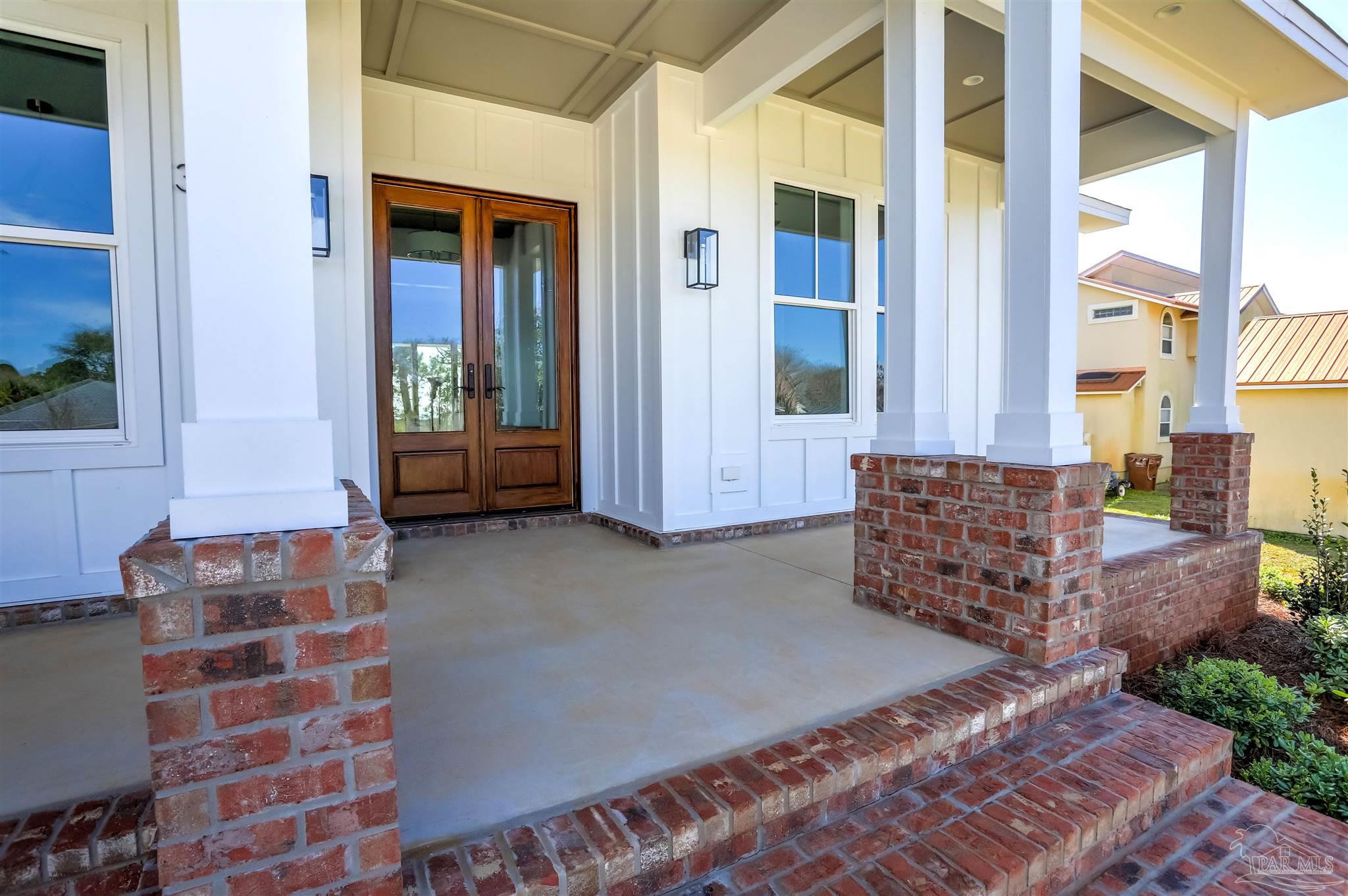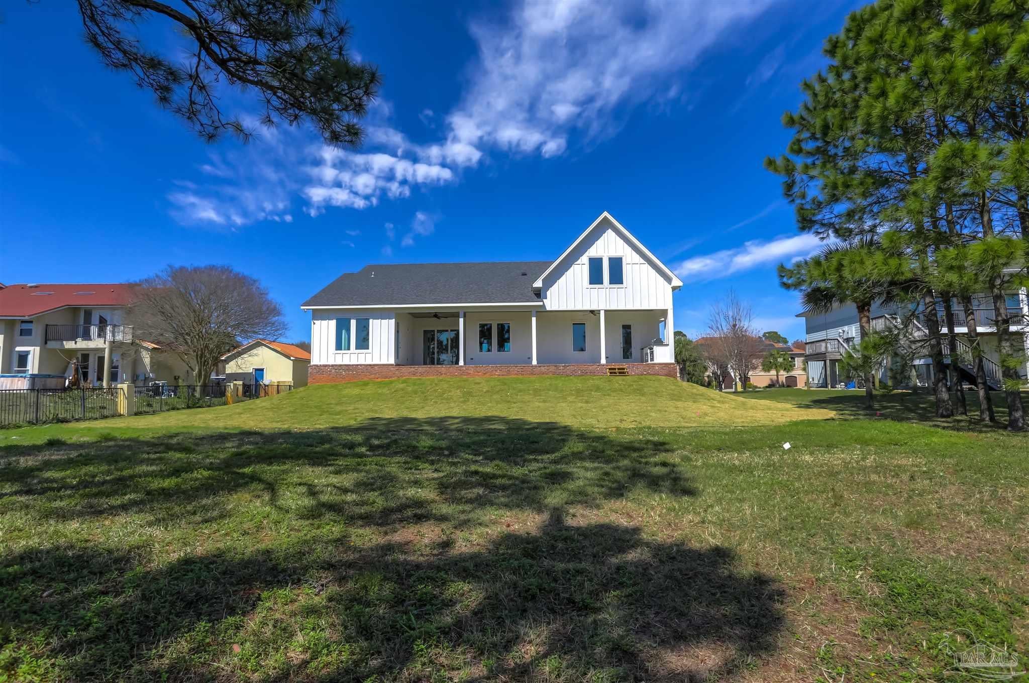 New Construction in a fantastic location in the Tiger Point Golf Community! Great views await the new owner of this 6 bedroom/ 4 bath home boasting 3400 SF of living area. This rear of this custom home faces south giving it Southern Exposure so you can soak up the sunshine and warmth in the winter months and the shade and summer breezes in the summer months on the large (595 SF) rear porch. The rear of this lot abuts the golf course property which gives you views of the canal, the 6th Fairway, sawgrass, and Santa Rosa Sound. The upstairs living area is over 900 SF and has 2 large bedrooms and one full bath. This is flexible space that could be used as a home office, workout room, media room, game room, man cave, etc. (plumbed for a wet bar). This would make nice guest quarters or a mother-in-law suite. There are several storage closets on the second level and access to the floored stand-up attic area for additional storage. The downstairs is an open floor plan with 10 ceilings and 8 solid doors. Kitchen features a walk-in pantry, stainless steel appliances with wine cooler, floating white oak shelves, and a large island. The living room has a gas fireplace and a triple sliding door that opens from either side that lets the inside flow to the outside porch area. There is a custom outdoor kitchen supplied by BBQ Guys with a grill, access doors/ drawers for storage, under counter refrigerator, sink, and granite countertop. Home constructed with PGT impact windows and slider, Wayne Dalton garage doors, Navien tankless water heater, Nuema stained double front door with triple locking feature, two American Standard HVAC systems, spray foam attic insulation, and has a sprinkler system on a timer. House is prewired to all bedrooms and living area for audio visual. This is a golf cart friendly neighborhood and The Pointe restaurant, sports bar, event venue, and golf clubhouse is a short ride away.