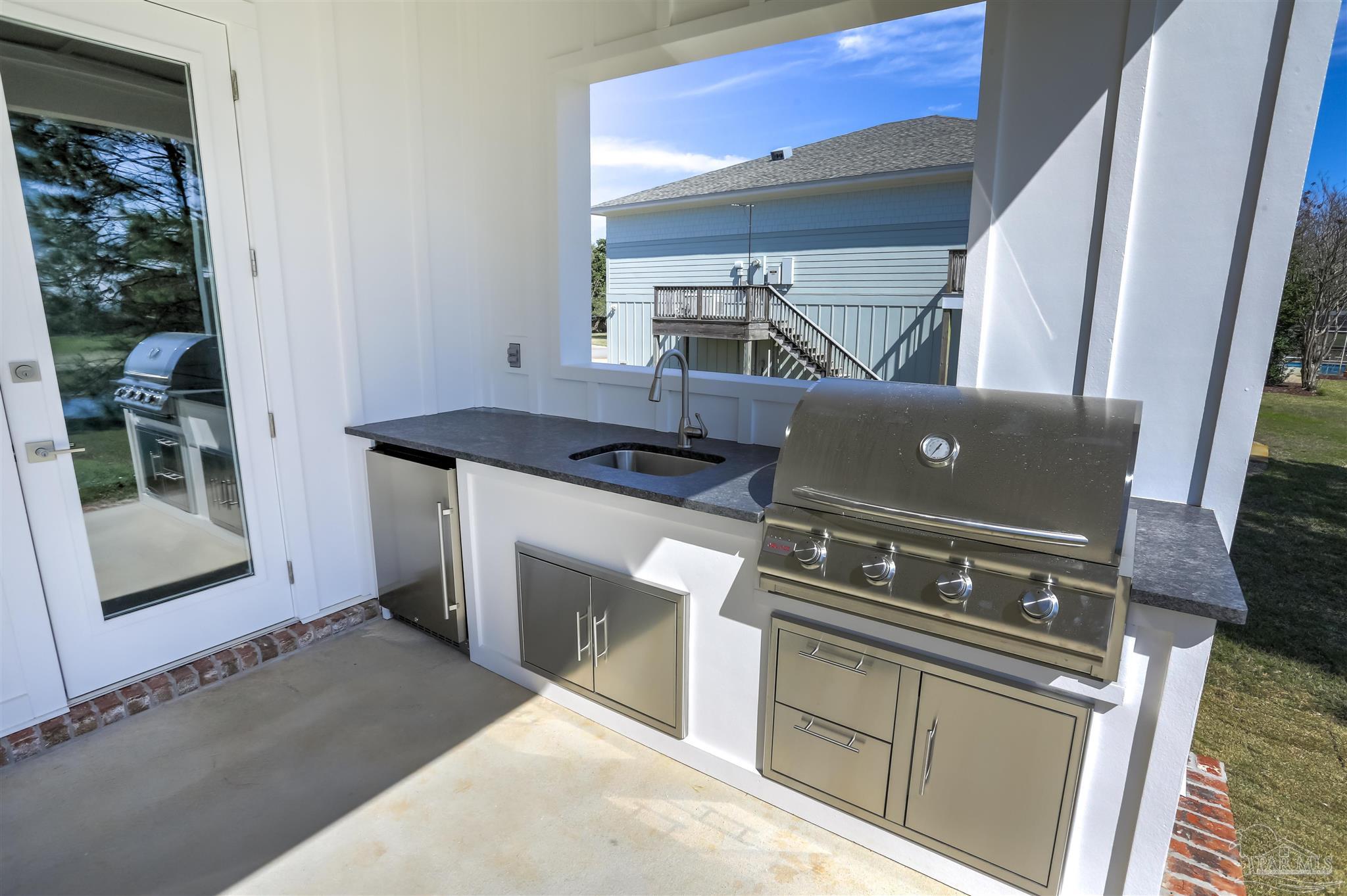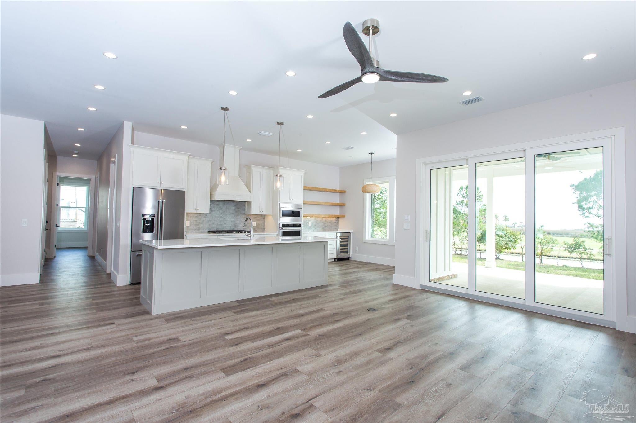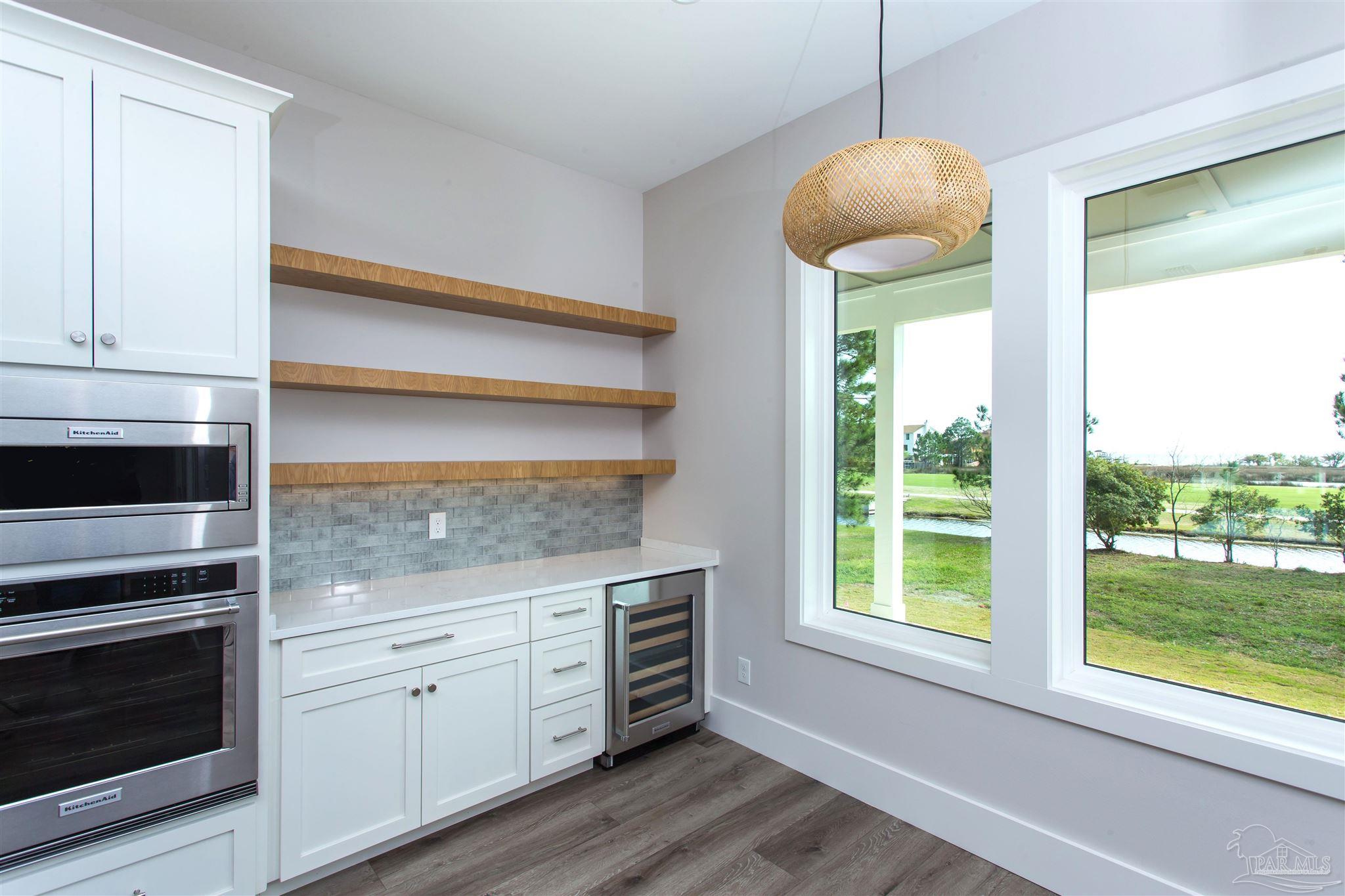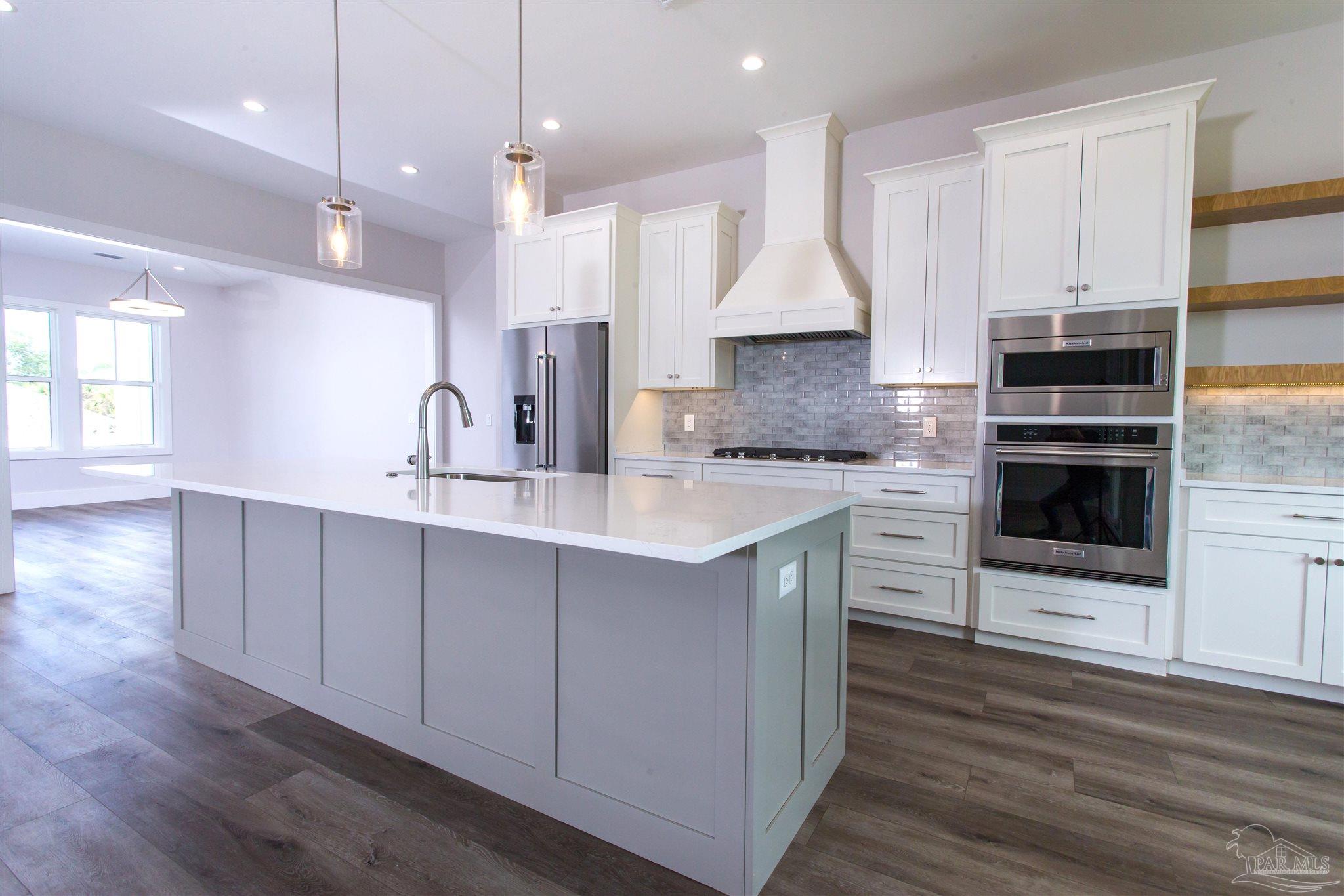 New Construction in a fantastic location in the Tiger Point Golf Community! Great views await the new owner of this 6 bedroom/ 4 bath home boasting 3400 SF of living area. This rear of this custom home faces south giving it Southern Exposure so you can soak up the sunshine and warmth in the winter months and the shade and summer breezes in the summer months on the large (595 SF) rear porch. The rear of this lot abuts the golf course property which gives you views of the canal, the 6th Fairway, sawgrass, and Santa Rosa Sound. The upstairs living area is over 900 SF and has 2 large bedrooms and one full bath. This is flexible space that could be used as a home office, workout room, media room, game room, man cave, etc. (plumbed for a wet bar). This would make nice guest quarters or a mother-in-law suite. There are several storage closets on the second level and access to the floored stand-up attic area for additional storage. The downstairs is an open floor plan with 10 ceilings and 8 solid doors. Kitchen features a walk-in pantry, stainless steel appliances with wine cooler, floating white oak shelves, and a large island. The living room has a gas fireplace and a triple sliding door that opens from either side that lets the inside flow to the outside porch area. There is a custom outdoor kitchen supplied by BBQ Guys with a grill, access doors/ drawers for storage, under counter refrigerator, sink, and granite countertop. Home constructed with PGT impact windows and slider, Wayne Dalton garage doors, Navien tankless water heater, Nuema stained double front door with triple locking feature, two American Standard HVAC systems, spray foam attic insulation, and has a sprinkler system on a timer. House is prewired to all bedrooms and living area for audio visual. This is a golf cart friendly neighborhood and The Pointe restaurant, sports bar, event venue, and golf clubhouse is a short ride away.
