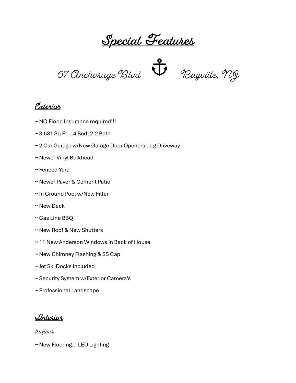 Beautiful Custom Contemporary Waterfront Featuring 4 Beds, 2.2 Bath Home w/Views straight down the Wide Lagoon & NO Flood Insurance required! This home Boasts a Unique feature of a Walk Out Finished Basement w/Fireplace, Summer Kitchen & 4th Bedroom plus plenty of storage. Walk out of the Sliders & onto a Covered Extensive Patio w/IG Pool surrounded by New Pavers for plenty of space to entertain.
