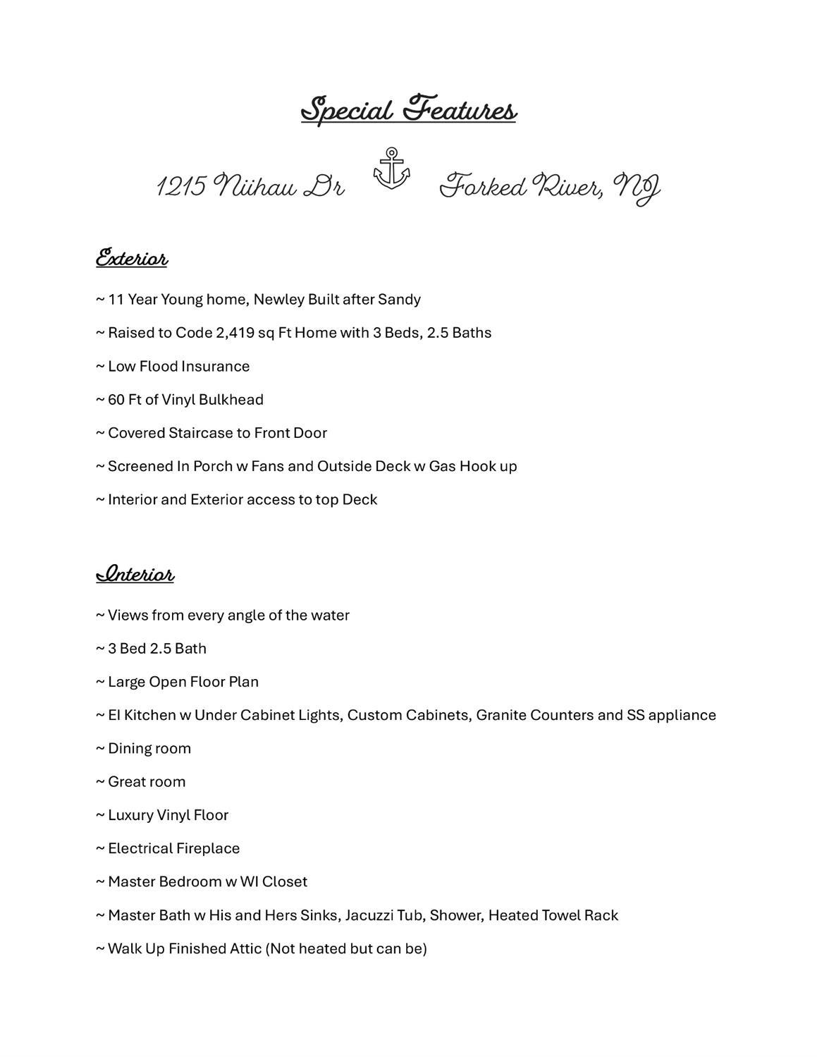 All about the Views, this 2,419 Sq Ft Home offers 3 Bed & 2.5 Bath, just 11 Year Young Raised Home (All New After Sandy) with 60 Ft of Vinyl Bulkhead. Immaculately kept Bright & Airy Boasting an Open Floor Plan, great for entertaining. Step out onto the Screened In Porch and Deck (Gas Hook up for the Grill) to take in the Views of Forked River. The Eat-In Kitchen w Custom Cabinets, Grante Counters, SS Appliances, 2 Large Sliders off the Living and Dining Room. Also a LG Half Bath completes the 1st Fl. The 2Nd Fl Houses the 3 Bedrooms, Guest Bath, Laundry Closet and Master Bedroom w WI Closet, Master Bath has 3 Sinks, Jacuzzi Tub, Shower, Heated Towel Rack & Private Balcony For the morning coffee or evening wine.. Additional Features are a walk up Finished Attic which can be heated for additional Living Space. Theres also a Car Port & Lg Shed built under the house for added Storage. Minutes to the Bay plus Quick Access to Dock & Dine Restaurants, Full-service Marinas, Tices Shoal & Inlet!