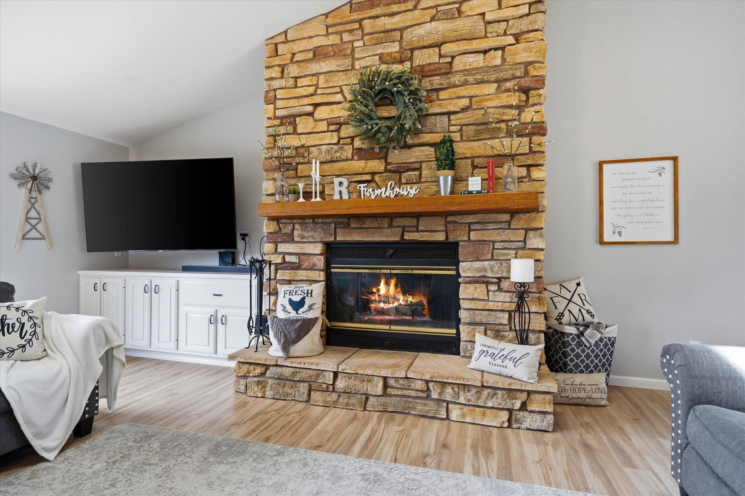 FINISHED and MOVE IN READY! Corner Lot 3-Car Garage 4 Beds 2 Baths Southern Exposure Farmhouse FULL fencing Covered patio Walk-in pantry Gas fireplace Dedicated Dining Space! Some photos are of a previously built home.