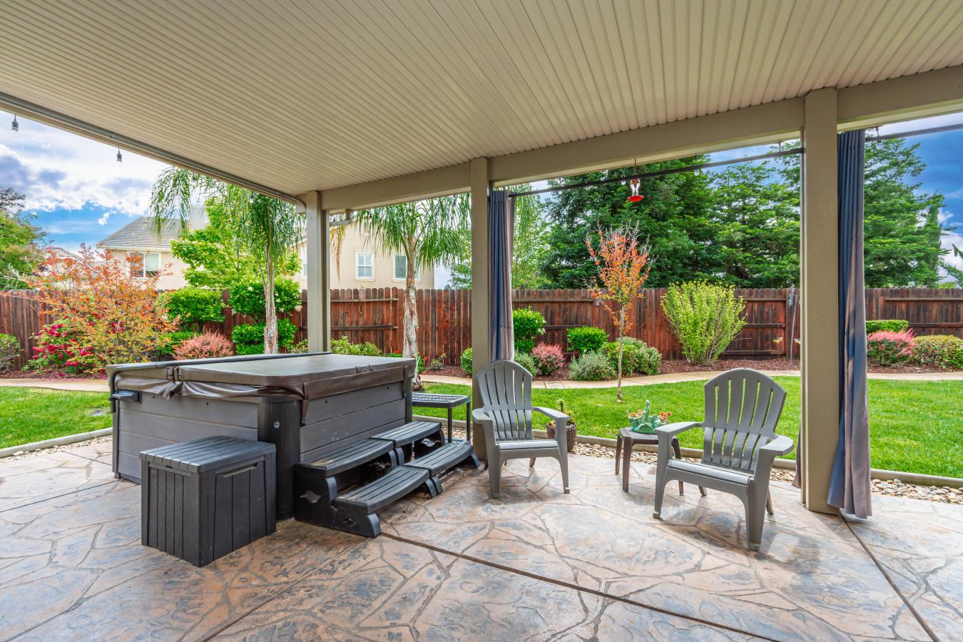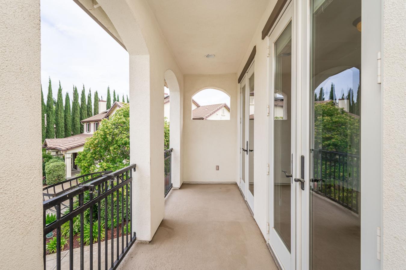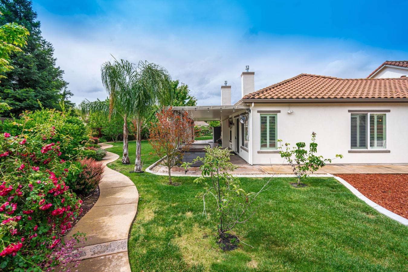 Welcome home to the highly sought-after Doyle Ranch community. This home perfectly integrates indoor and outdoor comfort with timeless style and functionality. Situated on one of the larger lots in the neighborhood, the property features a private courtyard entry with mature landscaping, ideal for a quiet garden or morning coffee. The interior is designed for main-level living with the added versatility of an upstairs suite. This upper level includes a spacious bedroom, a full bathroom, and a private balcony, making it an excellent choice for a home office or guest quarters. The main floor is thoughtfully appointed with plantation shutters throughout and three gas fireplaces, including one in the primary suite. The kitchen is well-equipped for entertaining, offering extensive cabinetry, ample counter space, and a butlers pantry that provides additional storage or potential for your own wine cellar. The expansive backyard serves as a private oasis, featuring a covered patio, a hot tub, and a winding walkway through mature landscaping that includes several varieties of fruit trees. Whether youre grilling, dining al fresco, or simply unwinding, this outdoor space is designed to be enjoyed year-round with family and friends. This home offers a perfect blend of peaceful living and modern convenience-truly a place youll love to call home.