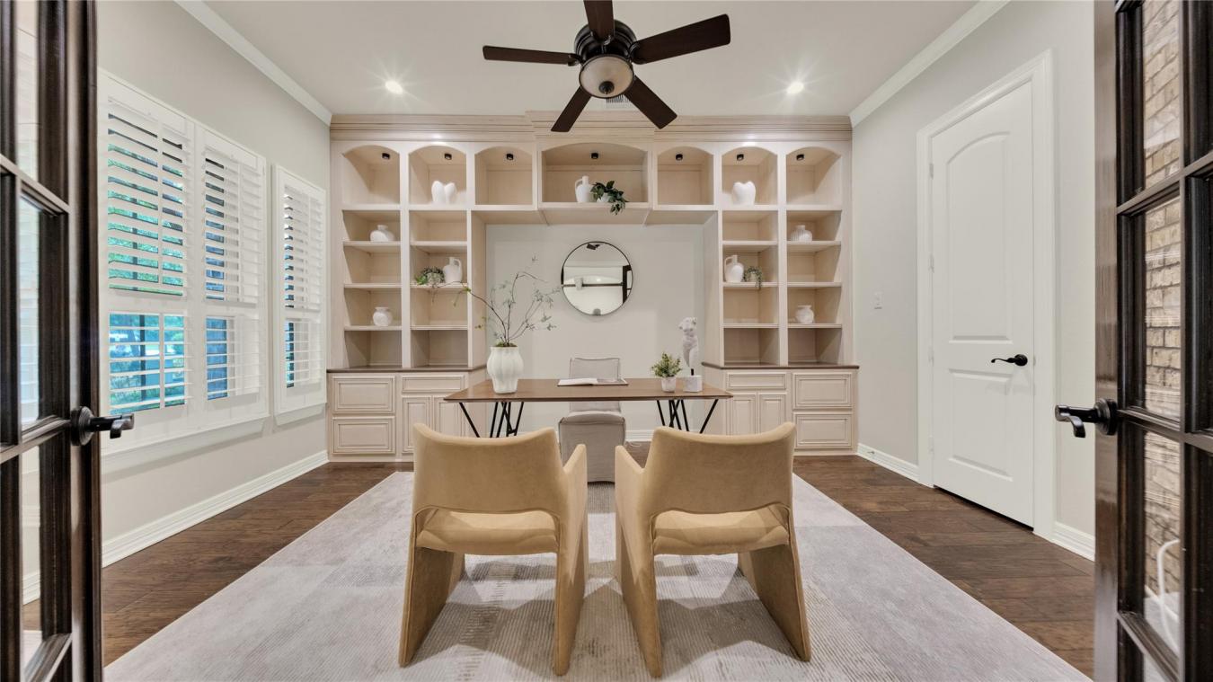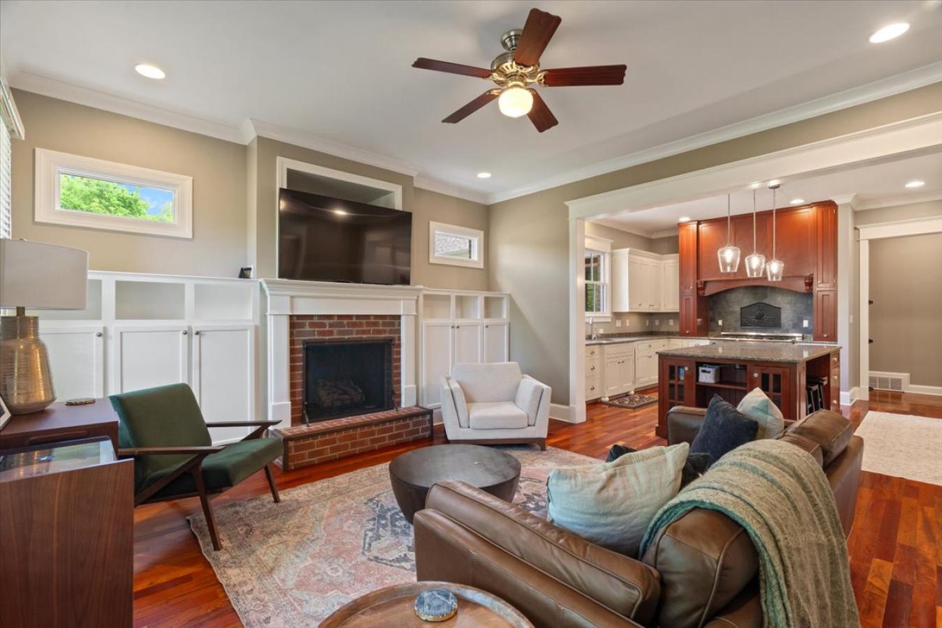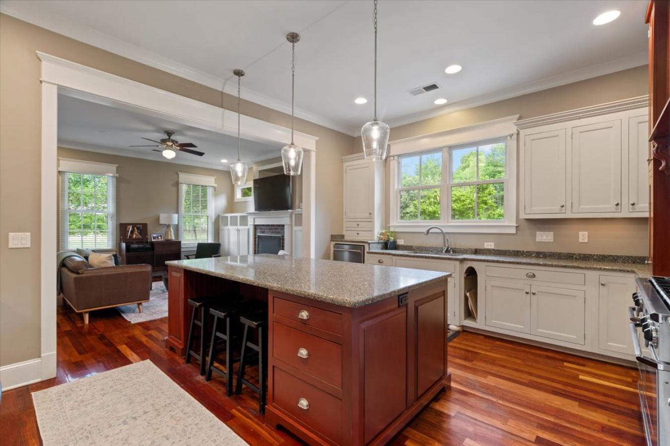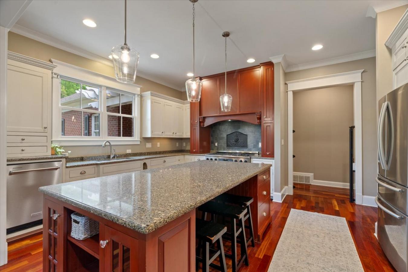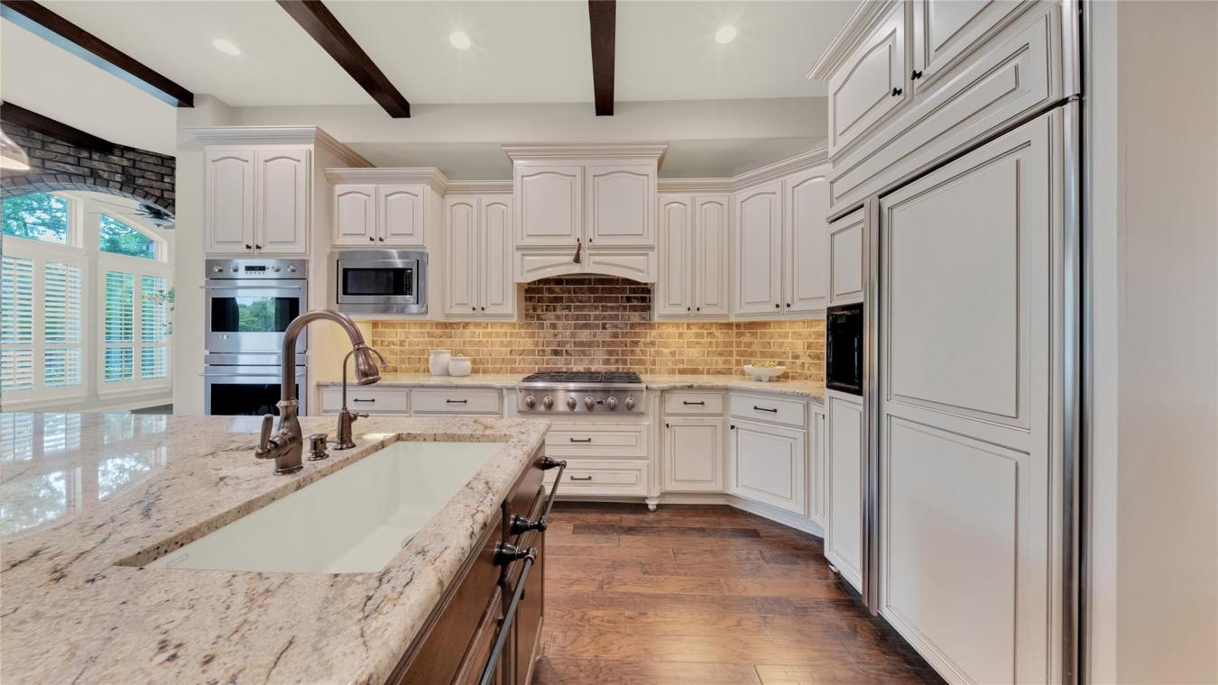 Exceptional Custom Home on 3.69 Acres of Private, Park-like Beauty! 5 bedrooms (one used as an exercise studio), 4 en-suite baths, a powder room, and a charming upstairs playroom! Rich Brazilian cherry floors span the main level with a refined study and formal living room w/soaring ceilings, natural light, built-ins, and remote-controlled blinds. Gourmet kitchen with custom cabinetry, quartz counters, 48-inch 6-burner Dacor gas cooktop, double ovens, decorative hood, 2 sinks, large island, warming drawer, coffee bar, new ice maker, and walk-in pantry. Opens to a cozy hearth room with built-ins and an exposed brick fireplace. Luxurious primary suite with dual closets, soaking tub, and double vanities. Second bedroom down. The mudroom and friendship entry lead to the gated garden courtyard. The sunroom overlooks the patio and expansive grounds. Generator, new roof, storage building, and 3-car garage with floored attic. Truly one of a kind!