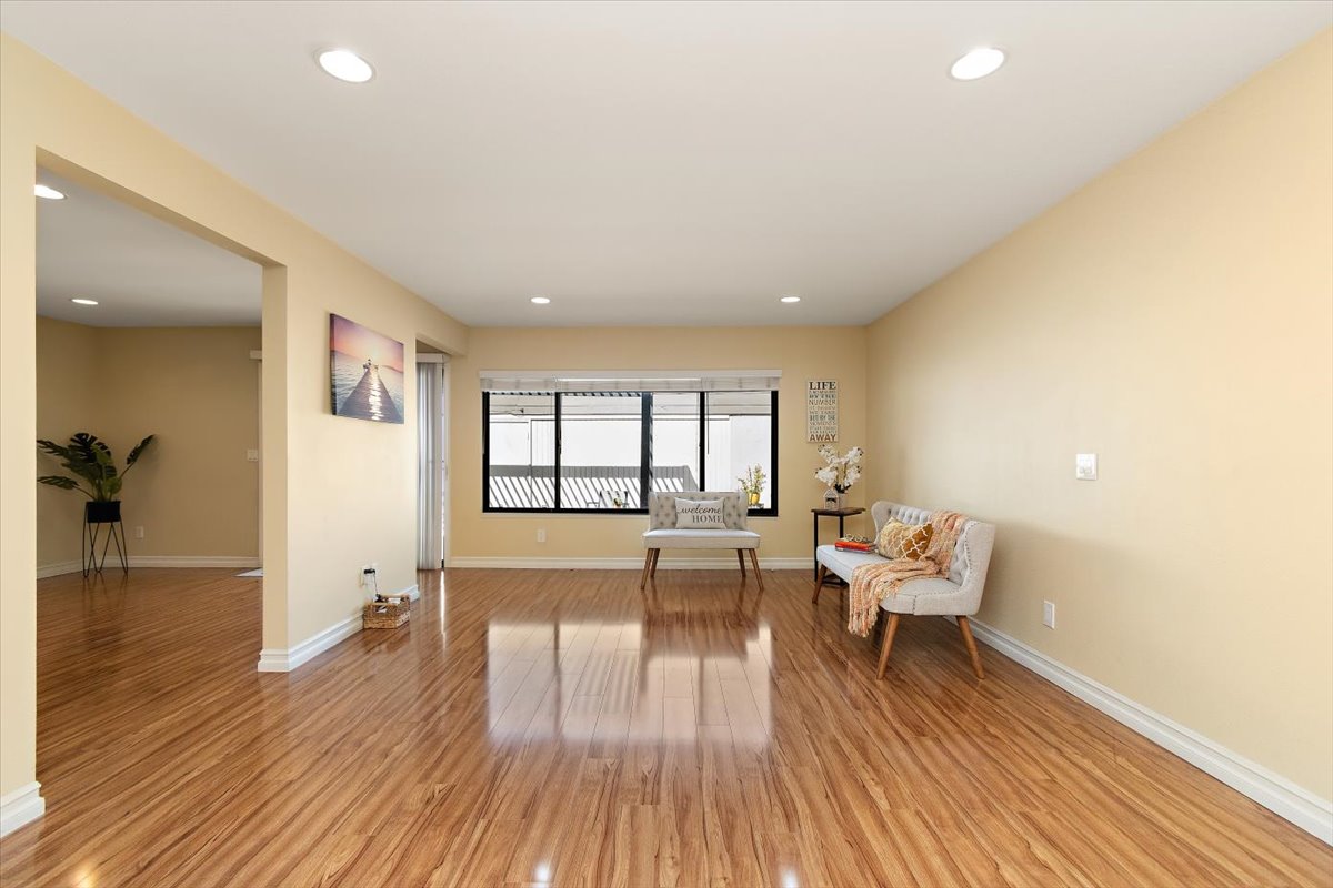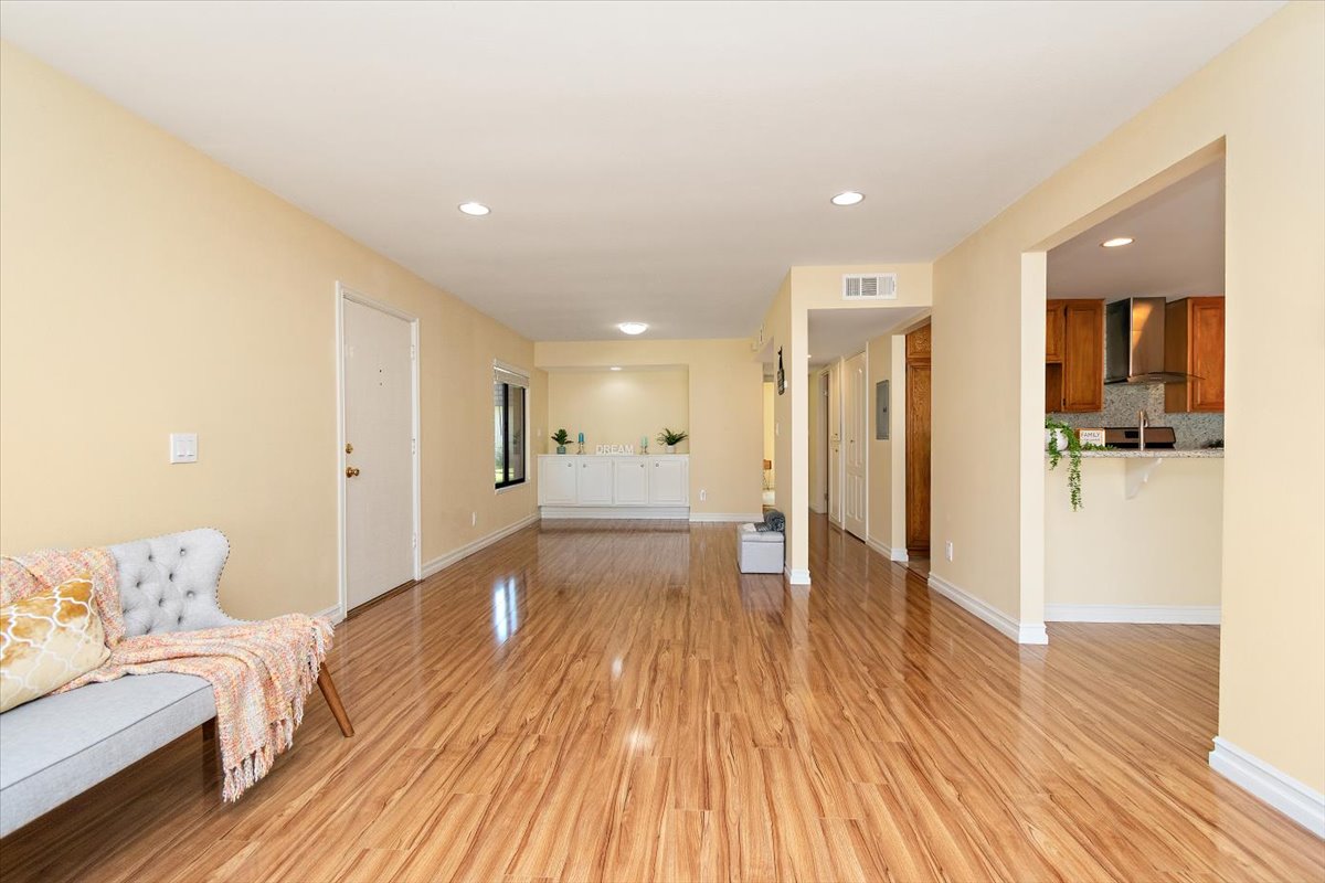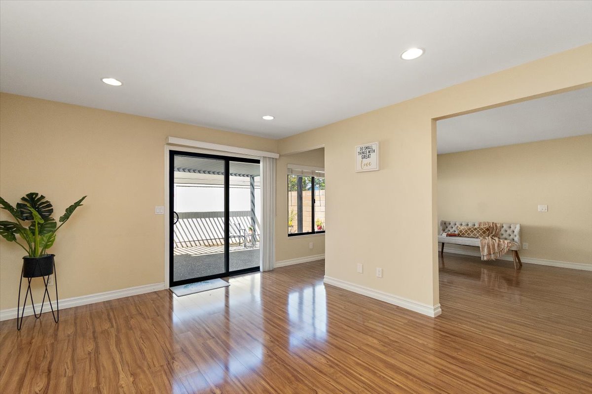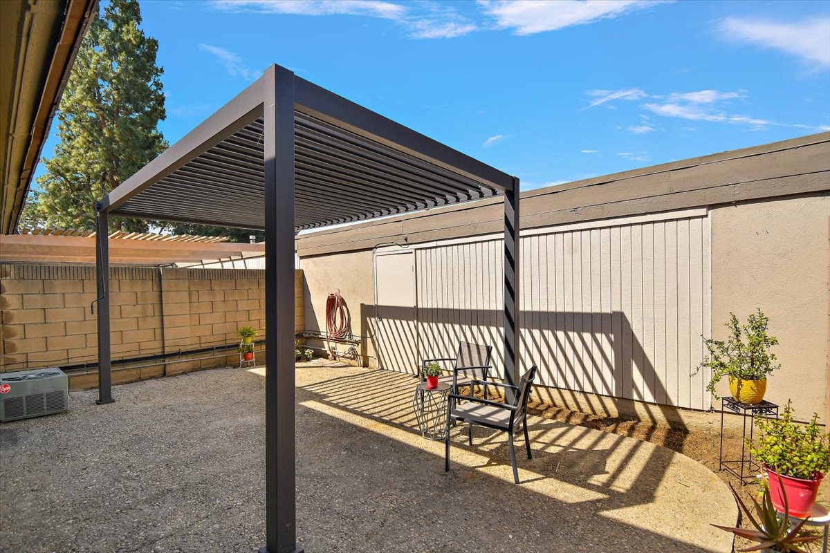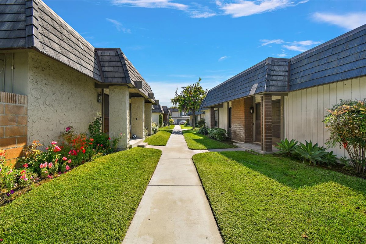 Honey…this is the one! Tucked gently within the beloved Tiburon community, this highly sought after single-level end-unit townhome feels like a quiet story waiting to be lived. Set on a premium lot with only one shared wall, it offers a sense of privacy that is both rare and comforting. Just steps from the sparkling pool and surrounded by extra reserved resident parking, convenience meets serenity at every turn. A detached two-car garage and an additional reserved space by the front door welcome you home with ease. Bathed in natural light, the home unfolds in an inviting, flowing layout where each space gently blends into the next. A thoughtfully reimagined front bedroom now lives as a graceful den—its built-in counter and cabinetry blending seamlessly into the living space, creating an airy, versatile setting-perfectly suited for a home office, reading retreat, or those quiet mornings or lively gatherings. Warm gleaming wood flooring flows effortlessly through the living and dining areas, hallway, and den, tying each space together with elegance. The refined kitchen invites connection, adorned with granite countertops, a raised breakfast bar, stainless steel appliances, and generous cabinetry. It opens naturally to a flexible dining or family area, where conversations linger and moments gather, all extending toward the private backyard beyond. Both bathrooms have been beautifully updated with granite vanities, custom cabinetry, designer mirrors, and tasteful tile finishes. Each bedroom is filled with soft natural light and tranquil views of lush greenbelts, while the primary suite offers a charming window seat—an intimate corner for reflection and rest. Beyond the walls, the backyard becomes a sanctuary. An expansive paved patio sits beneath a modern louvered pergola, its adjustable cover allowing sunlight or shade to dance as you wish—perfect for year-round enjoyment, from golden afternoons to gentle rainy evenings. Other exceptional upgrades include a new 200-amp electrical panel, dual-pane windows, recessed lighting, crown molding, baseboards, and termite clearance—details that quietly elevate everyday living. All within the award-winning ABC Unified School District and moments from shopping, dining, and freeway access, the Tiburon community offers two pools, a spa, clubhouse, playground, and peaceful greenbelt paths. With so much to give and so much to feel…this isn’t just a home—it’s where your next chapter begins. MAKE THIS AMAZING HOME YOURS TODAY!