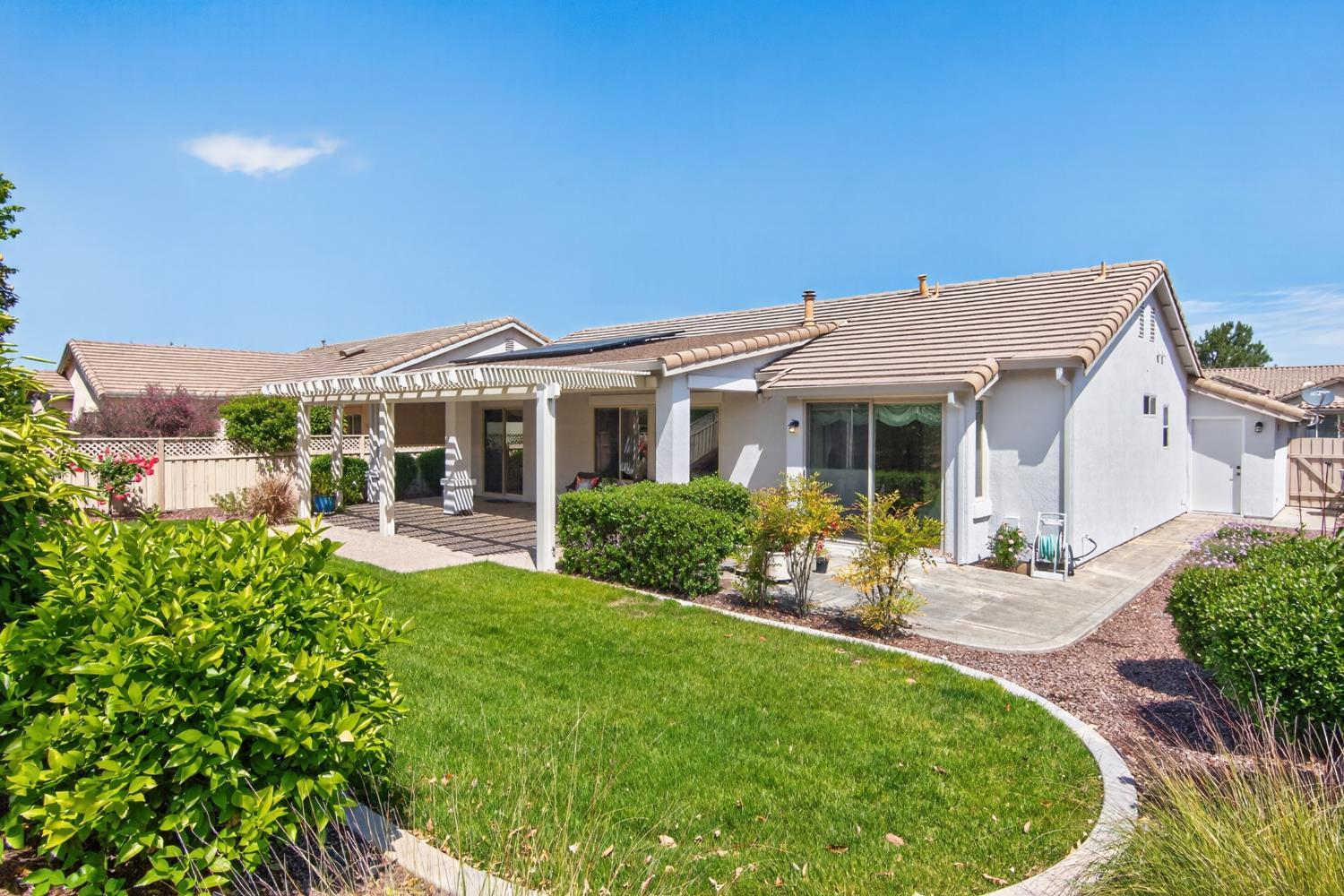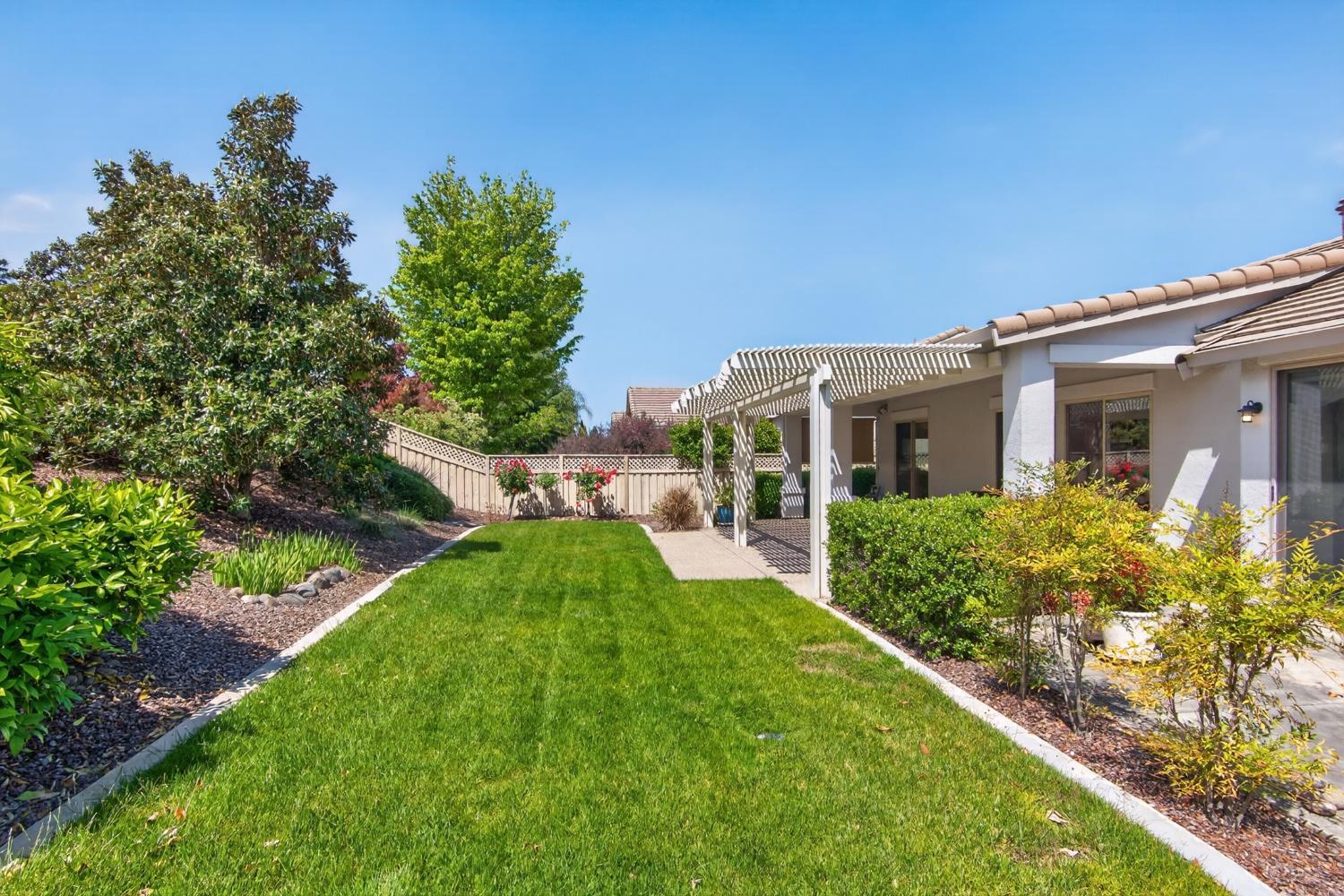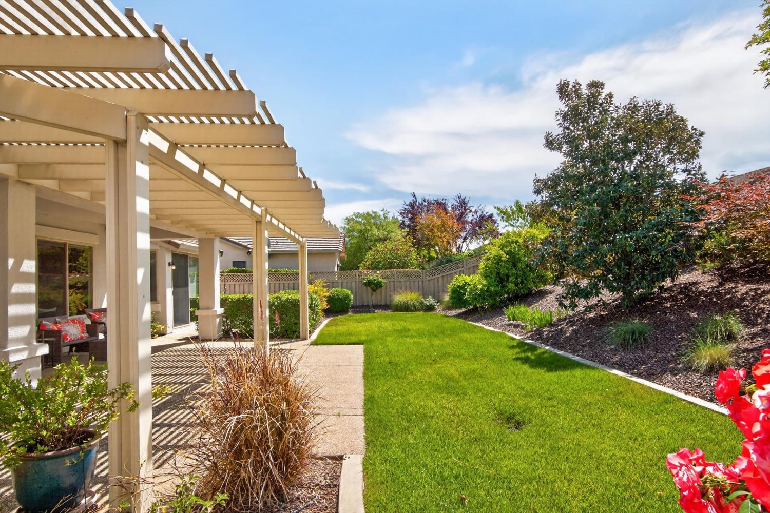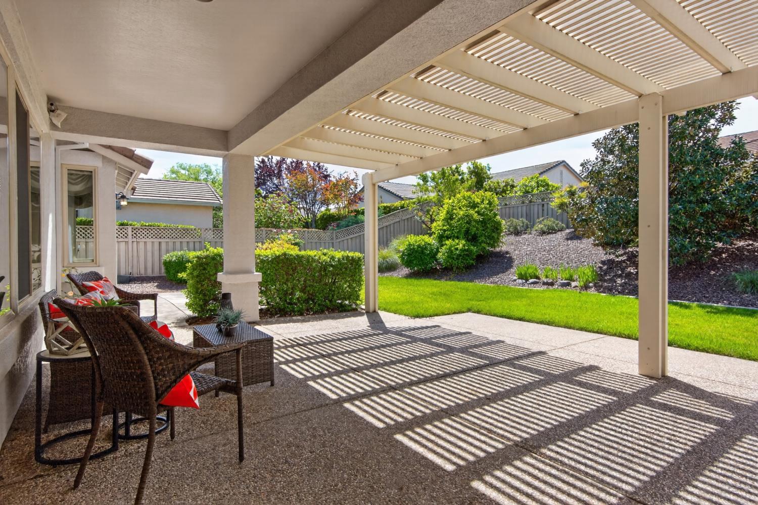 This beautifully maintained home offers a spacious open floor plan designed for comfortable living and effortless entertaining. The inviting living area features custom built-in shelving surrounding the fireplace, creating a warm and functional focal point. The kitchen is equipped with sleek black stainless steel appliances and flows seamlessly into the main living spaces, making it ideal for gatherings. A versatile den includes built-in cabinets and desk--perfect for a home office, study, or hobby space. Step outside to a large patio complete with shade structure providing the perfect setting for outdoor dining and entertaining. The side yard showcases charming gravevines while the backyard boasts mature lemon, lime, and mandarin trees--your own private orchard. Back inside the primary suite features a raised dual vanity adding both style and convenience. Additional highlights include owned solar for energy efficiency and long-term savings. A perfect bland of comfort, functionality and outdoor enjoyment--this home is ready to impress.
