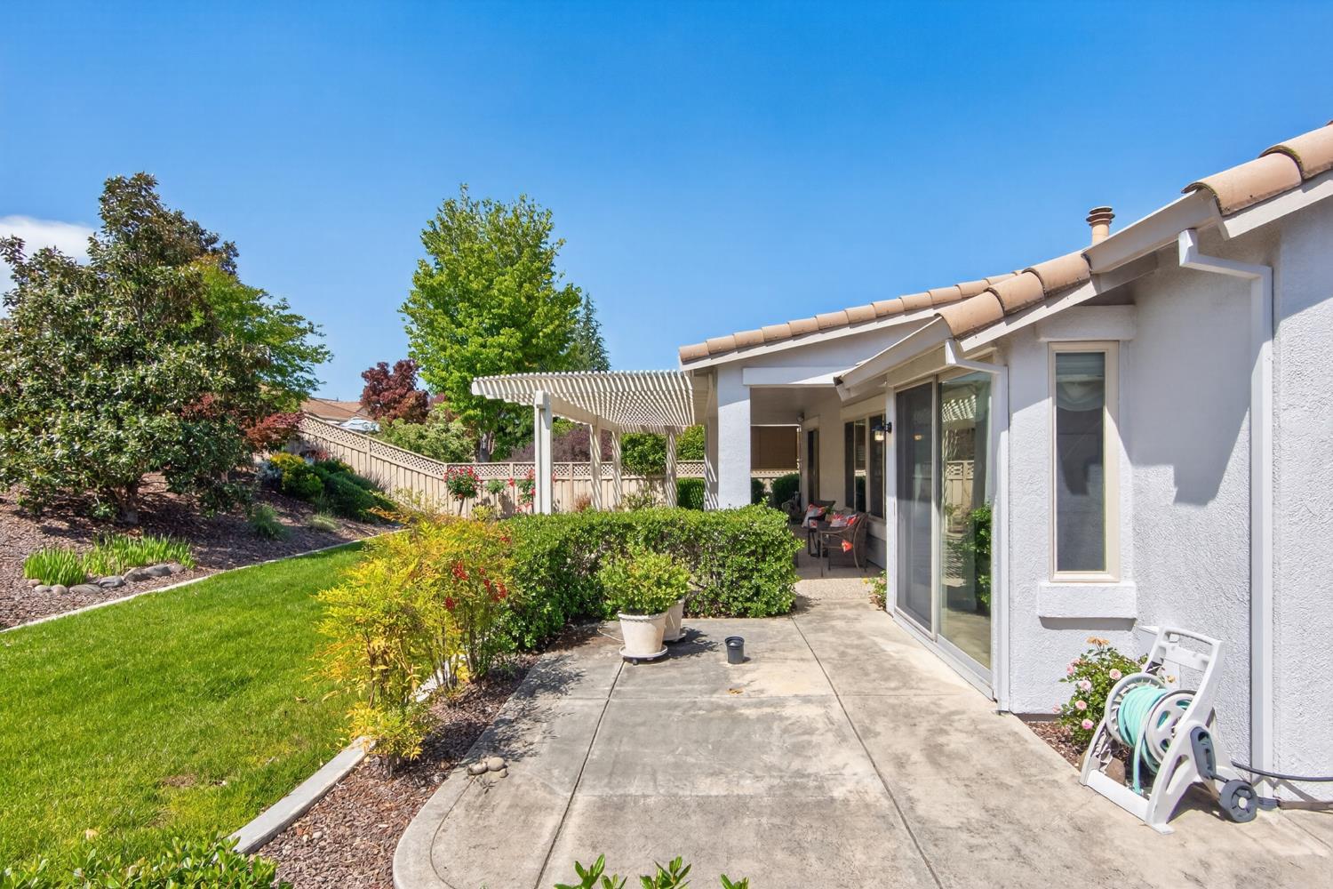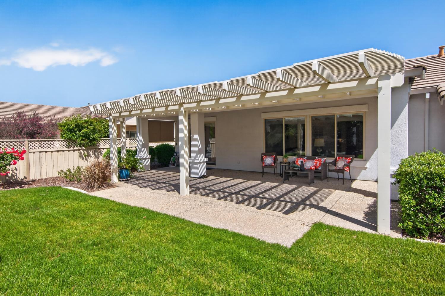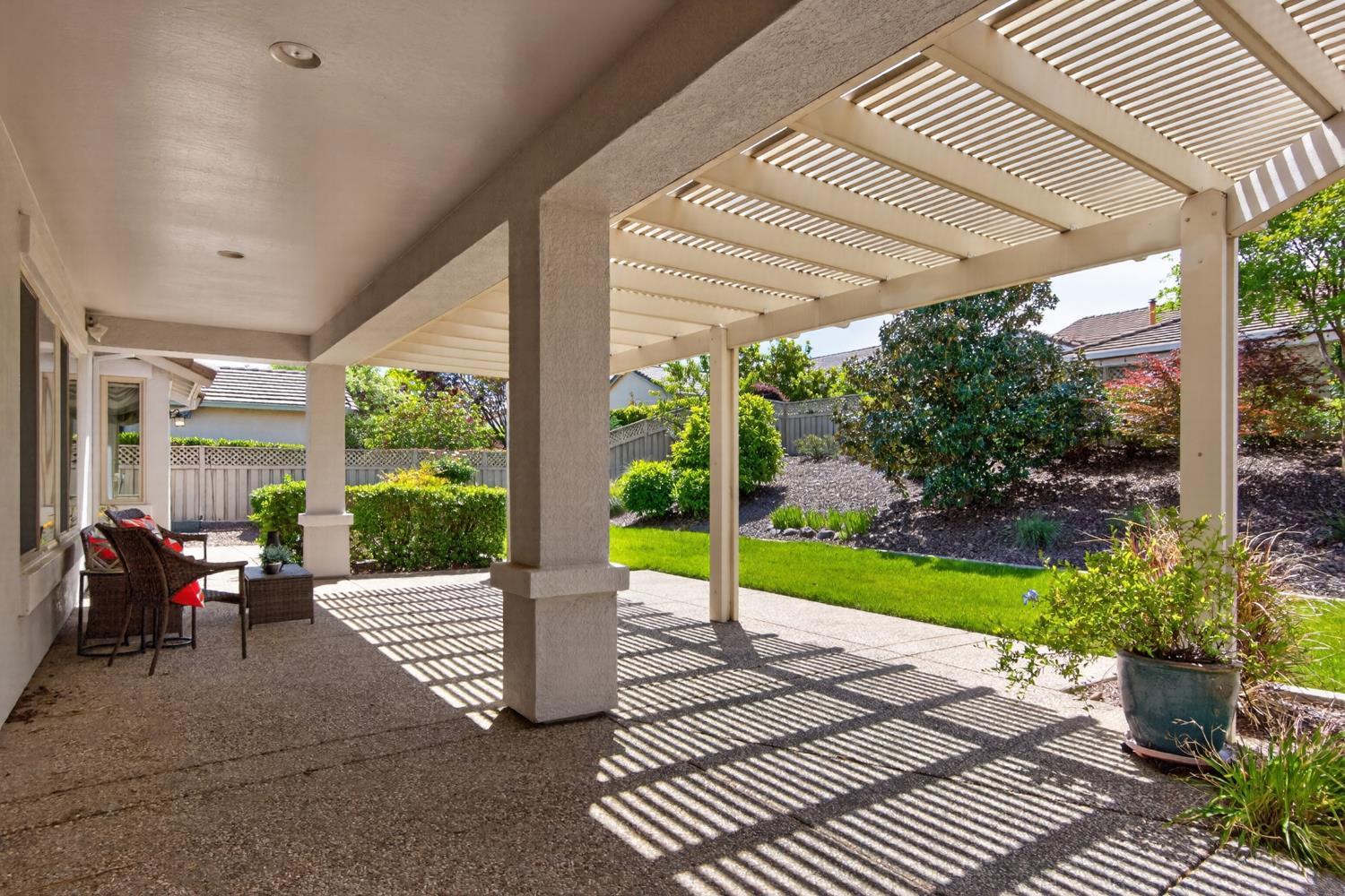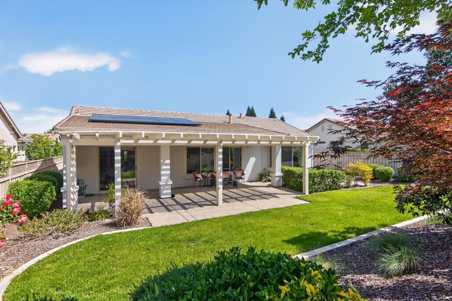 This beautifully maintained home offers a spacious open floor plan designed for comfortable living and effortless entertaining. The inviting living area features custom built-in shelving surrounding the fireplace, creating a warm and functional focal point. The kitchen is equipped with sleek black stainless steel appliances and flows seamlessly into the main living spaces, making it ideal for gatherings. A versatile den includes built-in cabinets and desk--perfect for a home office, study, or hobby space. Step outside to a large patio complete with shade structure providing the perfect setting for outdoor dining and entertaining. The side yard showcases charming gravevines while the backyard boasts mature lemon, lime, and mandarin trees--your own private orchard. Back inside the primary suite features a raised dual vanity adding both style and convenience. Additional highlights include owned solar for energy efficiency and long-term savings. A perfect bland of comfort, functionality and outdoor enjoyment--this home is ready to impress.