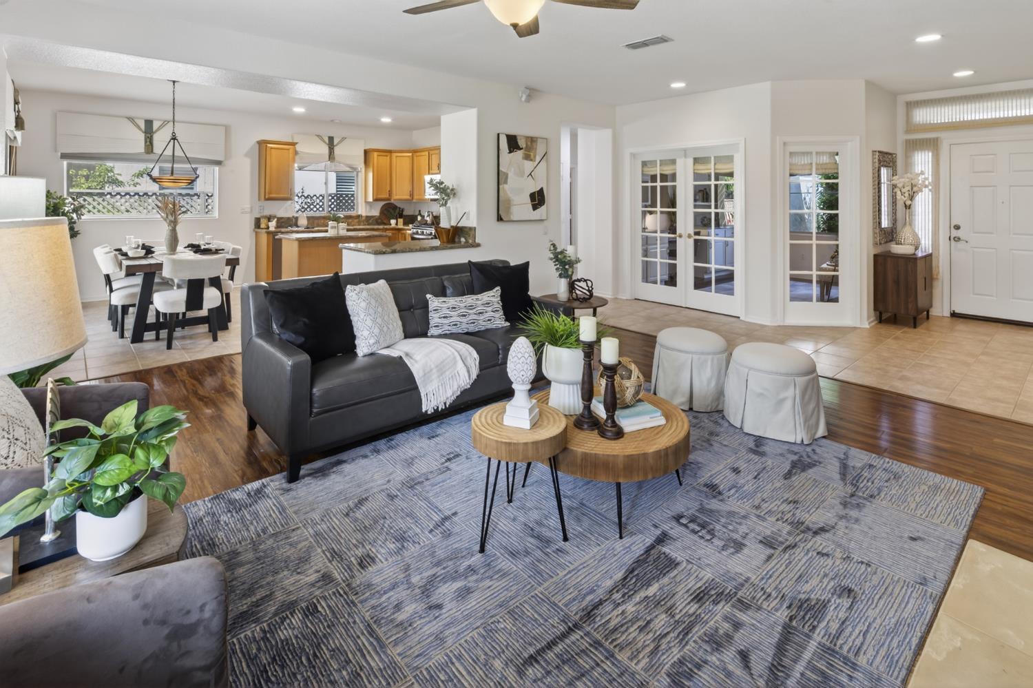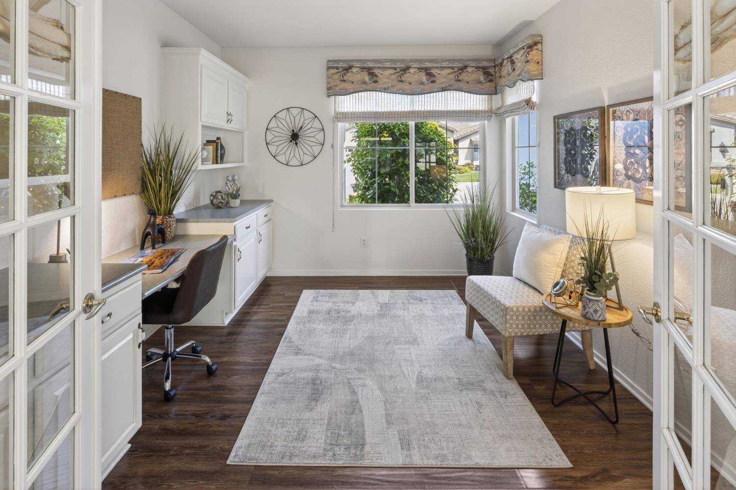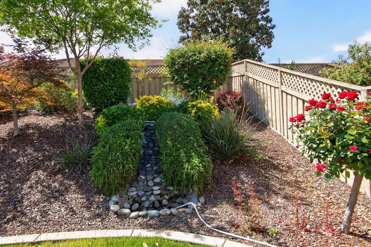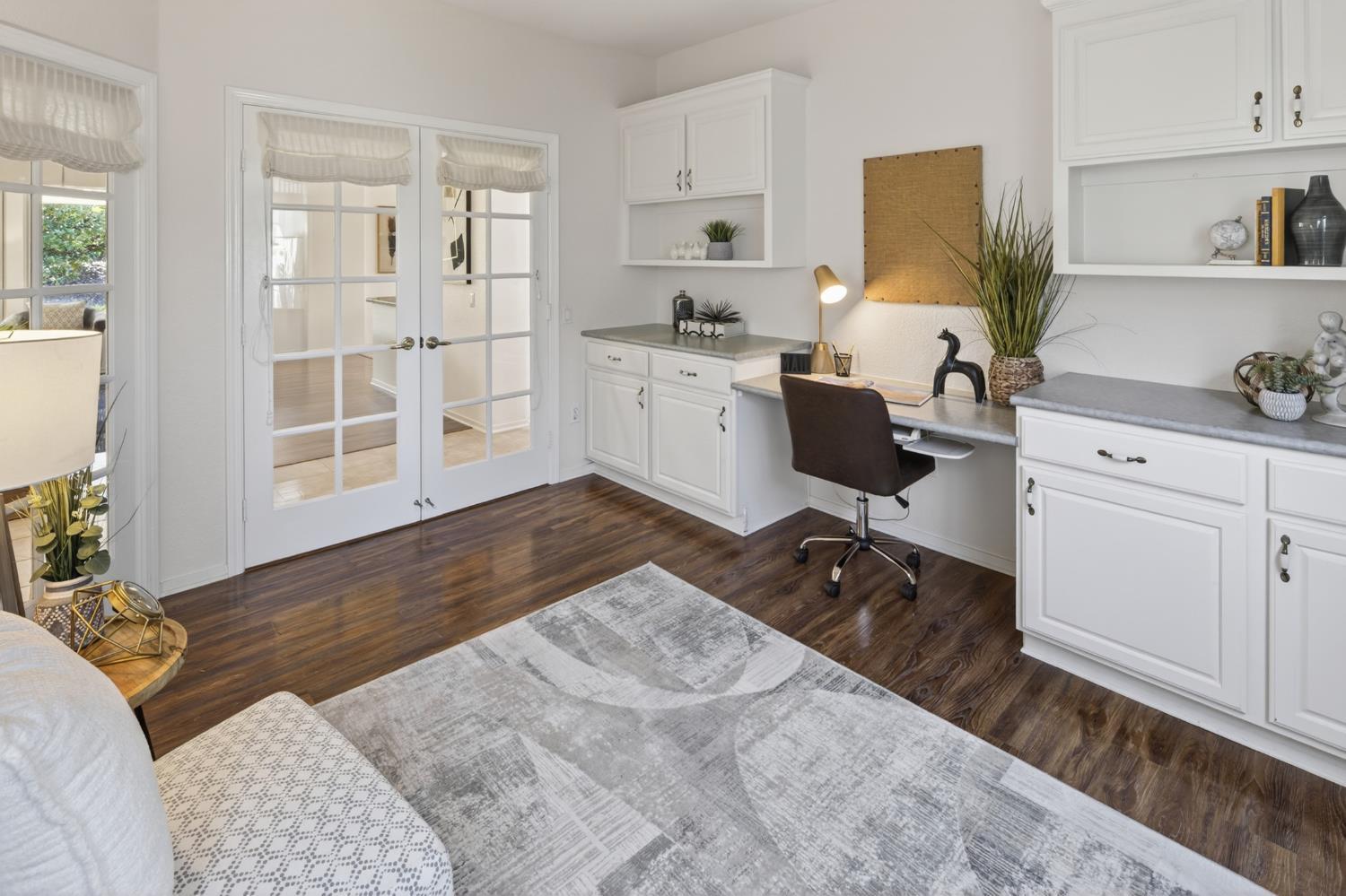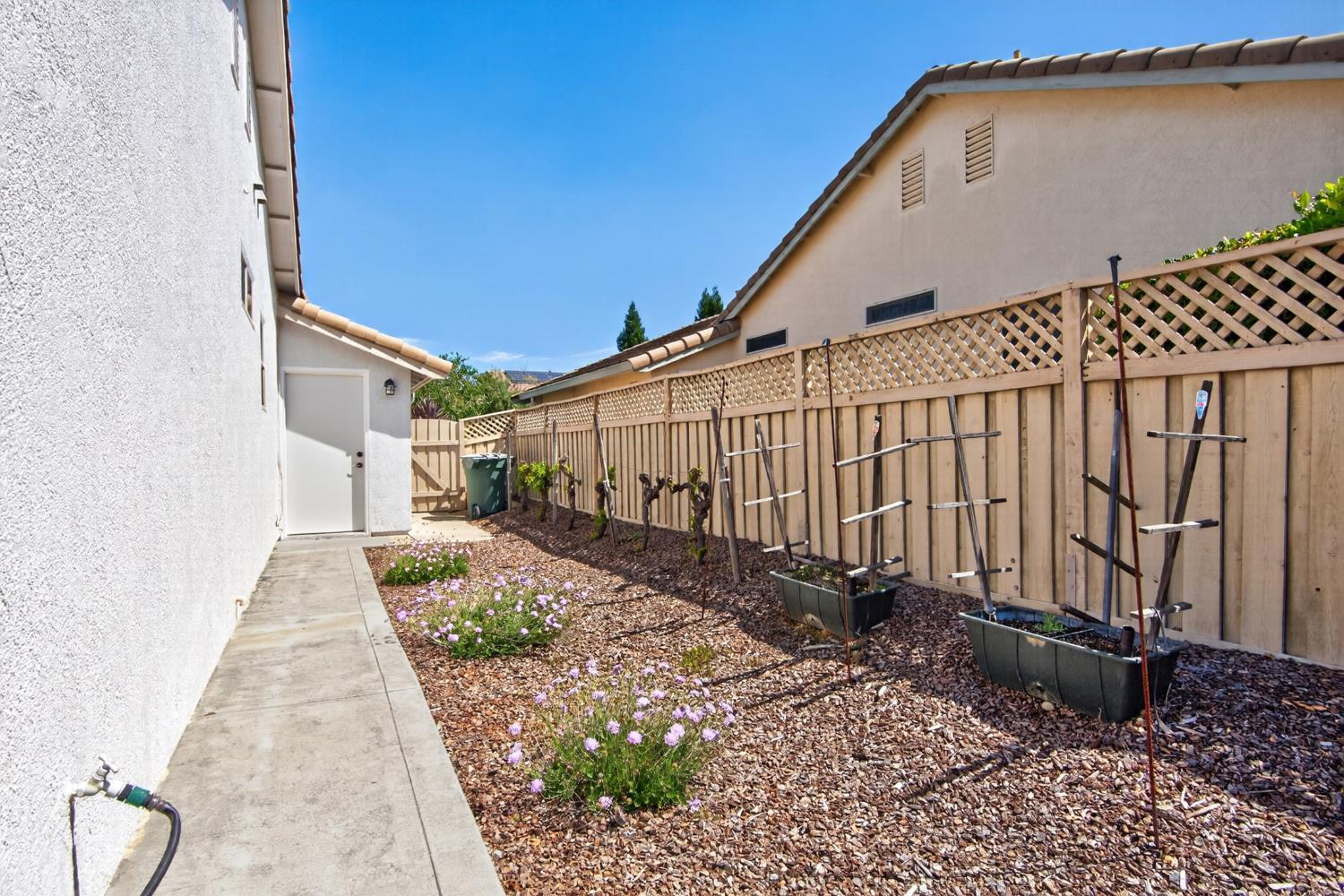 This beautifully maintained home offers a spacious open floor plan designed for comfortable living and effortless entertaining. The inviting living area features custom built-in shelving surrounding the fireplace, creating a warm and functional focal point. The kitchen is equipped with sleek black stainless steel appliances and flows seamlessly into the main living spaces, making it ideal for gatherings. A versatile den includes built-in cabinets and desk--perfect for a home office, study, or hobby space. Step outside to a large patio complete with shade structure providing the perfect setting for outdoor dining and entertaining. The side yard showcases charming gravevines while the backyard boasts mature lemon, lime, and mandarin trees--your own private orchard. Back inside the primary suite features a raised dual vanity adding both style and convenience. Additional highlights include owned solar for energy efficiency and long-term savings. A perfect bland of comfort, functionality and outdoor enjoyment--this home is ready to impress.