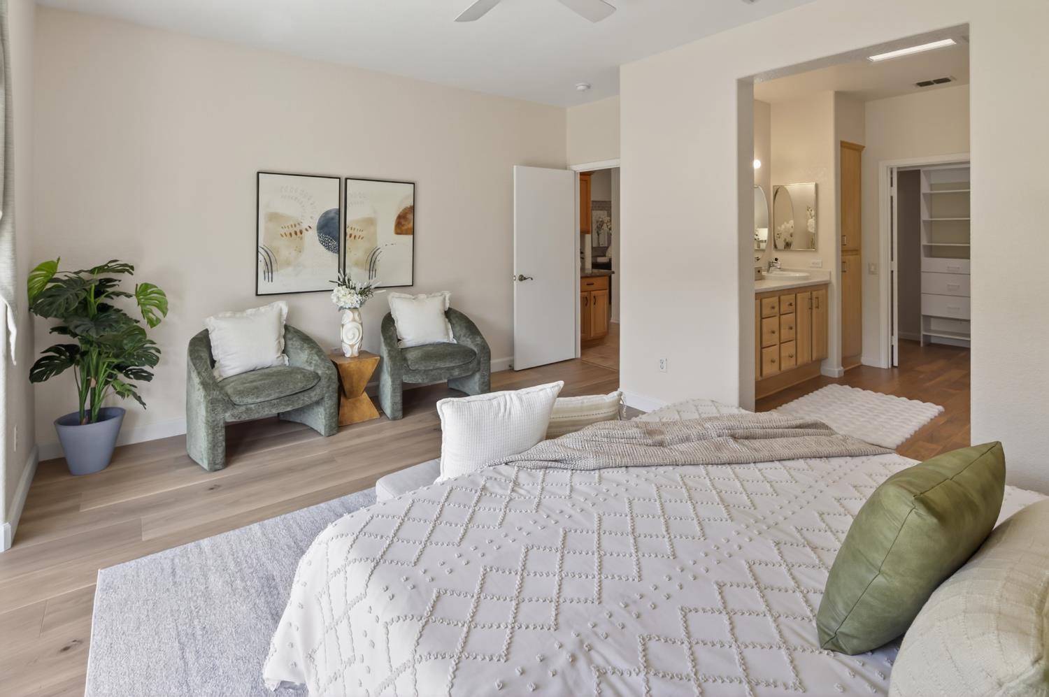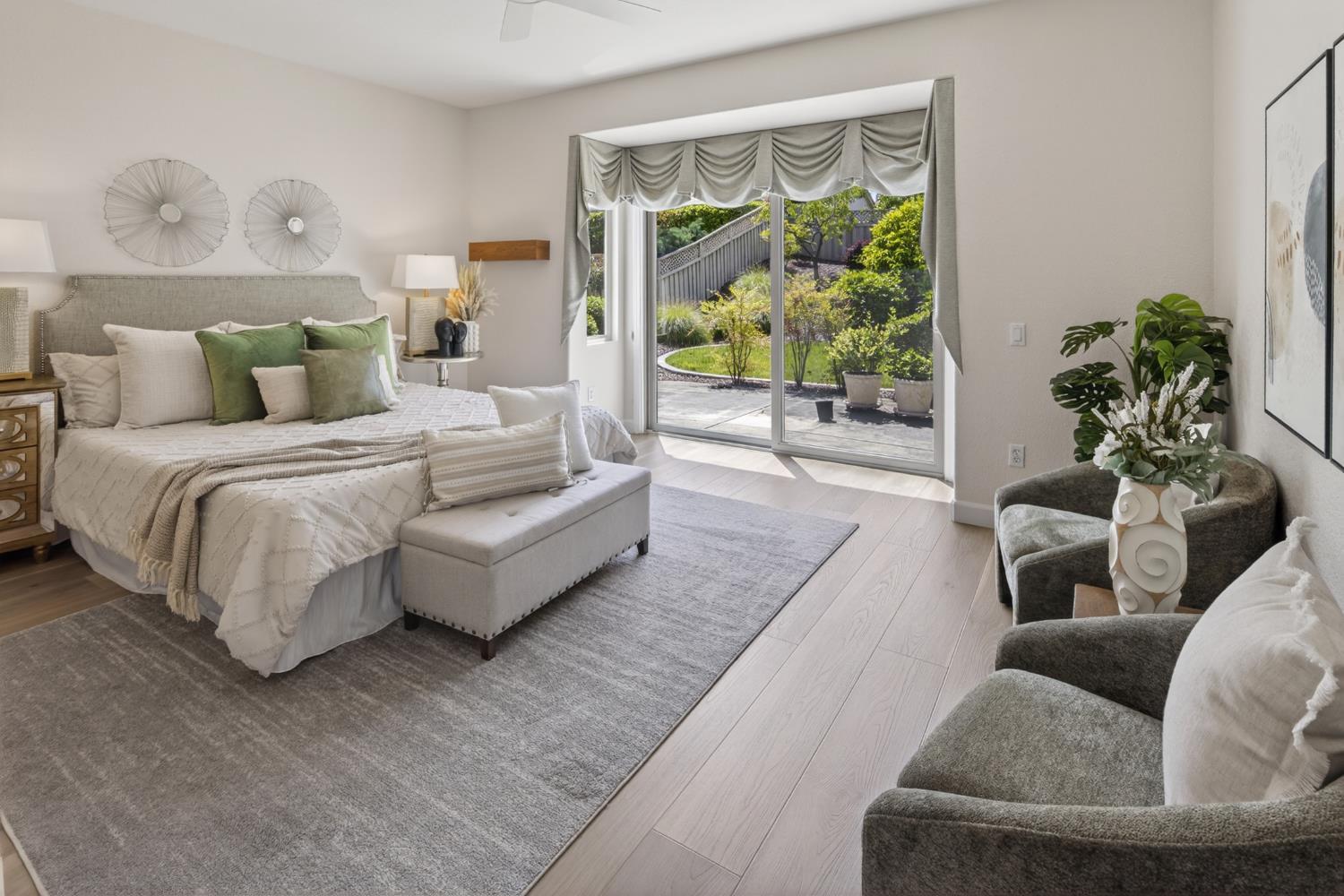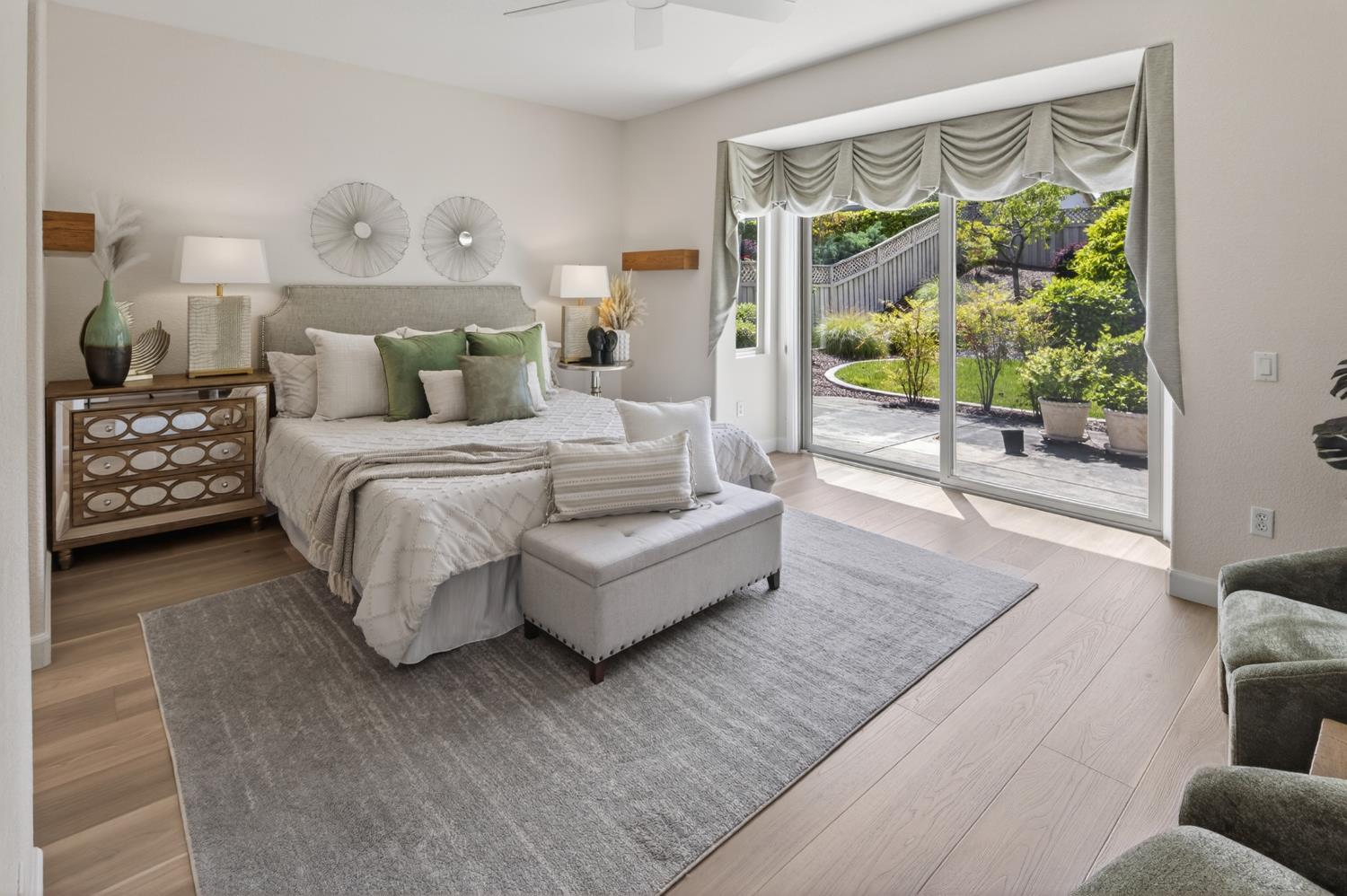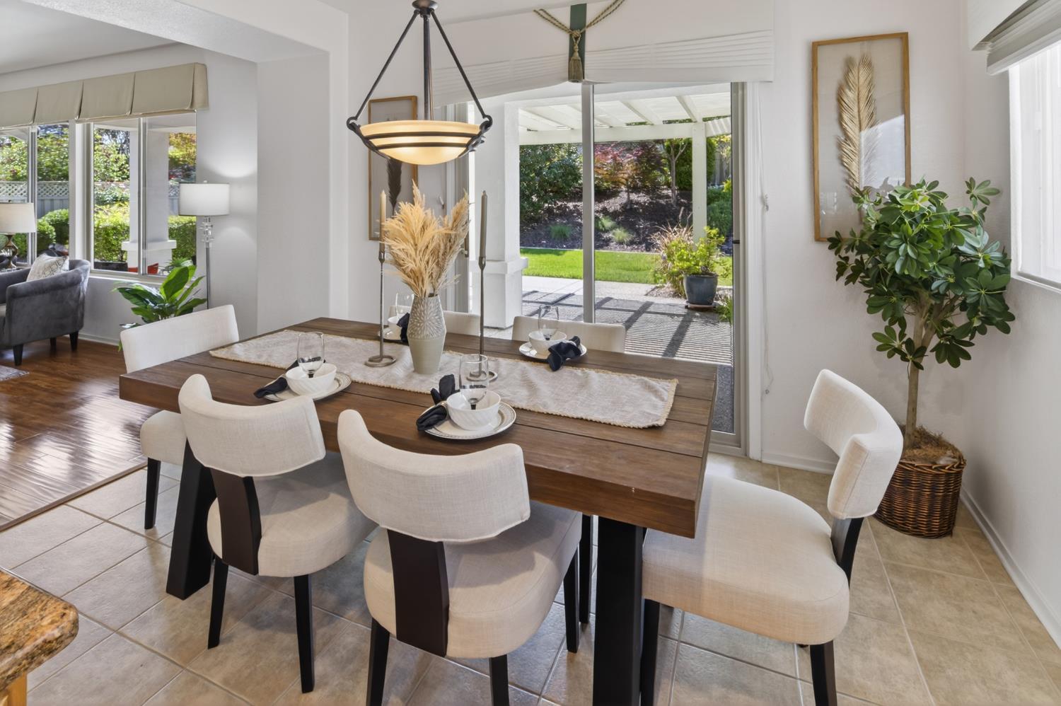 This beautifully maintained home offers a spacious open floor plan designed for comfortable living and effortless entertaining. The inviting living area features custom built-in shelving surrounding the fireplace, creating a warm and functional focal point. The kitchen is equipped with sleek black stainless steel appliances and flows seamlessly into the main living spaces, making it ideal for gatherings. A versatile den includes built-in cabinets and desk--perfect for a home office, study, or hobby space. Step outside to a large patio complete with shade structure providing the perfect setting for outdoor dining and entertaining. The side yard showcases charming gravevines while the backyard boasts mature lemon, lime, and mandarin trees--your own private orchard. Back inside the primary suite features a raised dual vanity adding both style and convenience. Additional highlights include owned solar for energy efficiency and long-term savings. A perfect bland of comfort, functionality and outdoor enjoyment--this home is ready to impress.