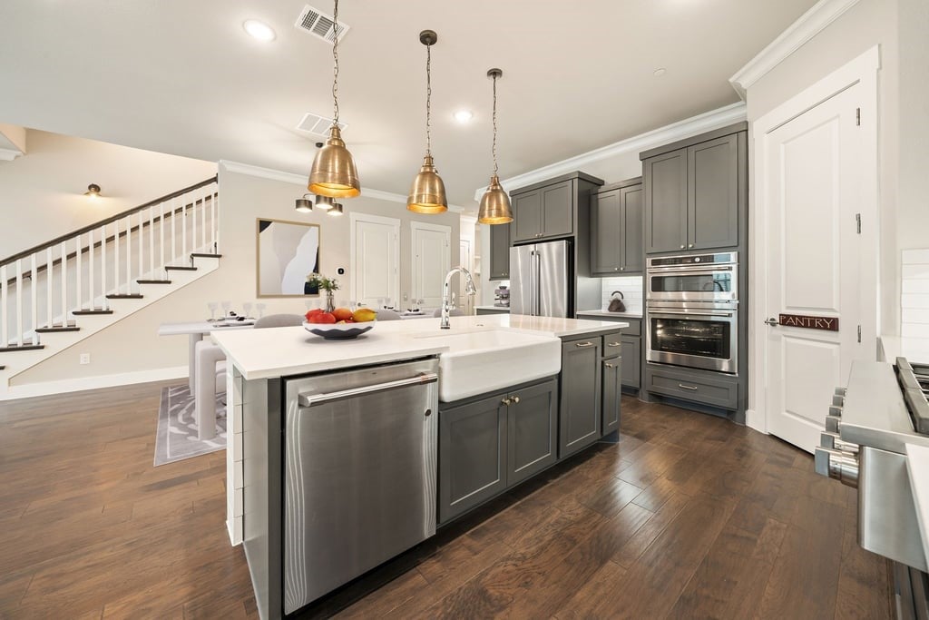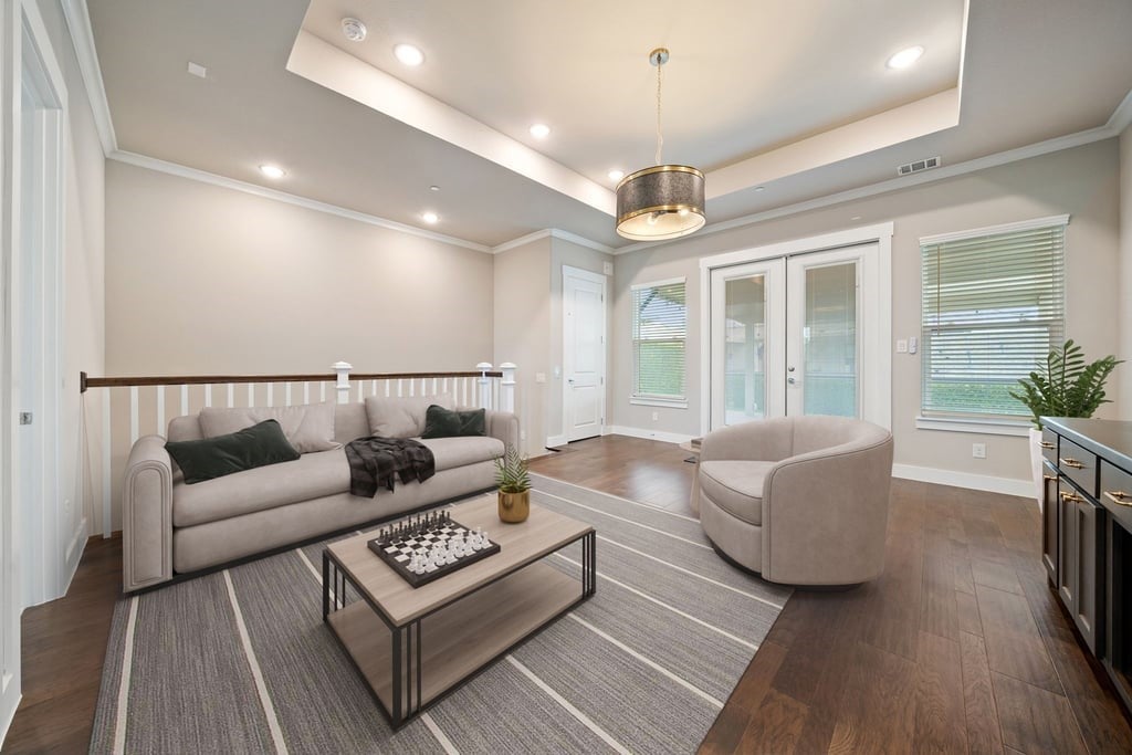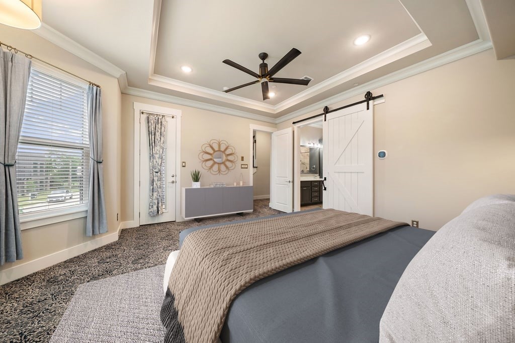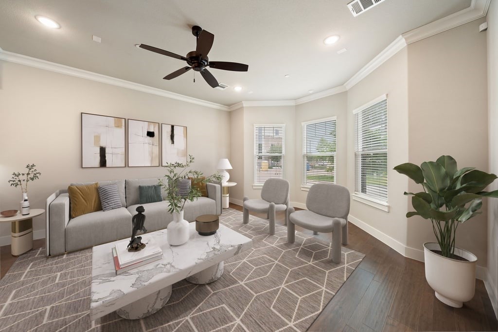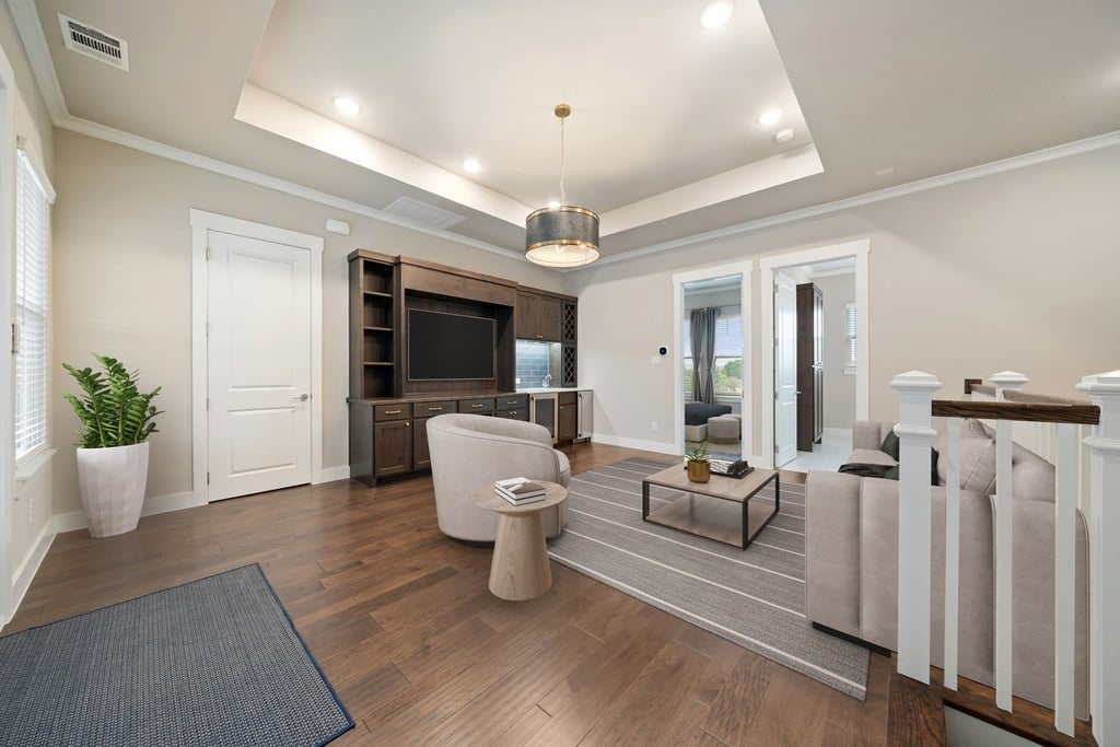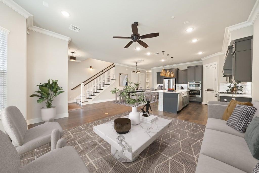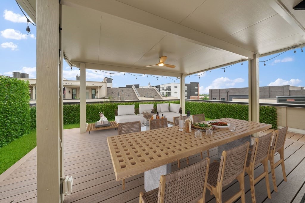 Experience elevated living in the heart of downtown Roanoke with this stunning brownstone townhome ideally positioned on a prime lot in the highly sought-after City Center community. Blending luxury finishes, thoughtful upgrades, and an unbeatable walkable location, this residence offers a true lock-and-leave lifestyle just steps from dining, nightlife, and entertainment. Inside, soaring ceilings and designer details create an upscale yet inviting atmosphere. The open-concept main living area flows into a high-end kitchen featuring stainless steel appliances, premium finishes, and the perfect setup for everyday living or entertaining guests. Custom lighting fixtures, upgraded designer carpet, and stylish barn doors add character throughout the home. The spacious second-floor primary suite is a standout retreat, complete with a large walk-in closet, dual vanities, and an oversized spa-inspired shower. Just outside, enjoy a private covered patio—an ideal place for morning coffee or evening relaxation. Upstairs, the third level offers flexible living space highlighted by a built-in wet bar with wine cooler, perfect for hosting or creating a private lounge area. Step out to the rooftop deck and covered patio where you’ll enjoy impressive views and an ideal setting for entertaining under the Texas sky. Additional highlights include a private elevator for convenient access to all levels, a two-car garage with a hookup for a portable generator, and low-maintenance townhome living. Located in vibrant downtown Roanoke, you’ll love the live-work-play atmosphere with restaurants, bars, and local events just outside your door, while remaining only minutes from major highways and Dallas-Fort Worth International Airport. This is a rare opportunity to own one of Roanoke’s premier luxury townhomes.