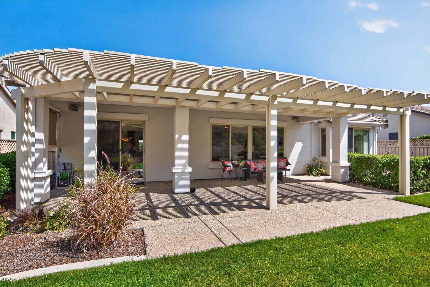 Turnkey home with sparkling rockscape pool and waterfall feature will be perfect for this summer and all your summers! This beauty offers a spacious floorplan for living for multi-family living combined with single story simplicity. The great room is one of the interior main features. Lots of natural sunlight graces this home and its high vaulted ceilings make it feel wide open. Enjoy a comfortable front living room with space for a pool table and an entertaining area to watch the big game. With an open floor plan, the great room is open from the kitchen to the family room. The fireplace in the family room is great for cozy nights in the winter and for adding ambience for your family meals. The kitchen offers a breakfast bar for up to six so let the cooking begin. The backyard has two sides and one of them is a greenbelt for family pets, games, or an area for kids. The second side has a beautiful swimming pool with a kids space for wading and an umbrella. The new alumawood patio cover is over the BBQ island and is perfect for shading your guests whether they are at the bar or dining out on the patio. The permanent shed nearby can house all of your pool toys and give you a place to store your bocce ball and other yard games. There is also an outdoor firepit for singing songs and making smores and memories! This is the perfect house for mulit-generational living so bring the in-laws and enjoy the resort style life!