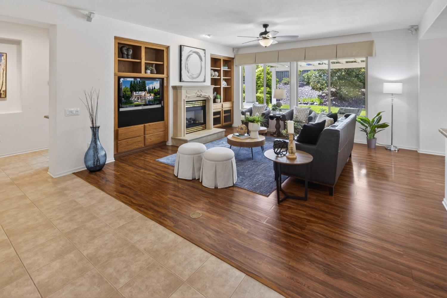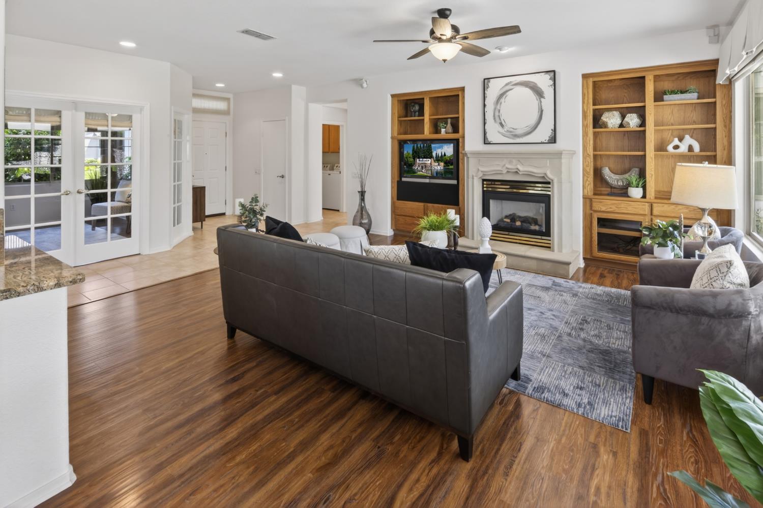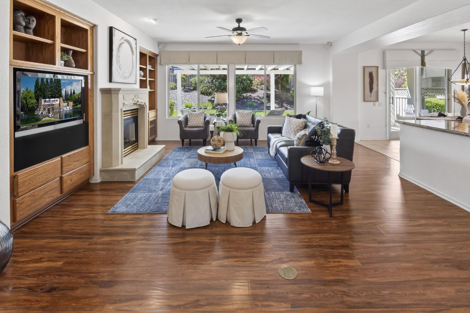 This beautifully maintained home offers a spacious open floor plan designed for comfortable living and effortless entertaining. The inviting living area features custom built-in shelving surrounding the fireplace, creating a warm and functional focal point.