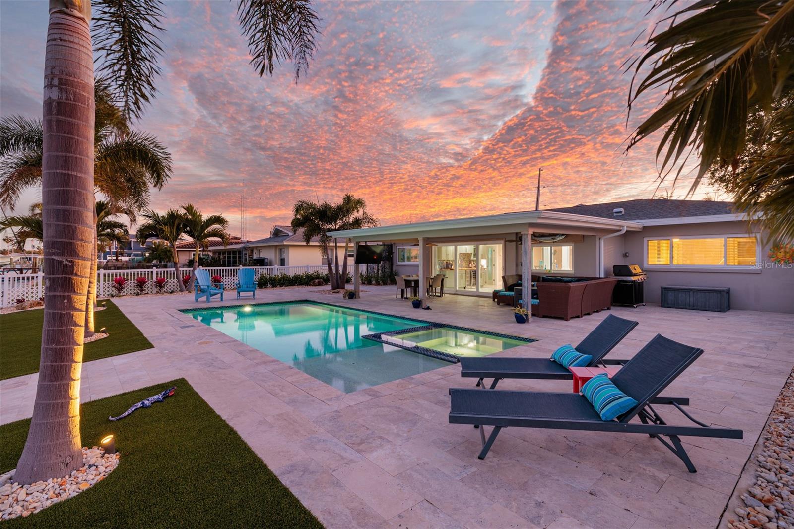 82 ft. of WATERFRONT SAILBOAT WATER. CLOSE TO THE BEACH on a corner on a quiet Cul-de Sac. Experience luxury living and stunning water views in this completely renovated 3 bedroom, 3 bathroom waterfront oasis. Every detail has been thoughtfully designed and upgraded from top to bottom, delivering a move-in ready home that blends modern elegance with effortless coastal charm. From the moment you arrive, you’ll be drawn in by the pristine curb appeal. Step inside to an open-concept living area where sun-drenched interiors and clean lines set the tone. The living room centers around a panoramic sliding glass door wall that frames glistening water vistas.The adjacent dining space comfortably seats family and guests, with designer lighting and water-inspired accents that create a coastal-modern atmosphere.The chef’s kitchen is a masterpiece of form and function, featuring top-tier materials and stainless steel luxury appliances. Quartz countertops, a substantial 10 ft island, with seating and custom cabinetry provide ample storage and prep space. A sleek backsplash, premium faucet, and custom lighting elevate everyday cooking into an experience.Retreat to the primary suite, a serene sanctuary overlooking the water and glass sliding doors opening to the pavered deck. The spa-inspired en-suite is appointed with a glass enclosed shower, dual vanities with gorgeous lighting, and designer hardware. Two additional bedrooms each offer generous closets and easy access to full baths, one of which doubles as a stylish guest bath with premium finishes. Large walk-in closet. No detail has been overlooked in the renovation. The home features a tile roof, updated electrical and plumbing, New Hvac, New water heater, Hurricane windows and doors, including sliding glass doors leading to the inviting pavered deck by the water.Luxury finishes include wide-plank LVP floors, LED recessed lighting.An entertainer’s dream, the backyard is a waterfront haven with direct access to the water, a stone-paved terrace, and a low-maintenance landscaped lawn. Composite dock invites boating, kayaking, paddle boarding, fishing etc, newer seawall provides peace of mind. Enjoy your morning coffee or evening cocktail watching the sun set over the Gulf. This tropical oasis enables seamless outdoor gatherings for Family and Friends.Additional features include a two-car garage and ample driveway parking. The property is ideally positioned to enjoy an easy stroll to the sugary white sands of St Pete Beach nearby dining, boutique shopping while offering quick access to major highways for an easy commutes.This completely renovated waterfront home embodies luxury, comfort, and the essence of waterfront living. It’s not just a home; it’s a lifestyle upgrade—ready for new owners to move in, unpack, and start living the dream. Schedule your private showing today to experience the refined craftsmanship and the spectacular water views that set this property apart.