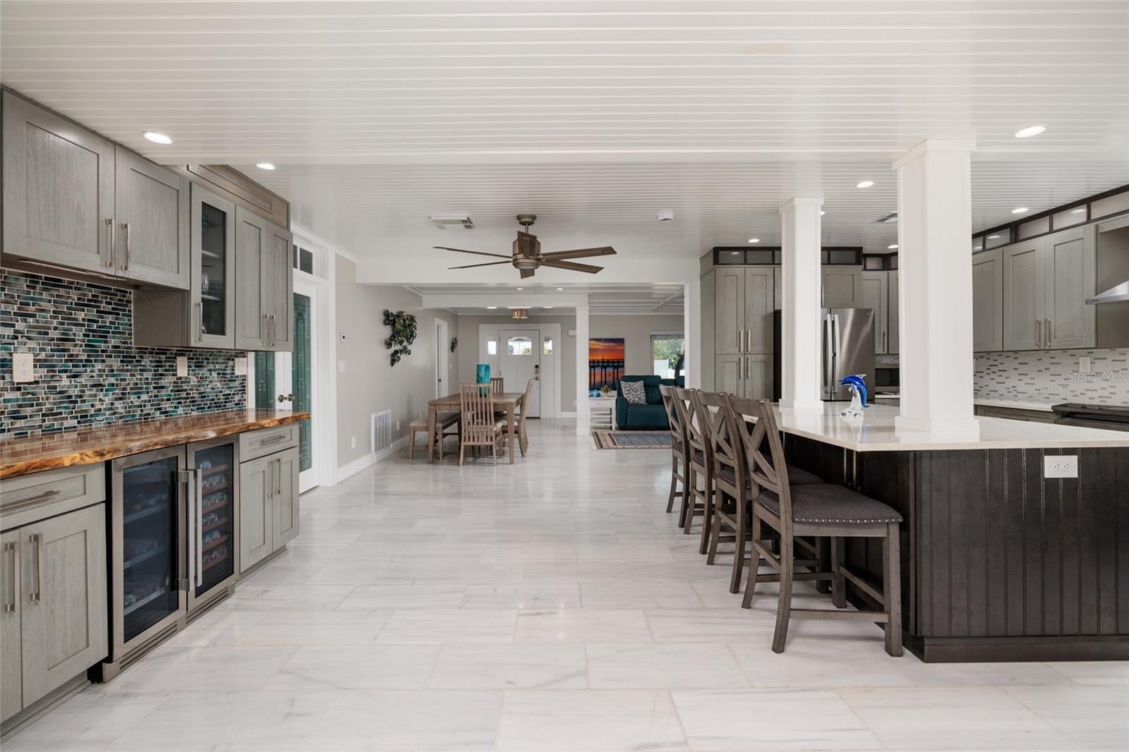 Positioned along a wide, deep-water canal in Treasure Island, this thoughtfully redesigned coastal residence blends architectural intention with everyday livability. Soaring 12-foot ceilings and expansive impact rated picture windows fill the home with natural light, while a welcoming foyer frames tranquil water views from the moment you enter.
