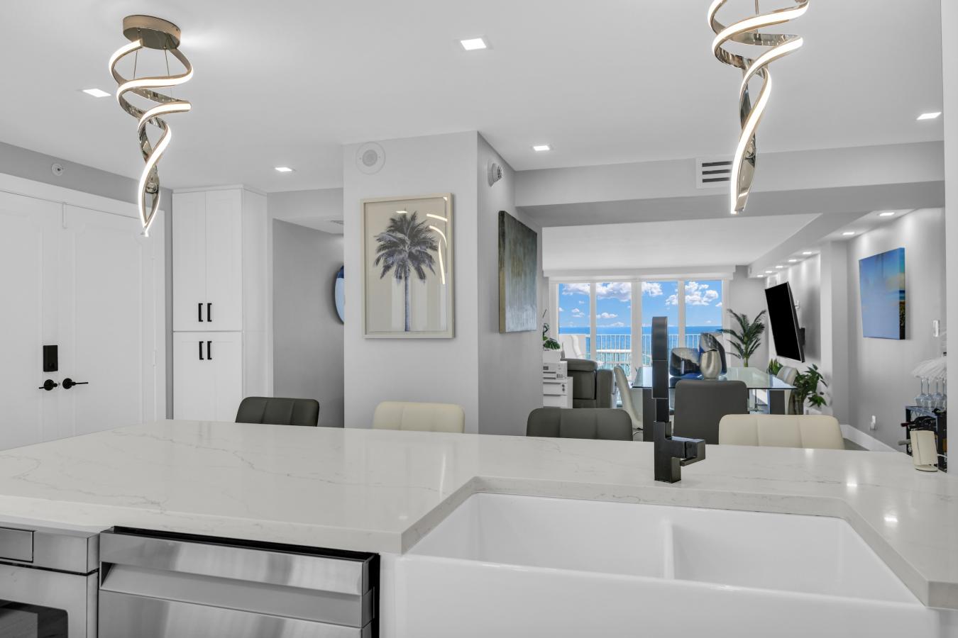 Spectacularly Renovated Oceanfront Condo with Panoramic Views. This beautifully renovated corner residence spans 1,786 square feet and offers sweeping views of the Atlantic Ocean, Lake Boca, Intracoastal, and city skyline from every room. The open living & dining areas flow seamlessly with water views. The kitchen features white soft-close cabinetry, quartz countertops, and a clean, modern design.