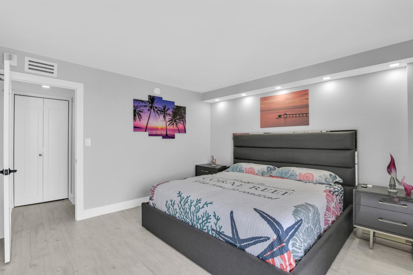 Spectacularly Renovated Oceanfront Condo with Panoramic Views. This beautifully renovated corner residence spans 1,786 square feet and offers sweeping views of the Atlantic Ocean, Lake Boca, Intracoastal, and city skyline from every room. The open living & dining areas flow seamlessly with water views. The kitchen features white soft-close cabinetry, quartz countertops, and a clean, modern design. Additional features include a separate laundry room, recessed lighting, custom shelving, a service entrance, and large ceramic tile flooring throughout. Sabal Shores has completed a full exterior renovation. Residents enjoy 24/7 upper and lower-level concierge, beachfront lounge chairs, social & fitness rooms, a library, heated pool, BBQ area, TWO garage parking spaces, and extra storage.
